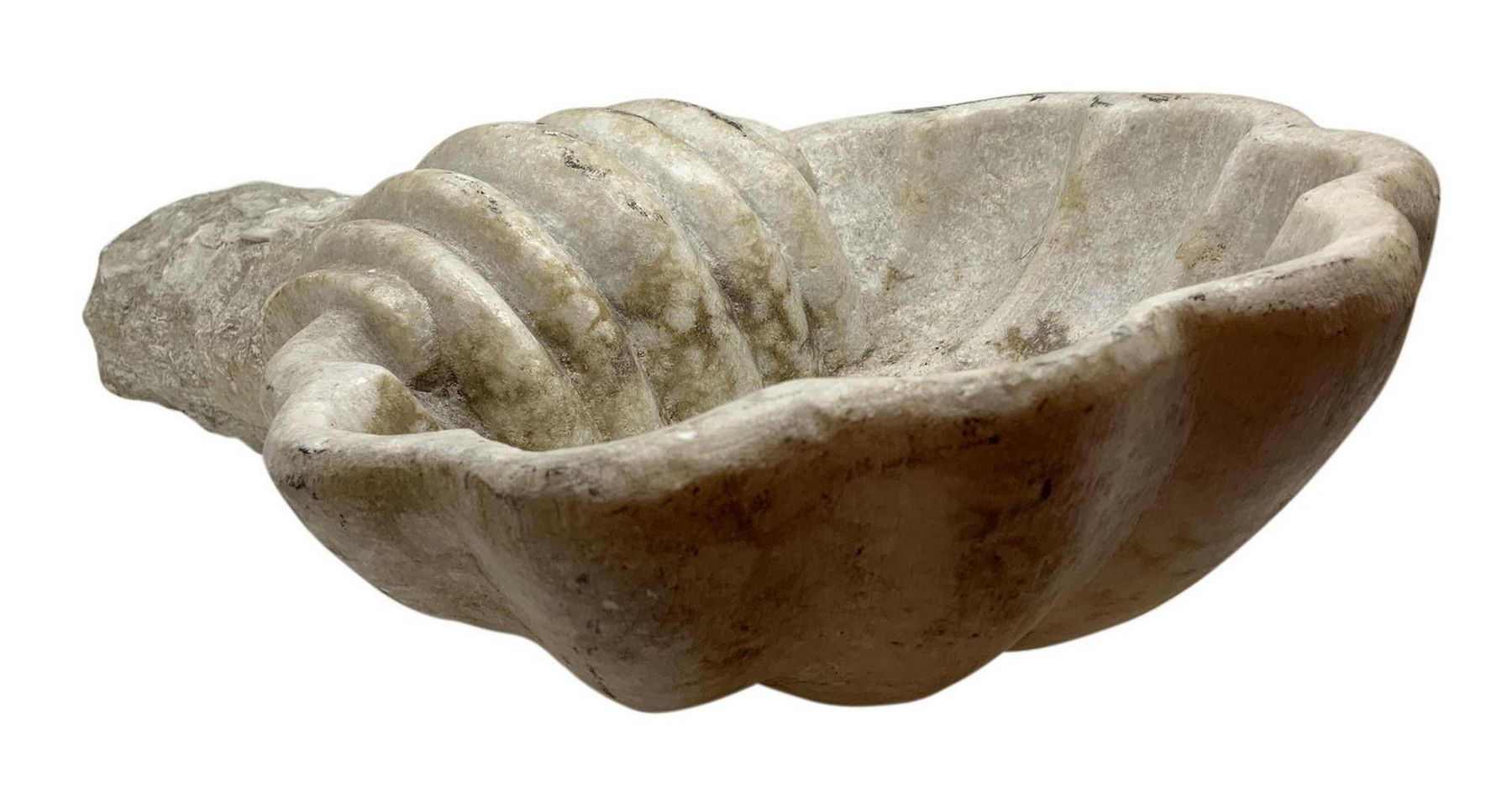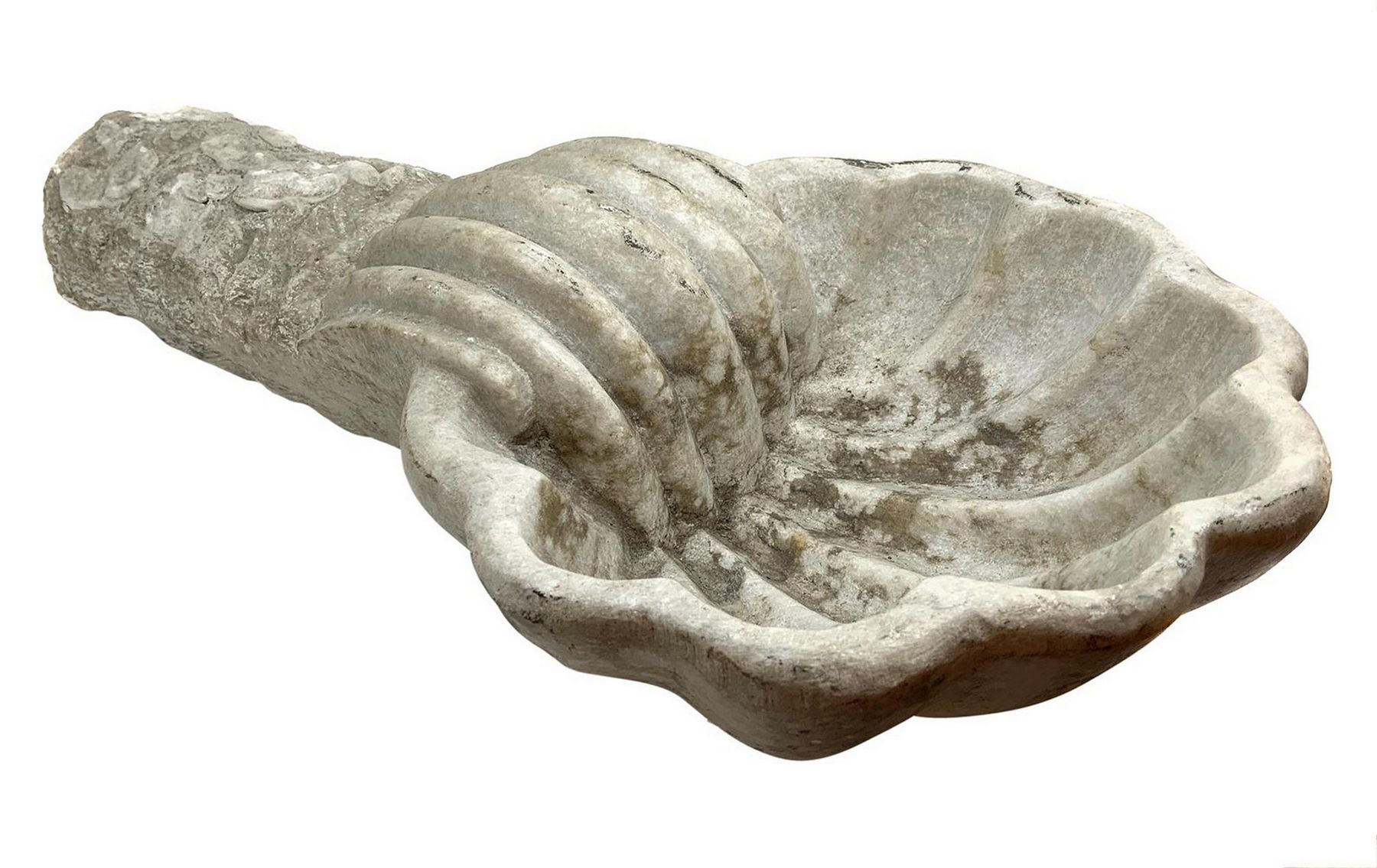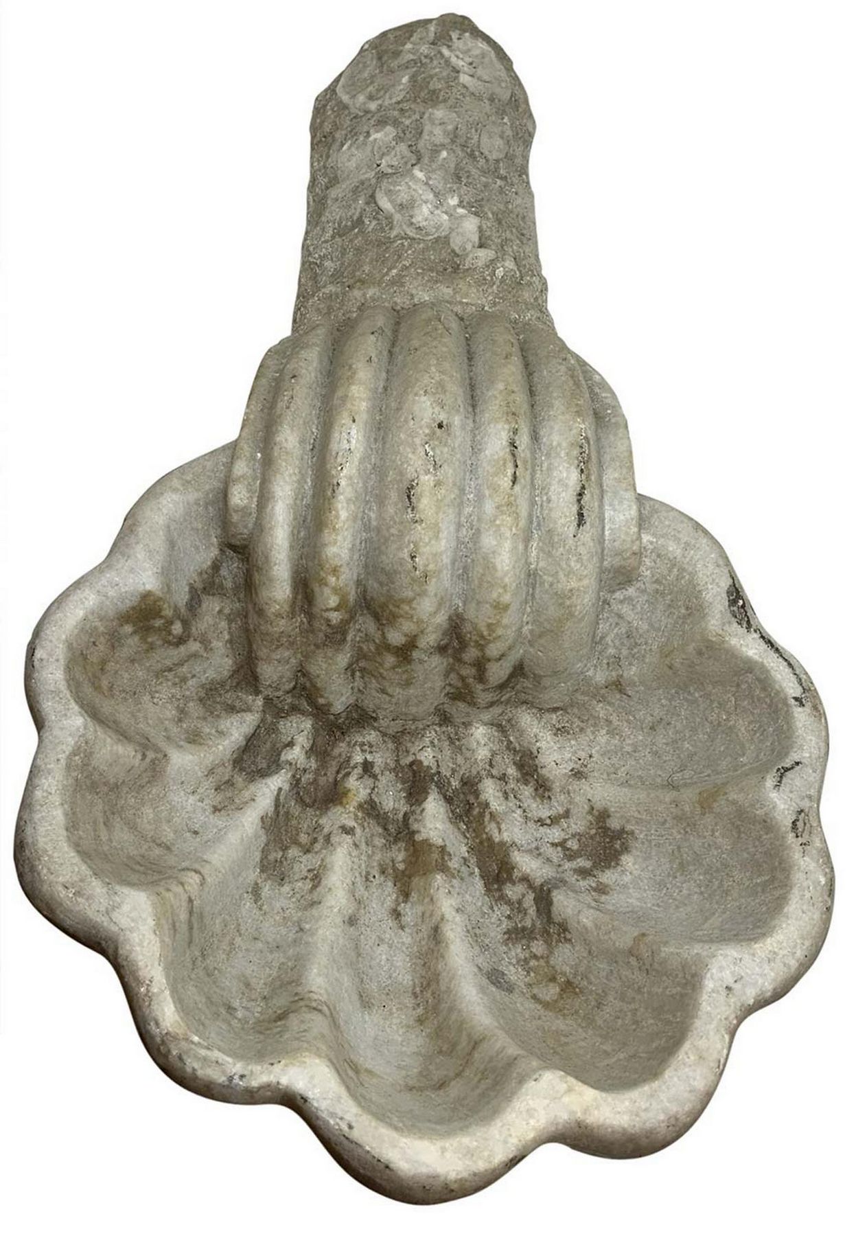 Acquasantiera da muro in marmo bianco, inizi XX secolo. Lunghezza totale cm 39, incasso muro cm 15, h cm 7, larghezza cm 20.