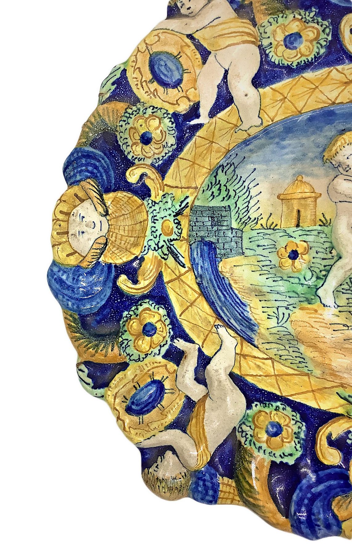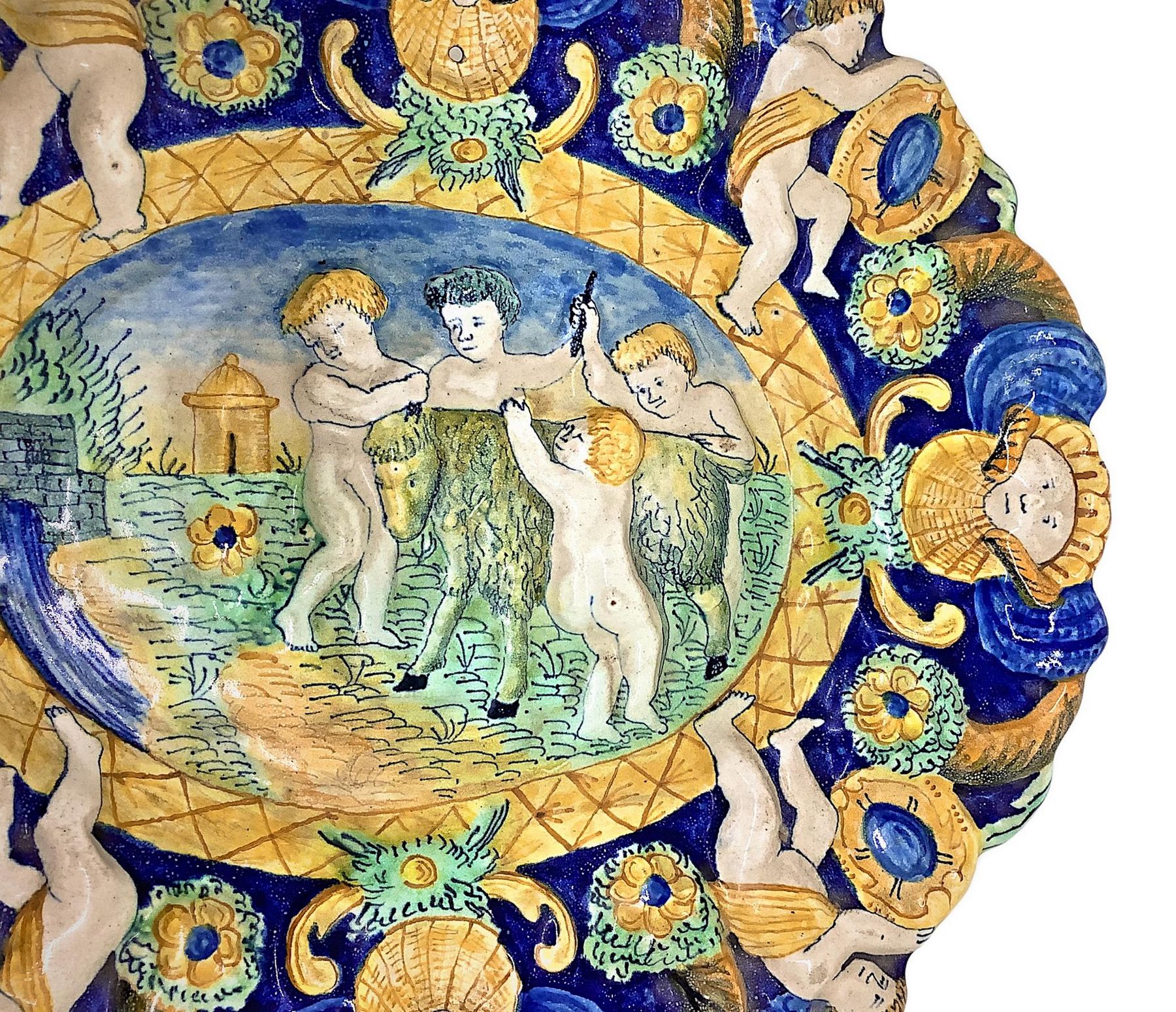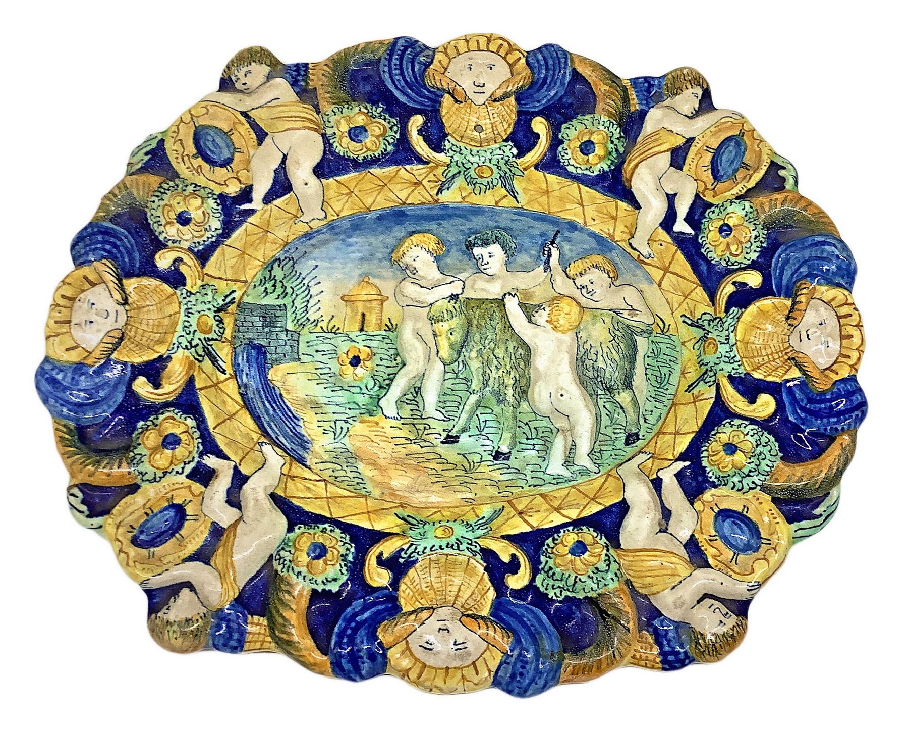 Lotto 233 | Piatto in maiolica con puttini, Centro Italia, XIX secolo. Cm 25x29,5.