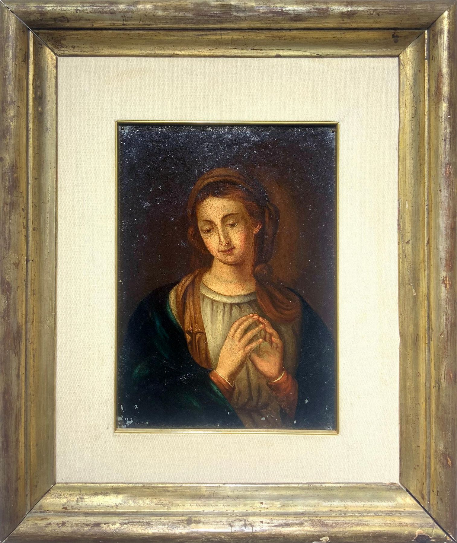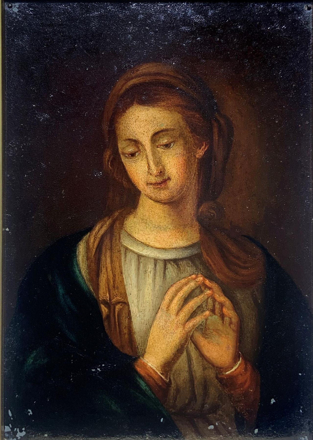 Dipinto ad olio su rame applicato su tavola raffigurante Madonna in preghiera, Sicilia fine XVIII secolo. Cm 42x30.