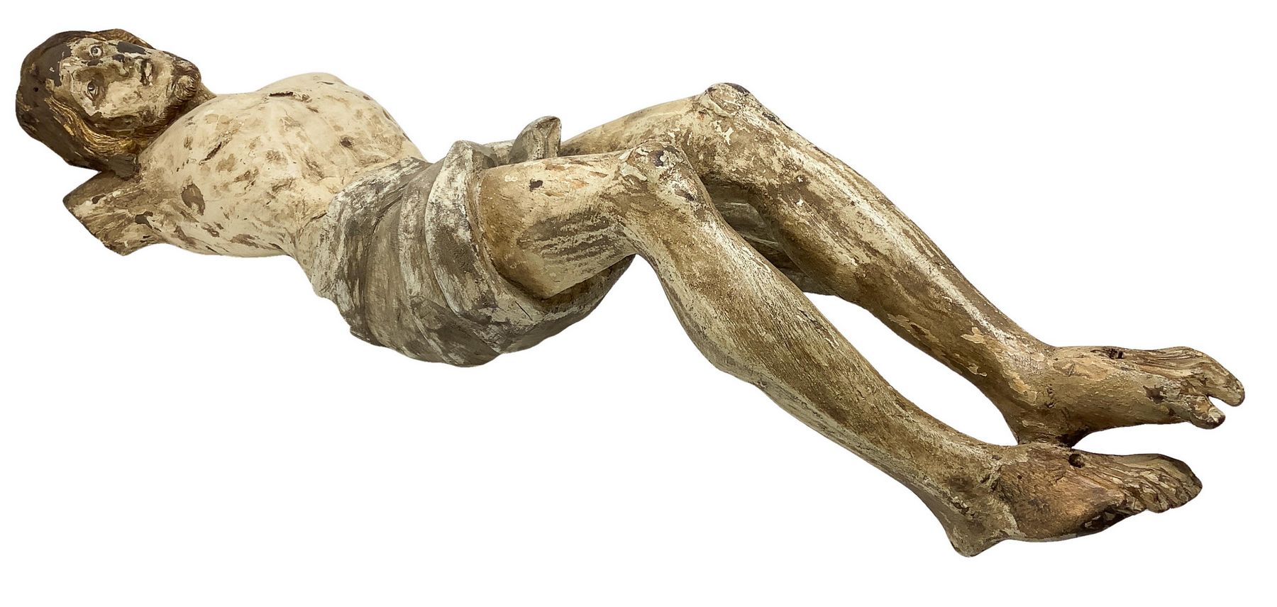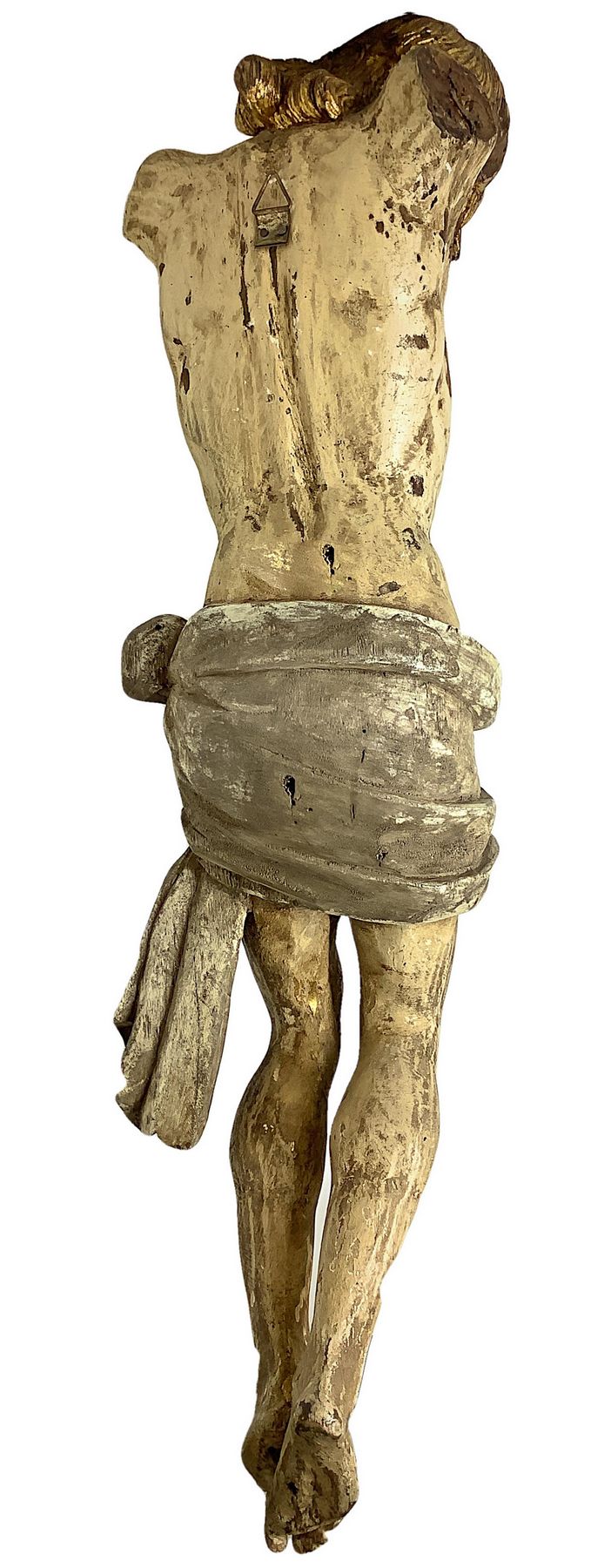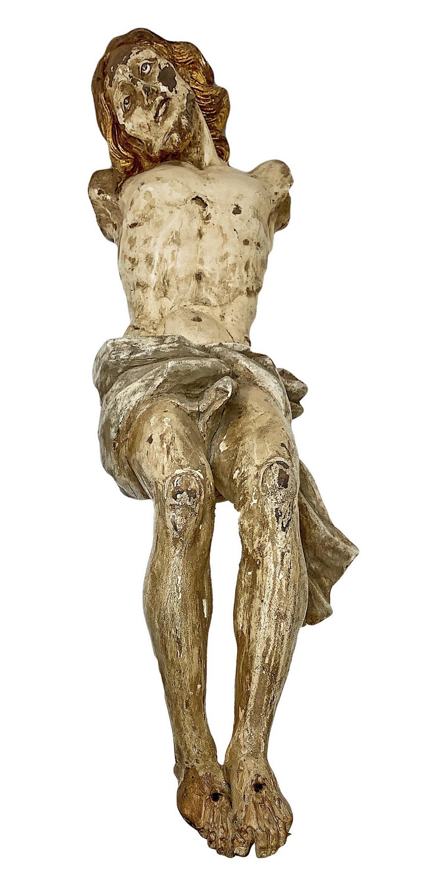 Scultura lignea policroma e dorata raffigurante cristo, occhi di vetro, XVIII secolo. H cm 51. Mancante di braccia.