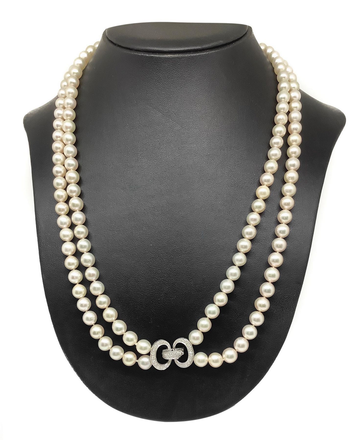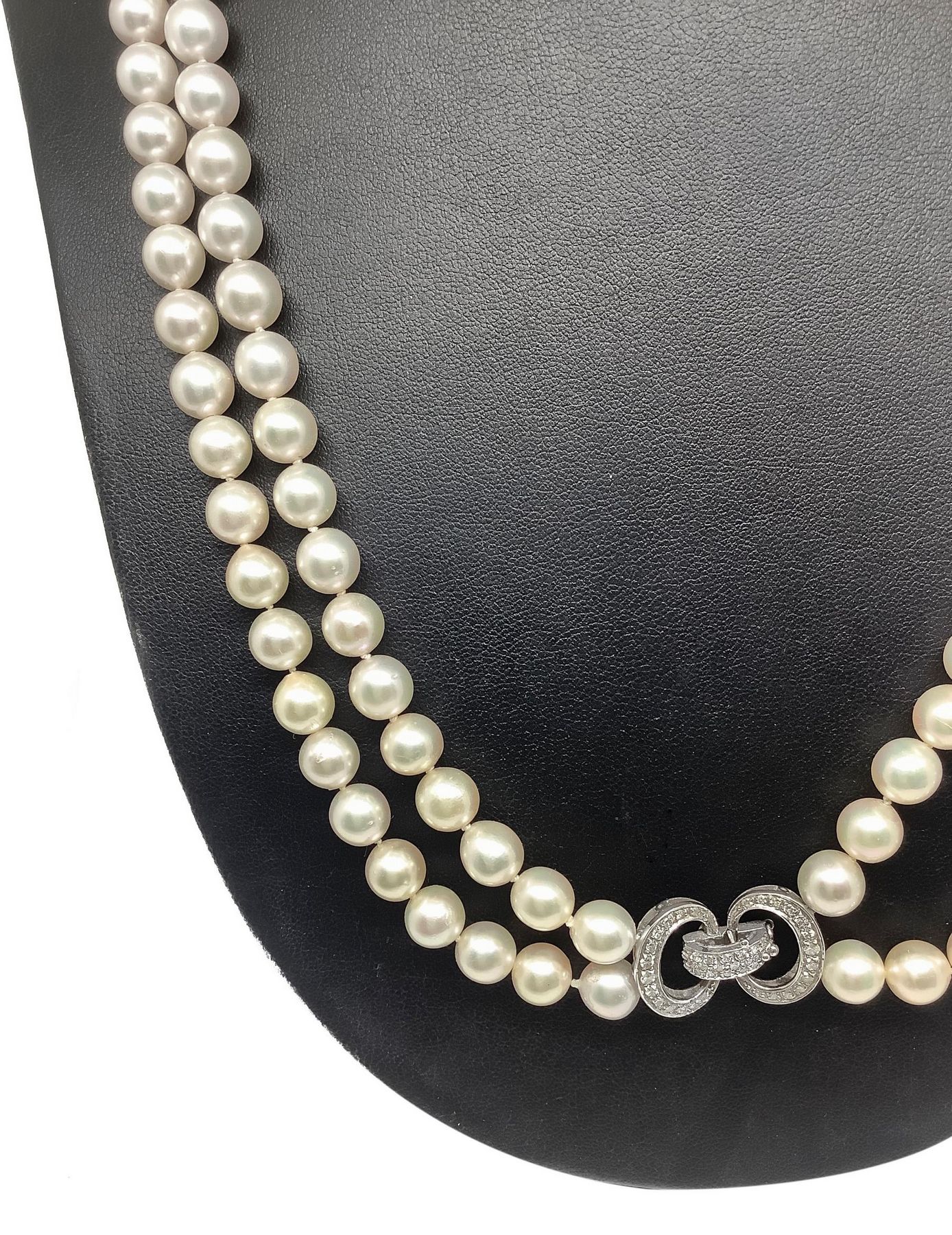 Collana di perle a doppio filo, susta oro B/18 K, Ca 5 gr, diamanti Ca 0.70, 8/8.