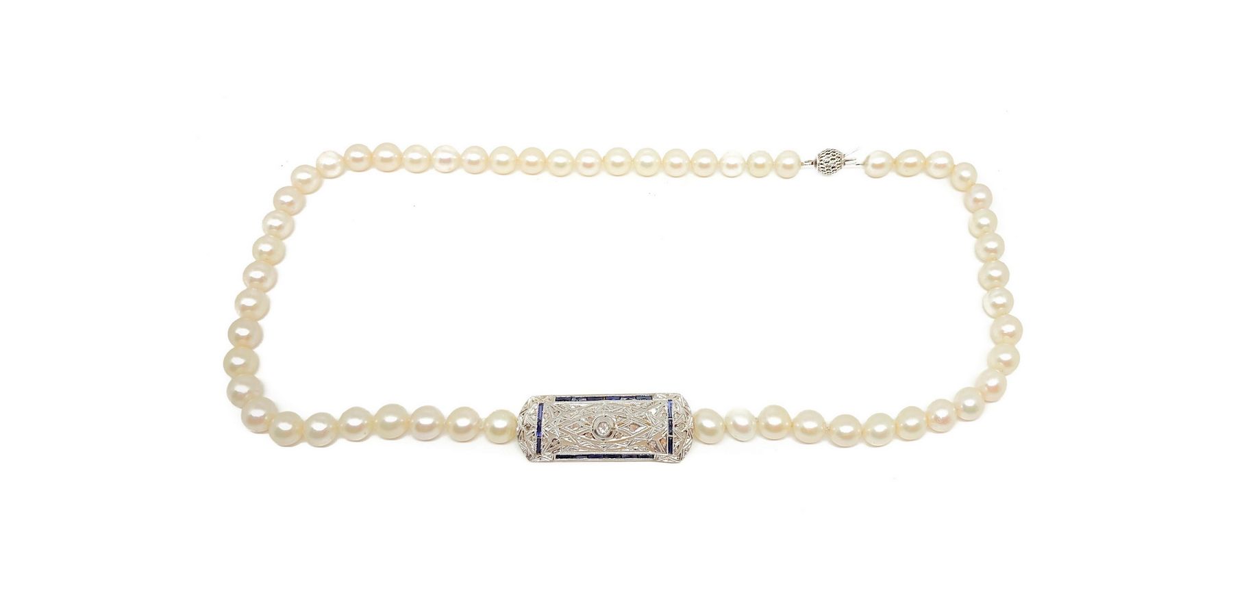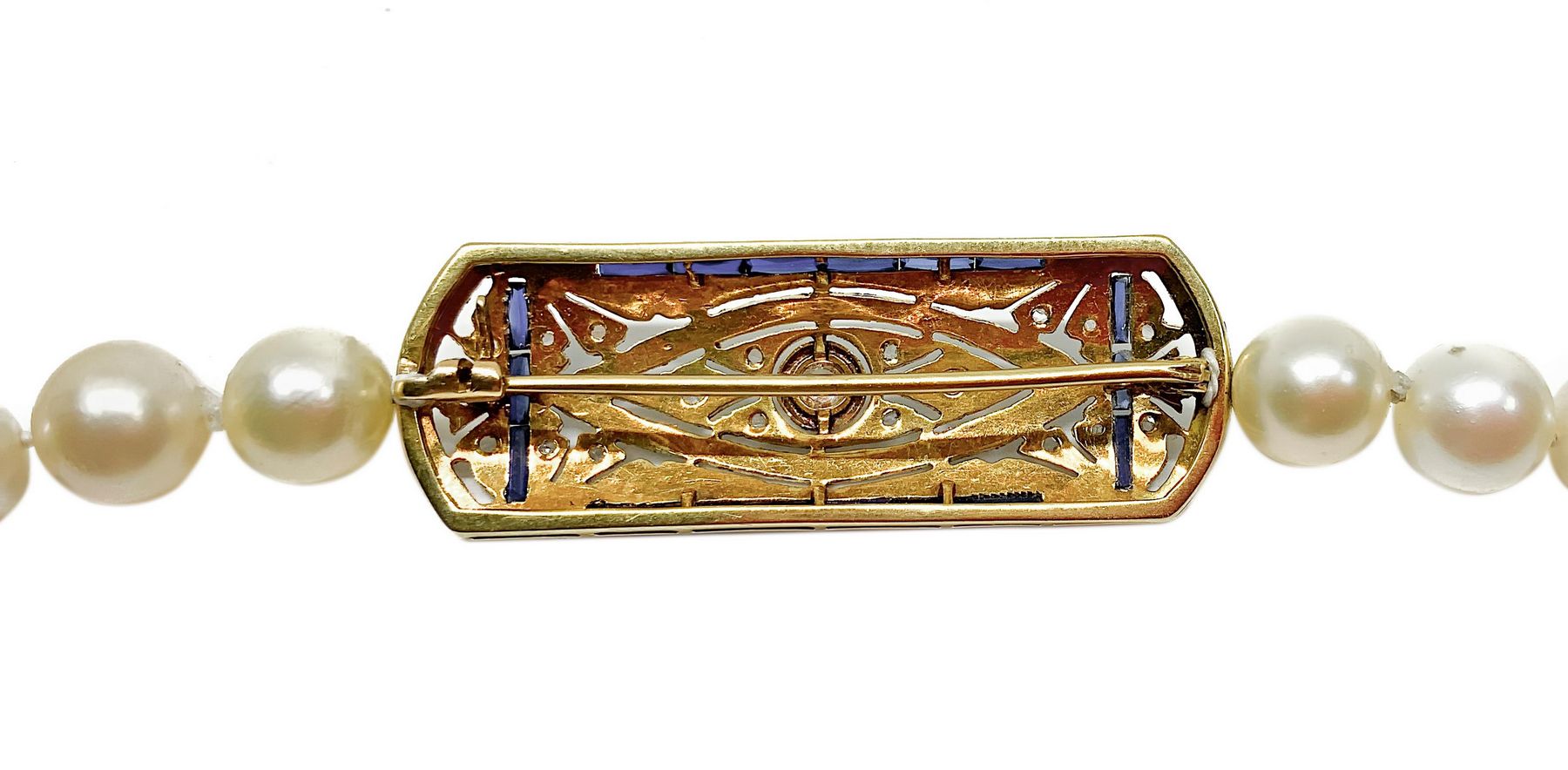 Collana di perle 8.3, chiusura con spilla decò aggiunta e removibile, ca 6 gr. Brillante centrale 8/8 e rosette di diamanti con contorno di zaffiri sintetici.