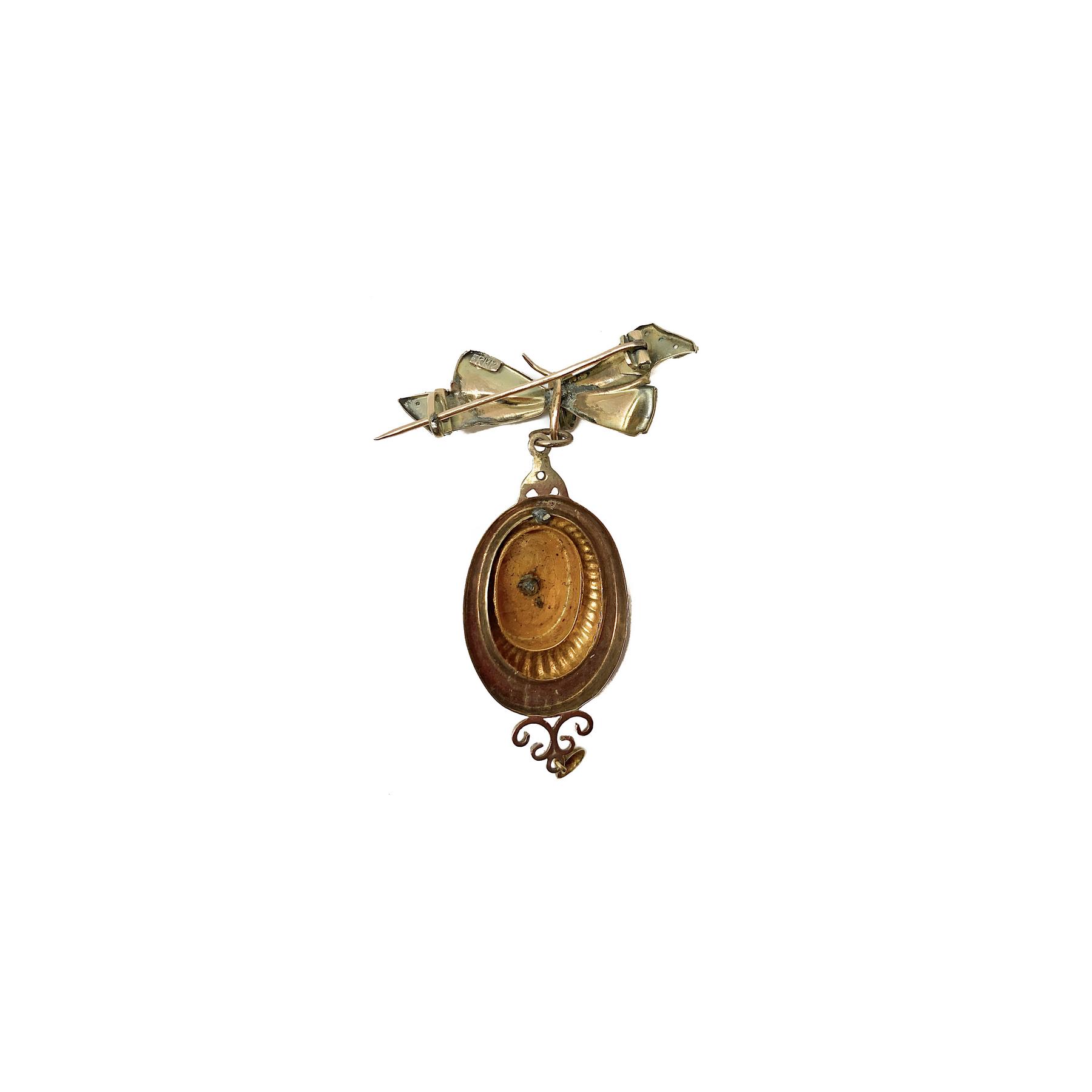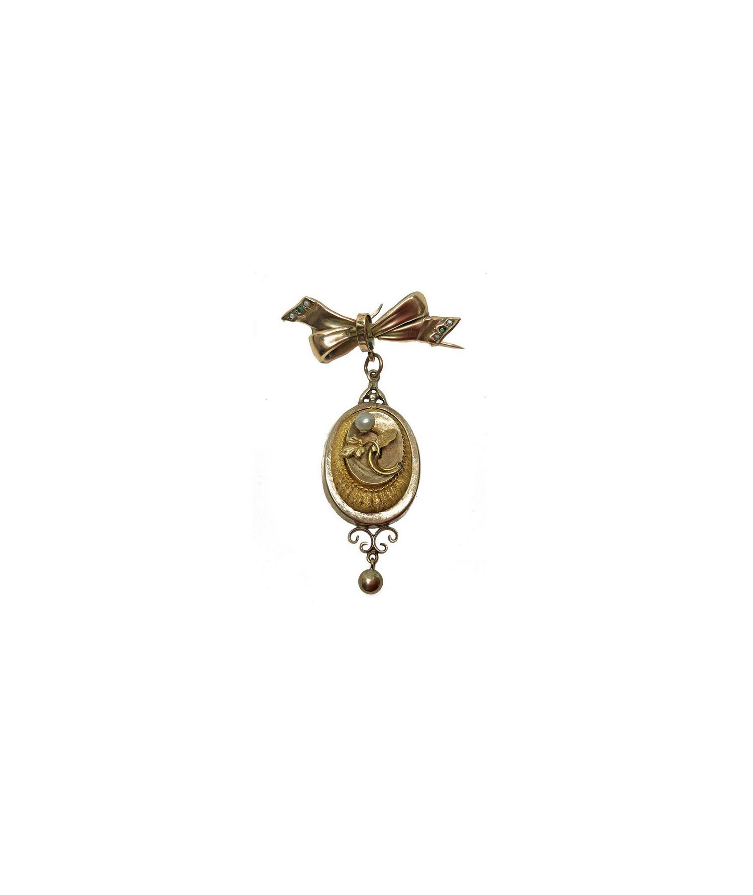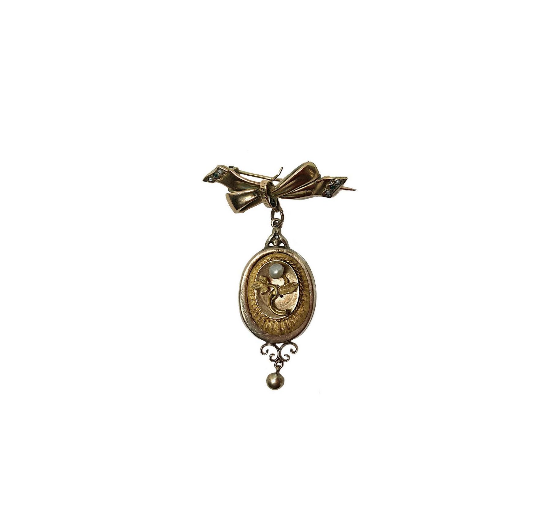 Spilla con perline e piccolo pendente, oro 12 K con spilla oro/arg