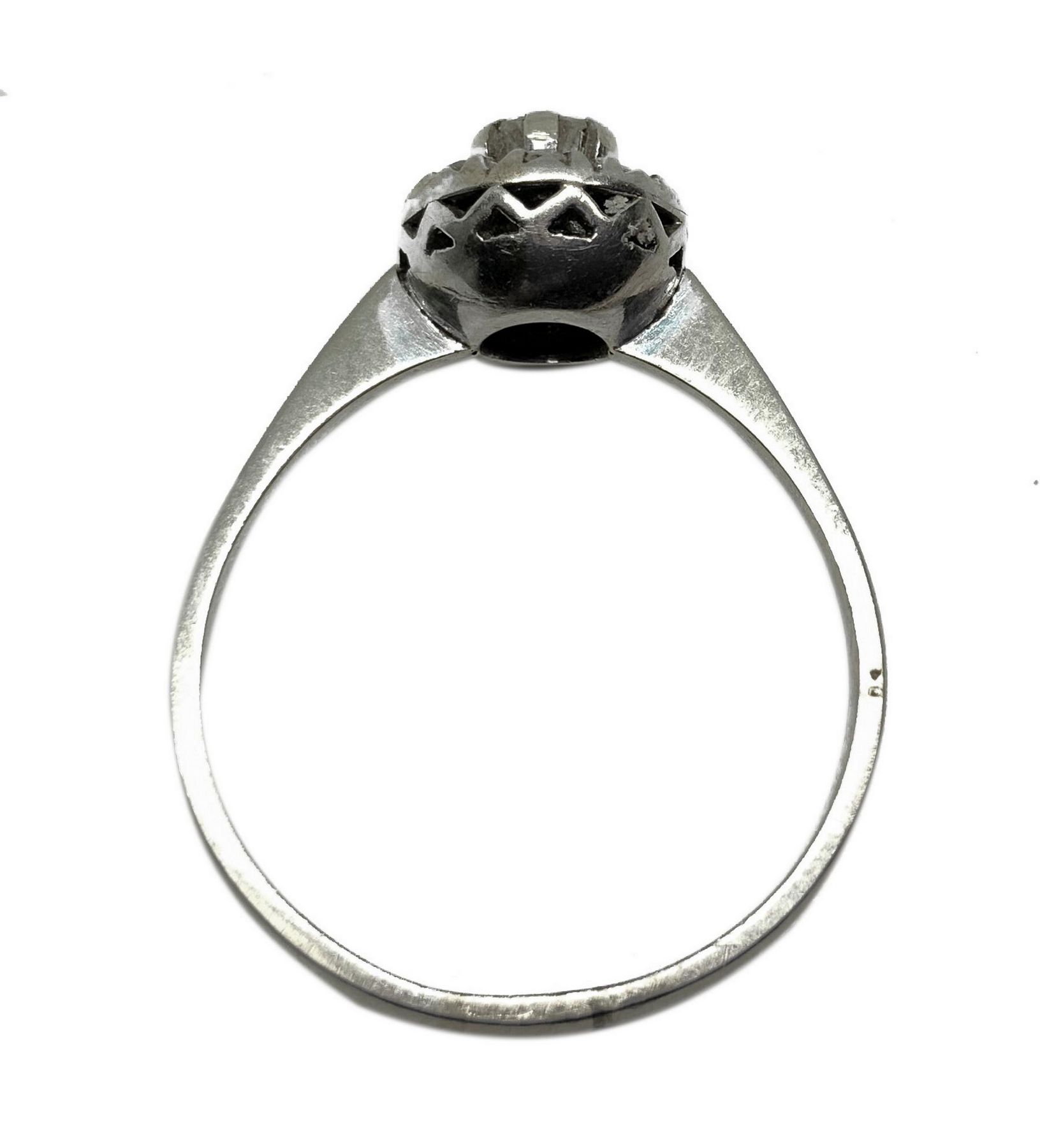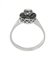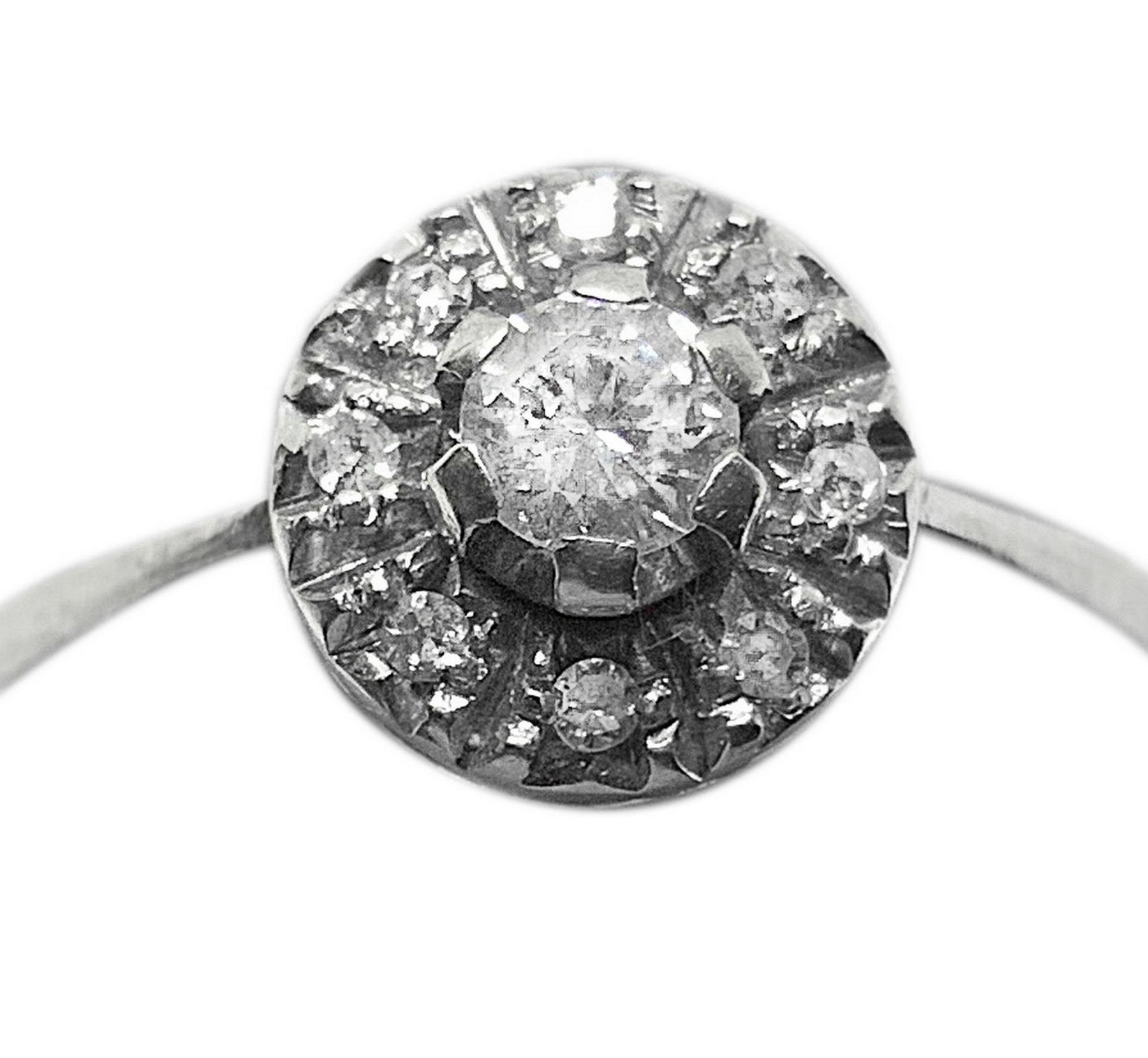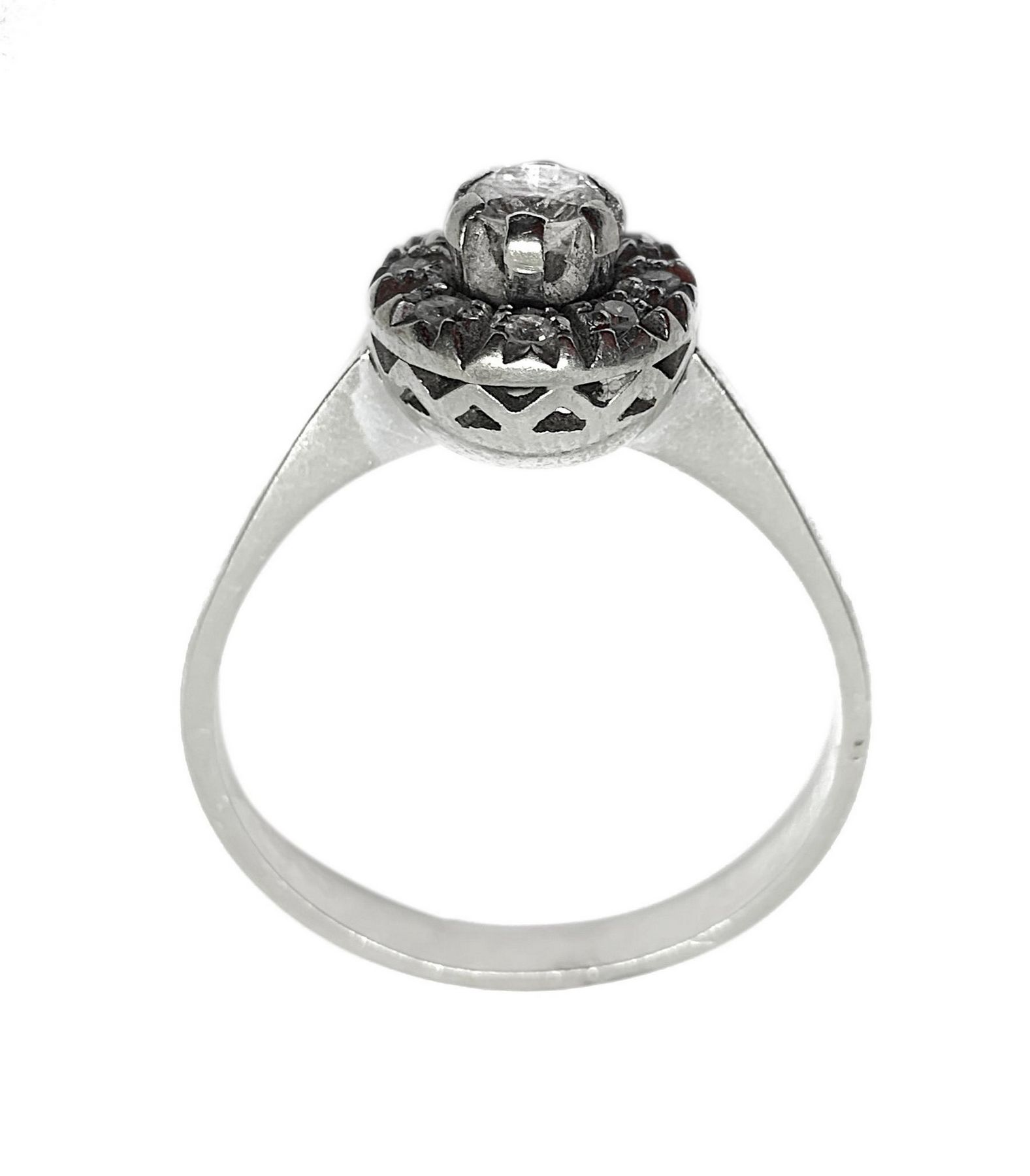 Anello a rosetta in oro bianco con brillante al centro e giro di brillantini. Gr 3.3.