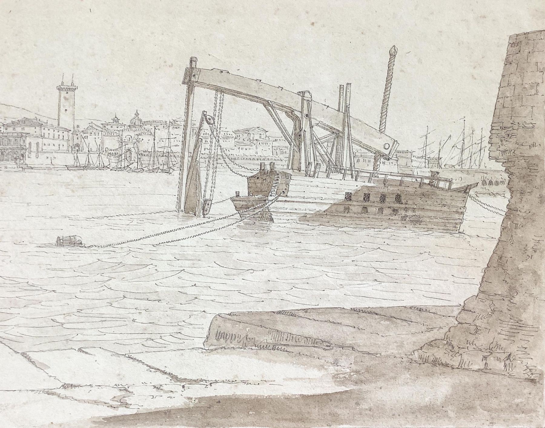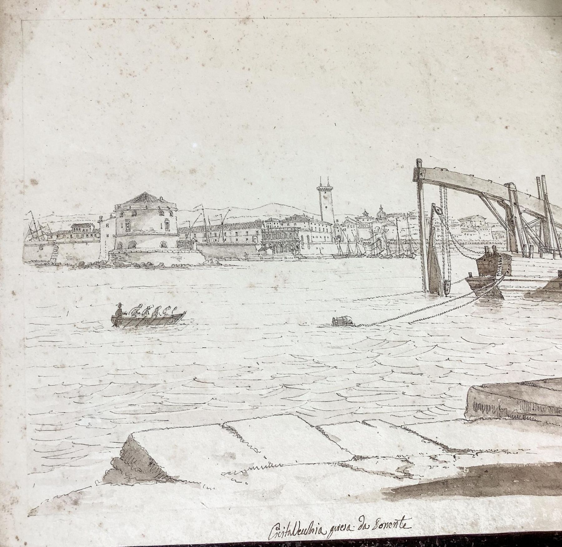 Disegno a inchiostro bruno su carta raffigurante Civitavecchia, anonimo del XIX sec. 444X296mm