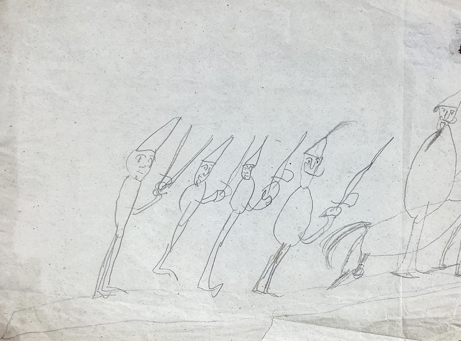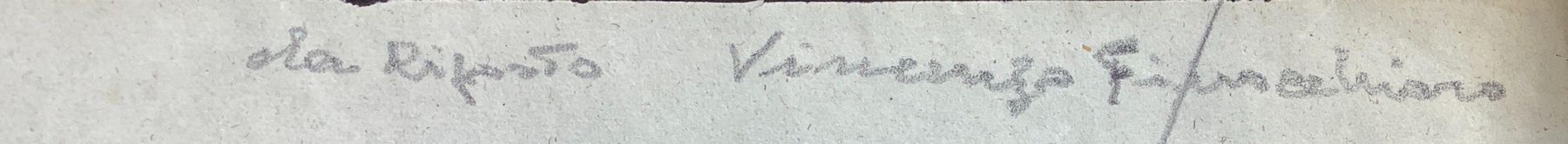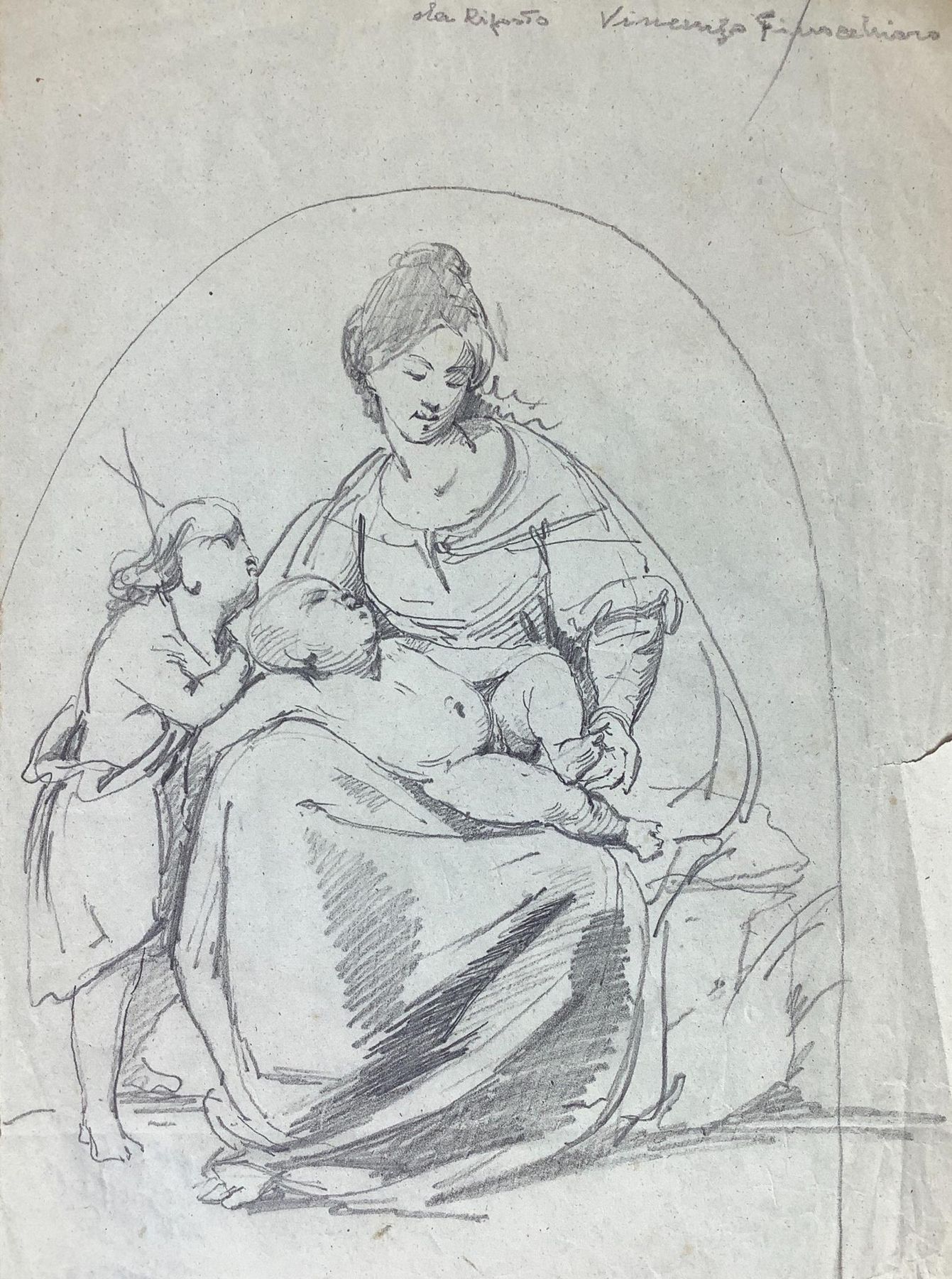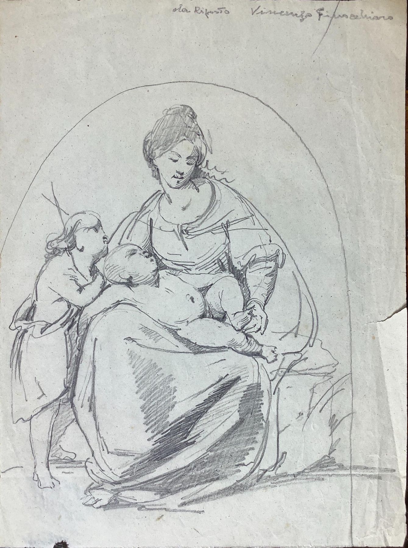 Disegno a matita su carta raffigurante Sacra Famiglia e San Giovannino, con scritta Vincenzo Finocchiaro da Riposto. 305 x 220 mm