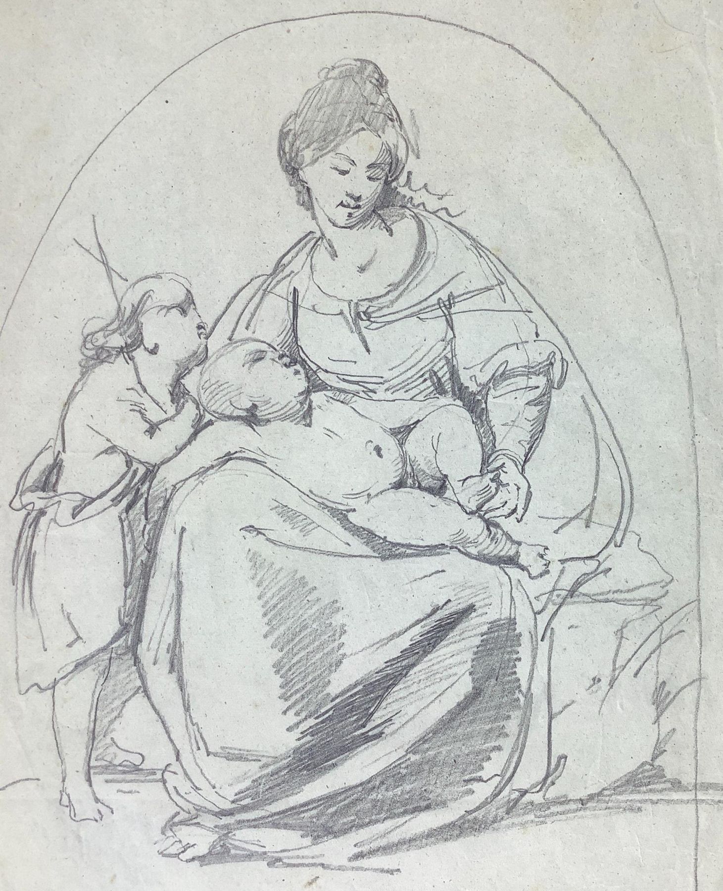 Disegno a matita su carta raffigurante Sacra Famiglia e San Giovannino, con...