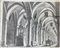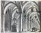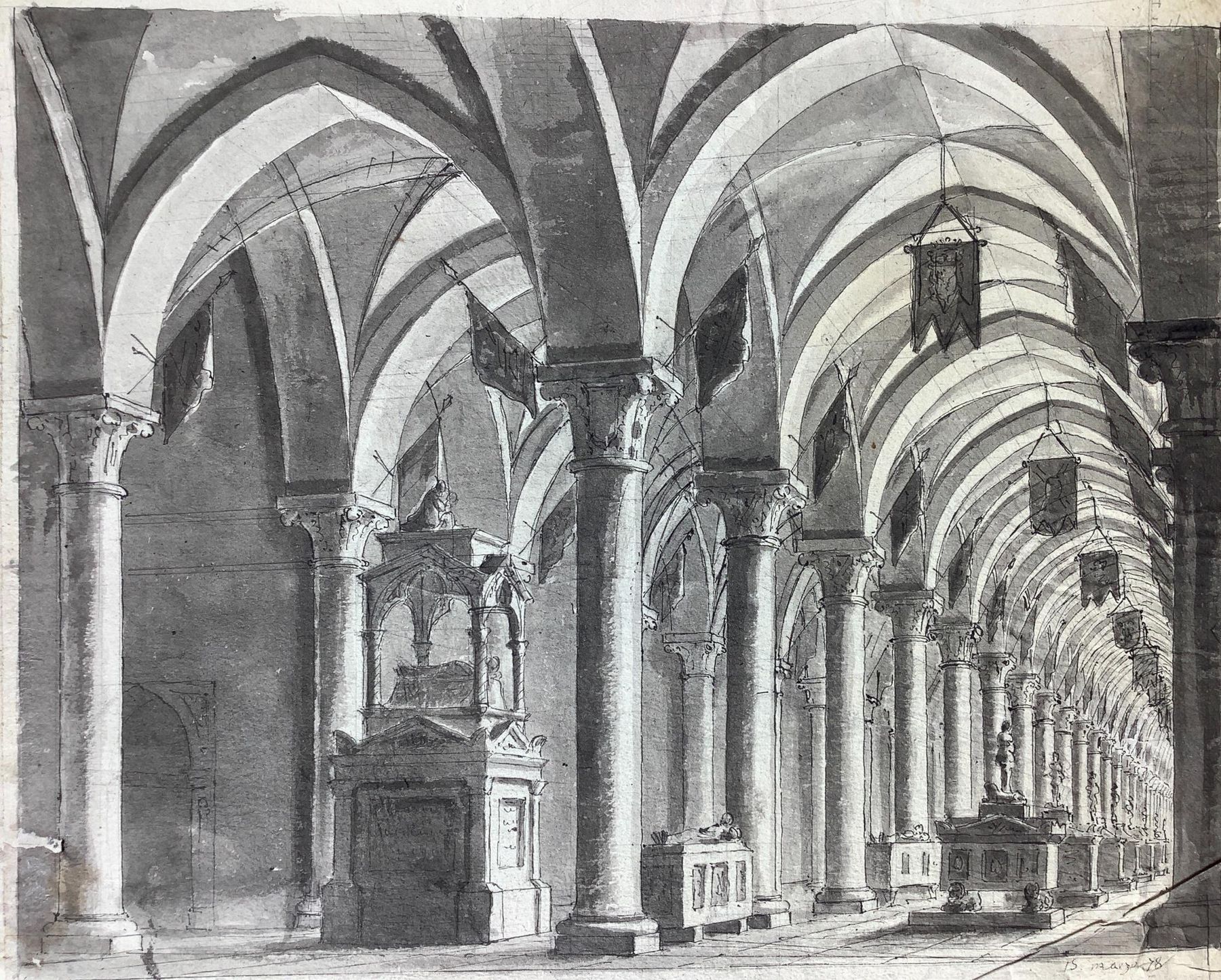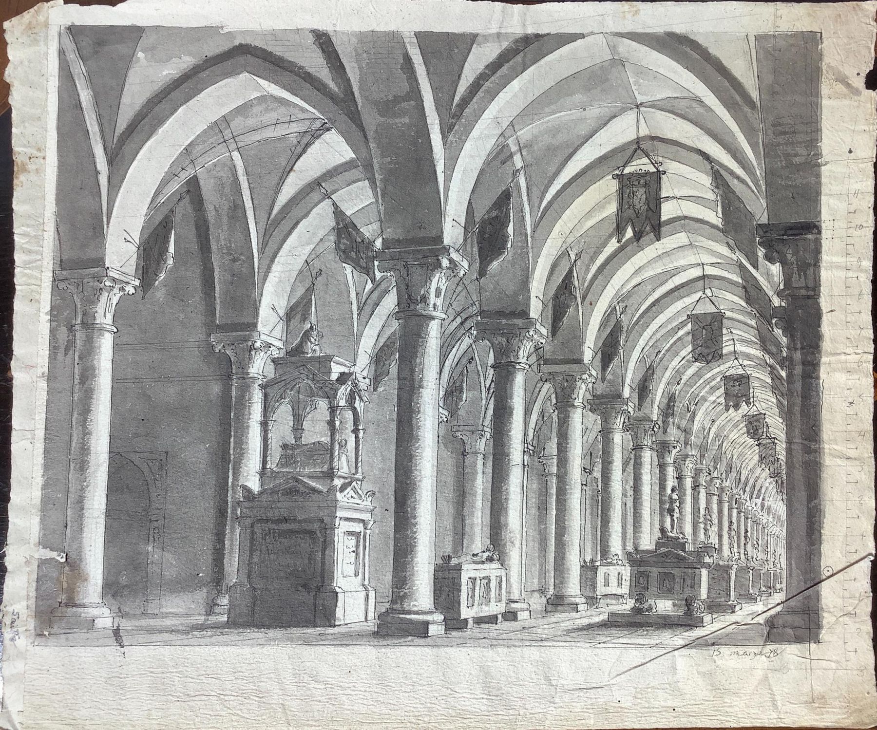 Disegno attribuito G.Saitta, ad inchiostro bruno su carta vergellata del XVIII sec, raffigurante interno con logge, colonne, statue e volte a sesto acuto. 358x419mm