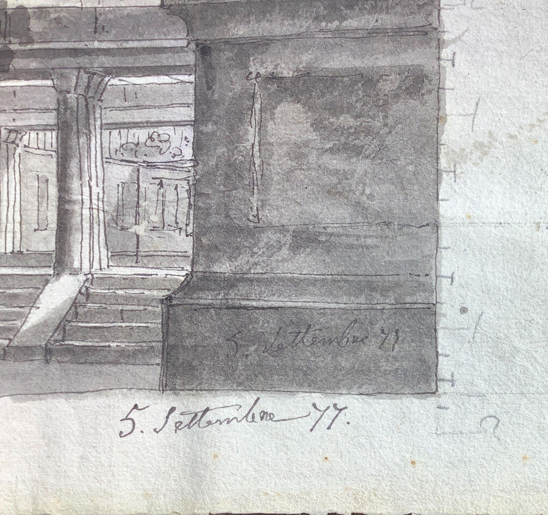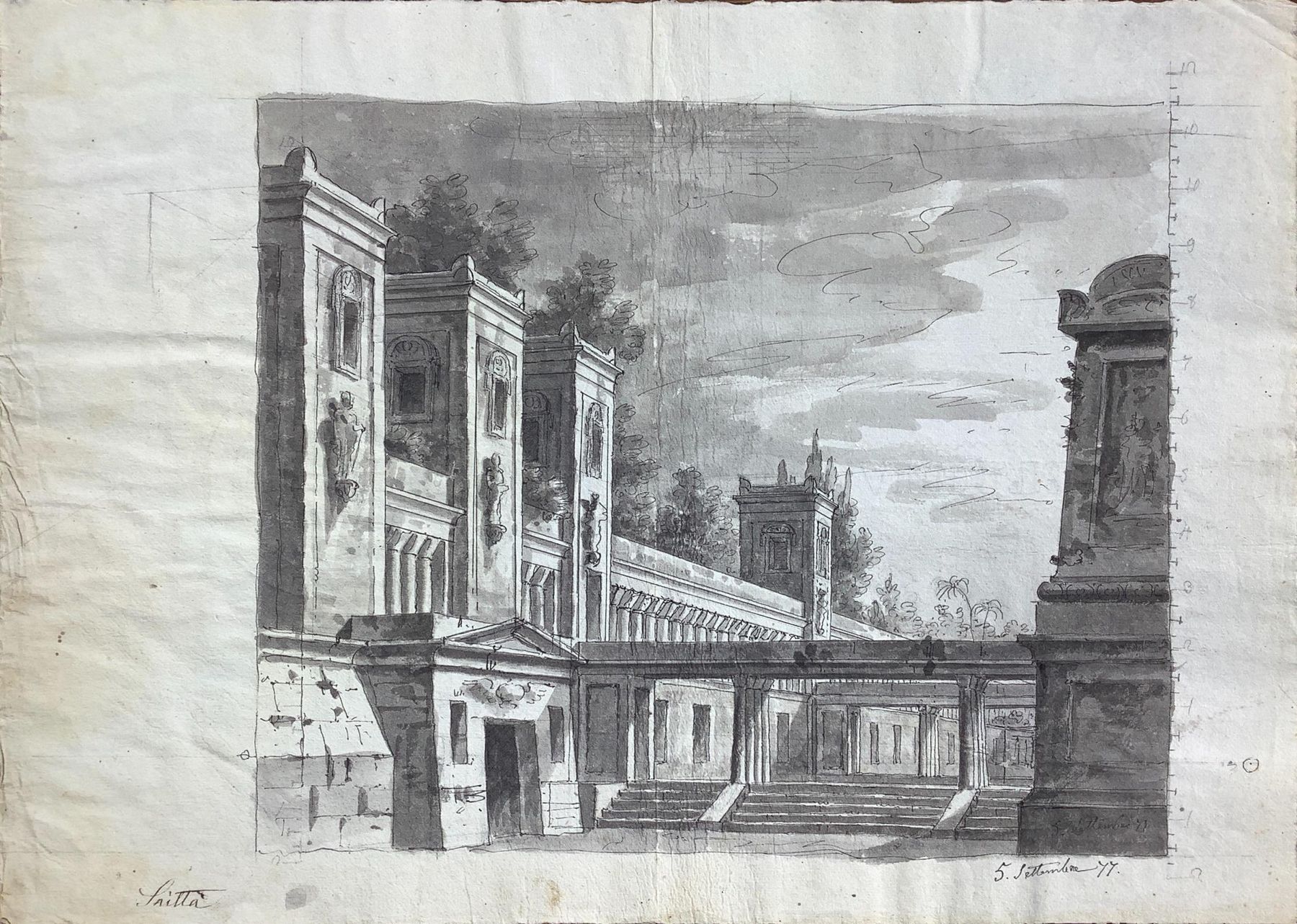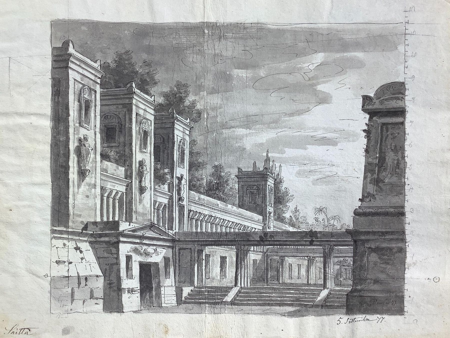 Disegno attribuito G.Saitta, ad inchiostro bruno su carta vergellata del XVIII sec, raffigurante prospetto di villa con timpano e travi, firmato in basso a sinistra G. Saitta e datato 5 settembre 77. 307x428 mm