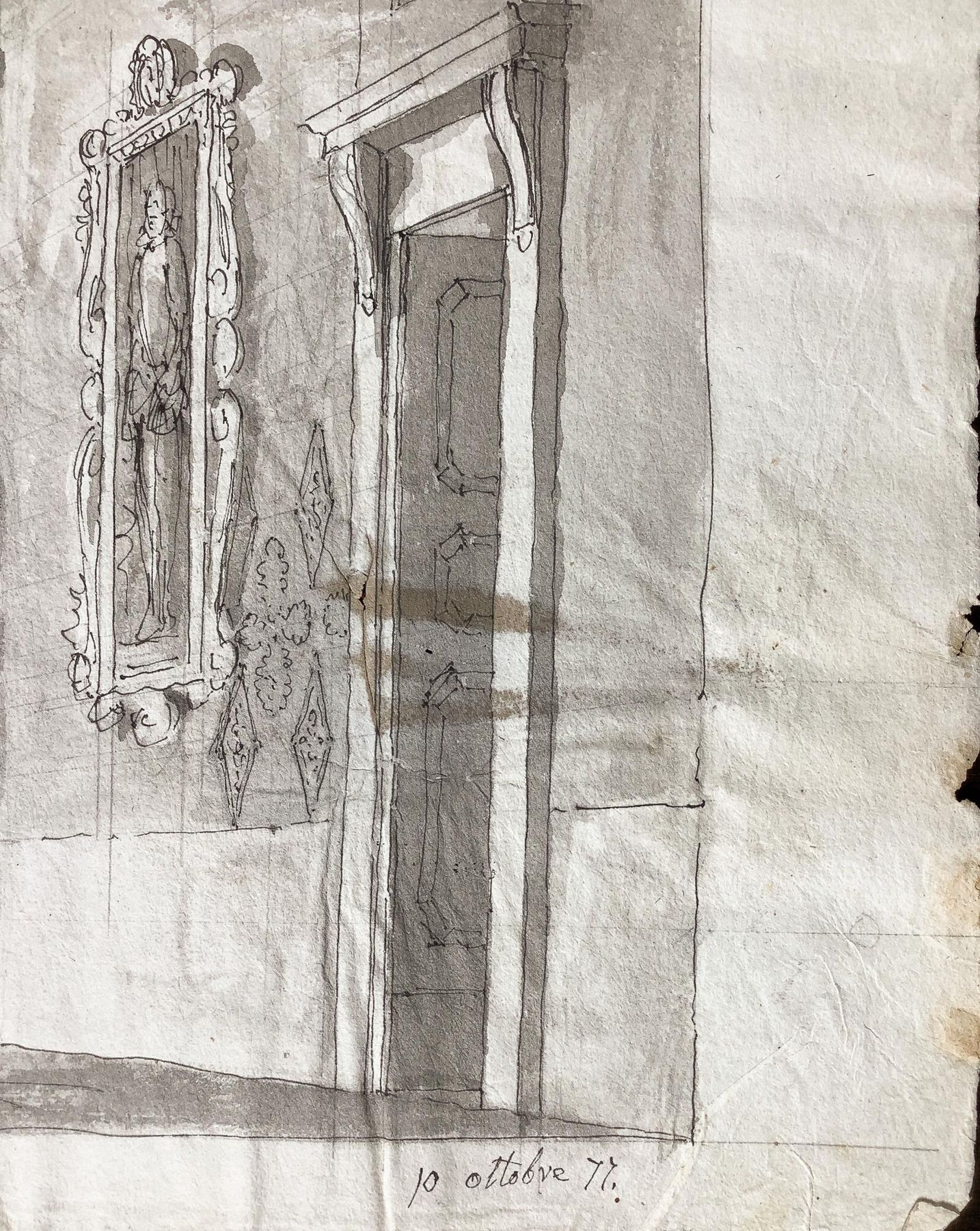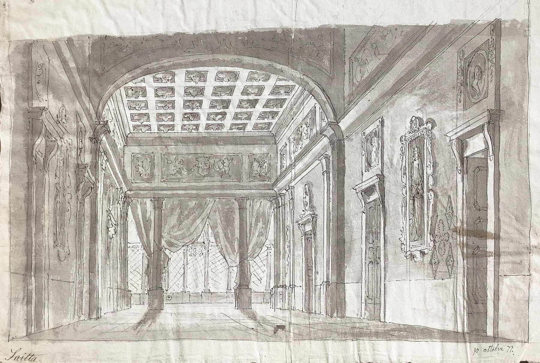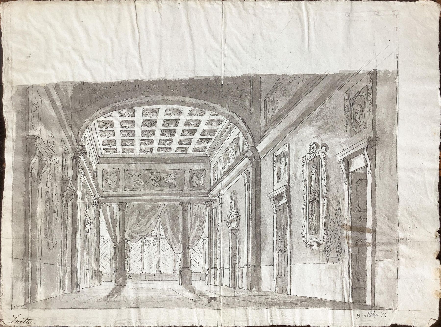 Disegno attribuito G.Saitta, ad inchiostro bruno su carta interno con colonne...
