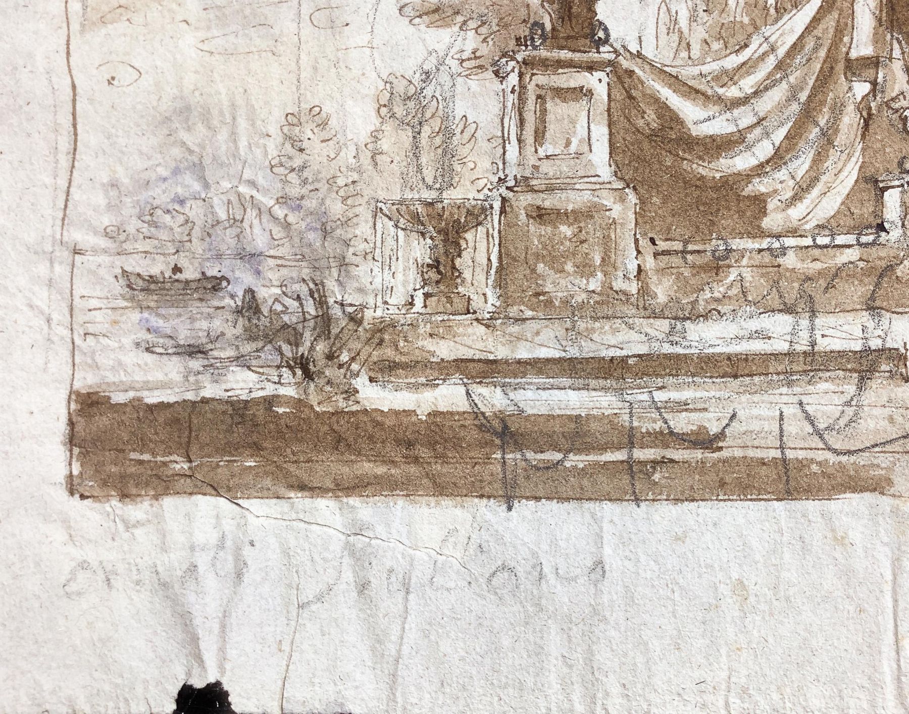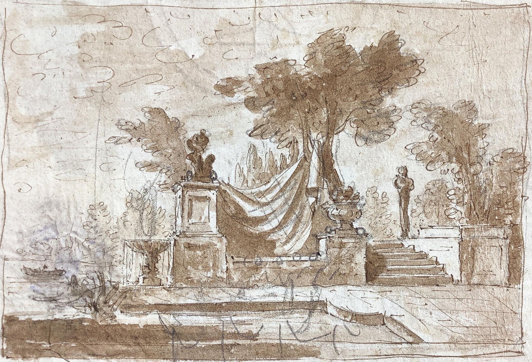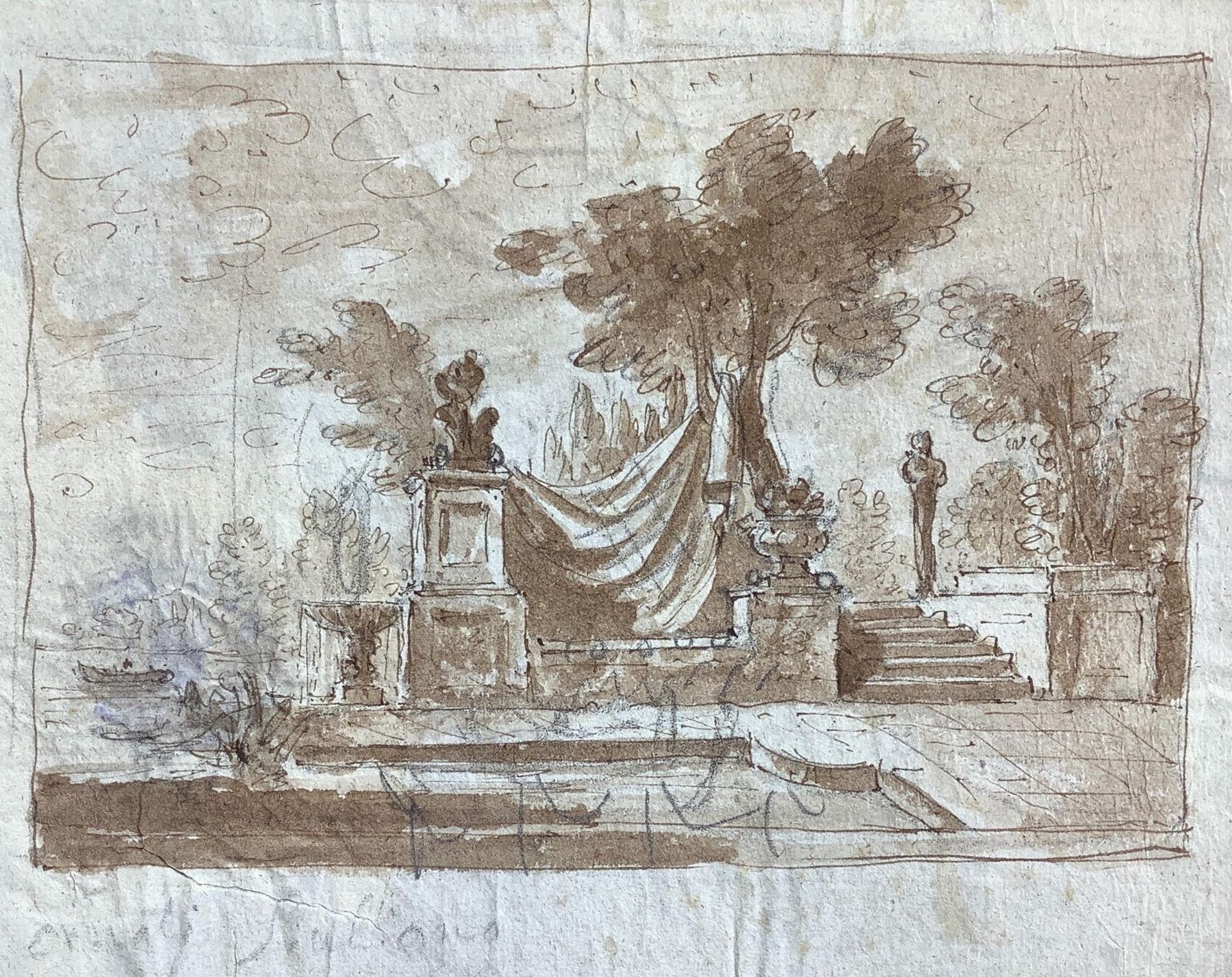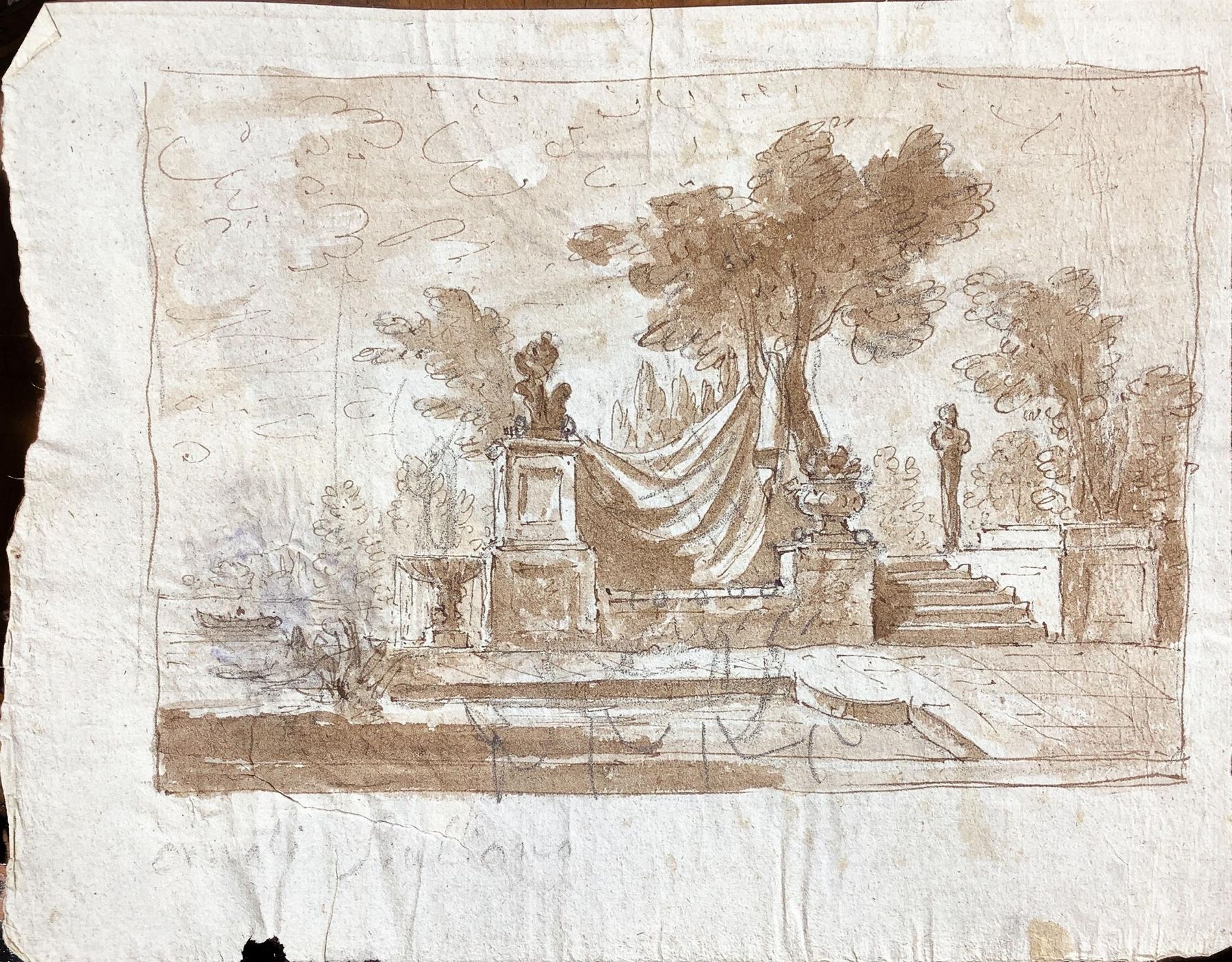 Disegno attribuito G.Saitta, ad inchiostro seppia su carta raffigurante giardino interno. 160x250 mm