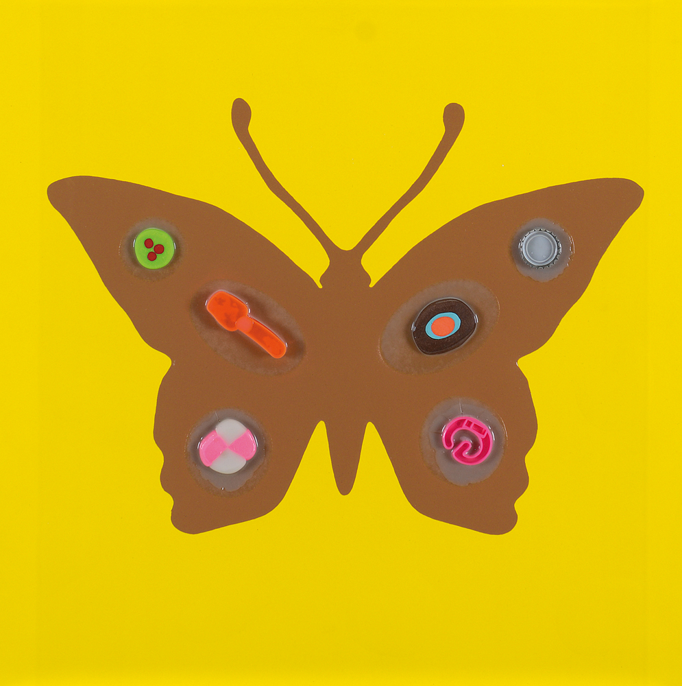 RENZO NUCARA Crema 1948  Butterfly effect, 2012 legno, carta, smalto, resine e oggetti su faesite cm. 50x50, firma, archivio dell'artista e descrizione dell'opera al retro, dichiarazione d'autenticità e archivio dell'artista su foto, entro teca in plexiglass.