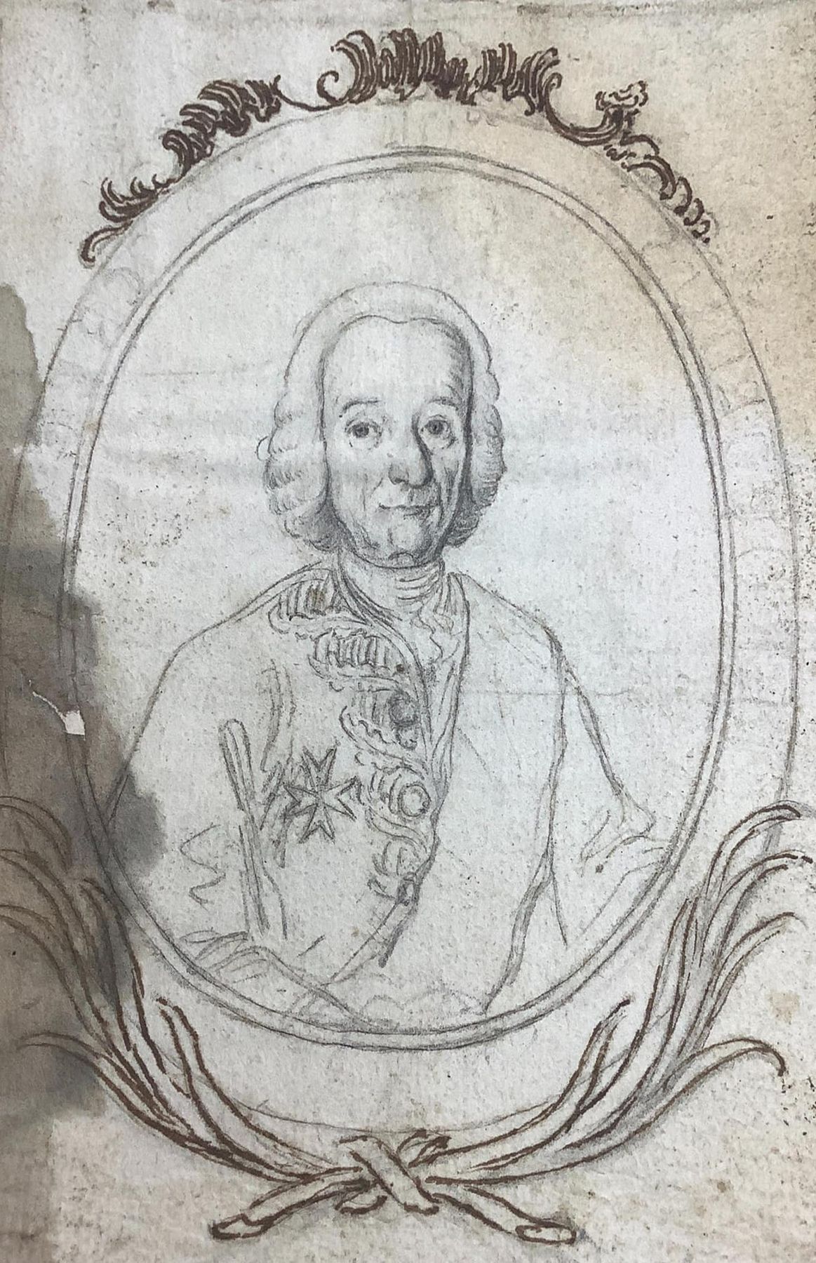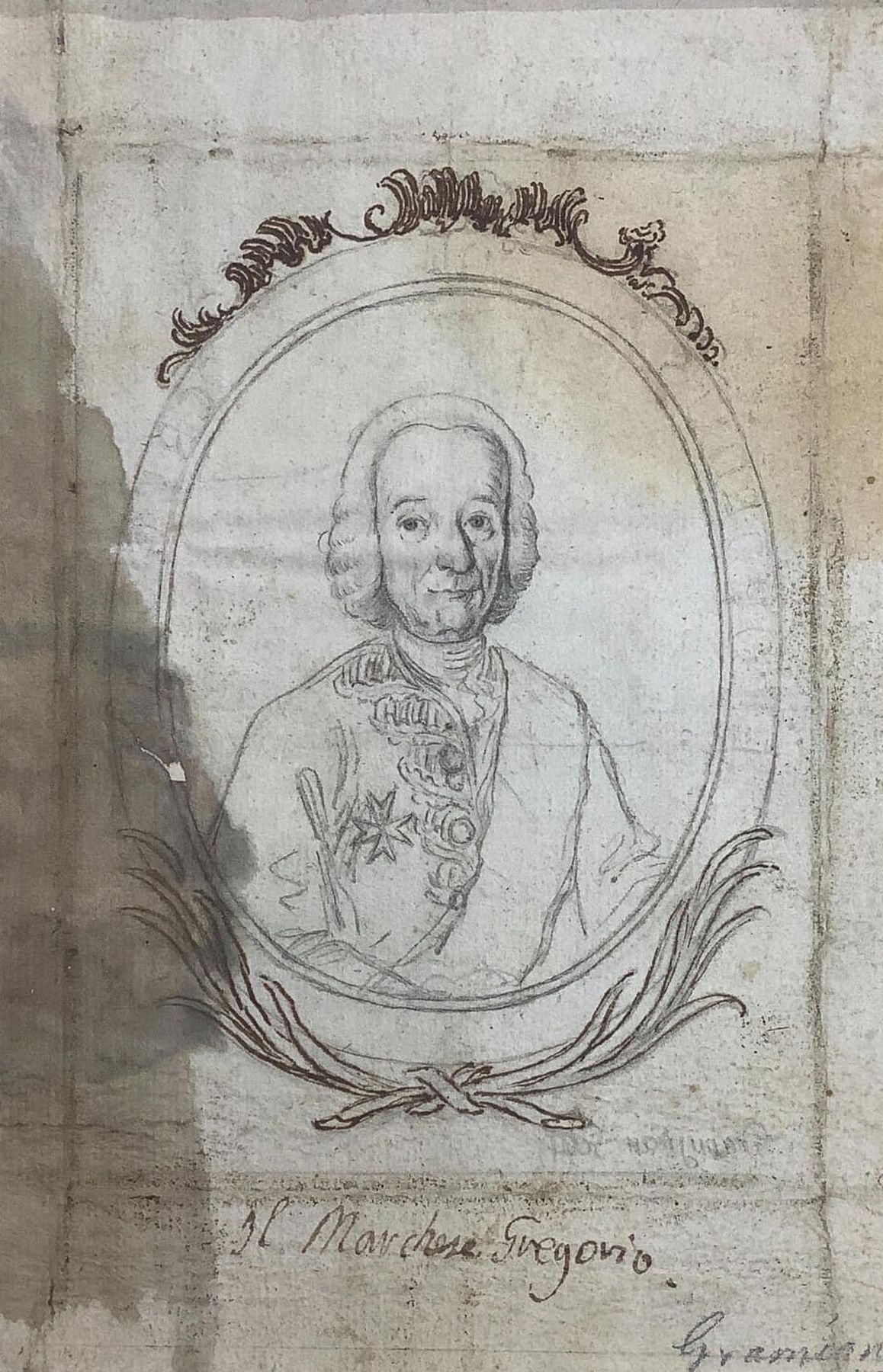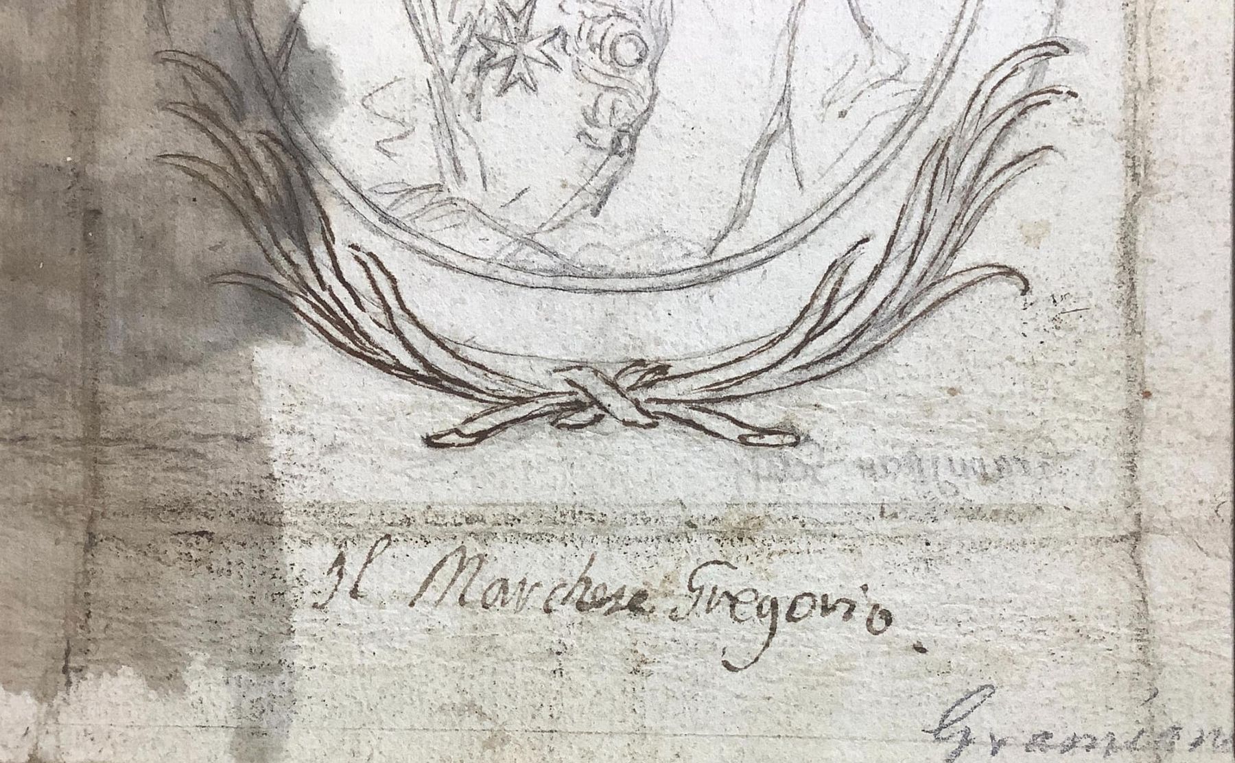 Disegno di Gramignani raffigurante il Marchese Gregorio. Disegno su carta a matita e inchiostro marrone. Mm 208x185. Firmato in basso a destra.