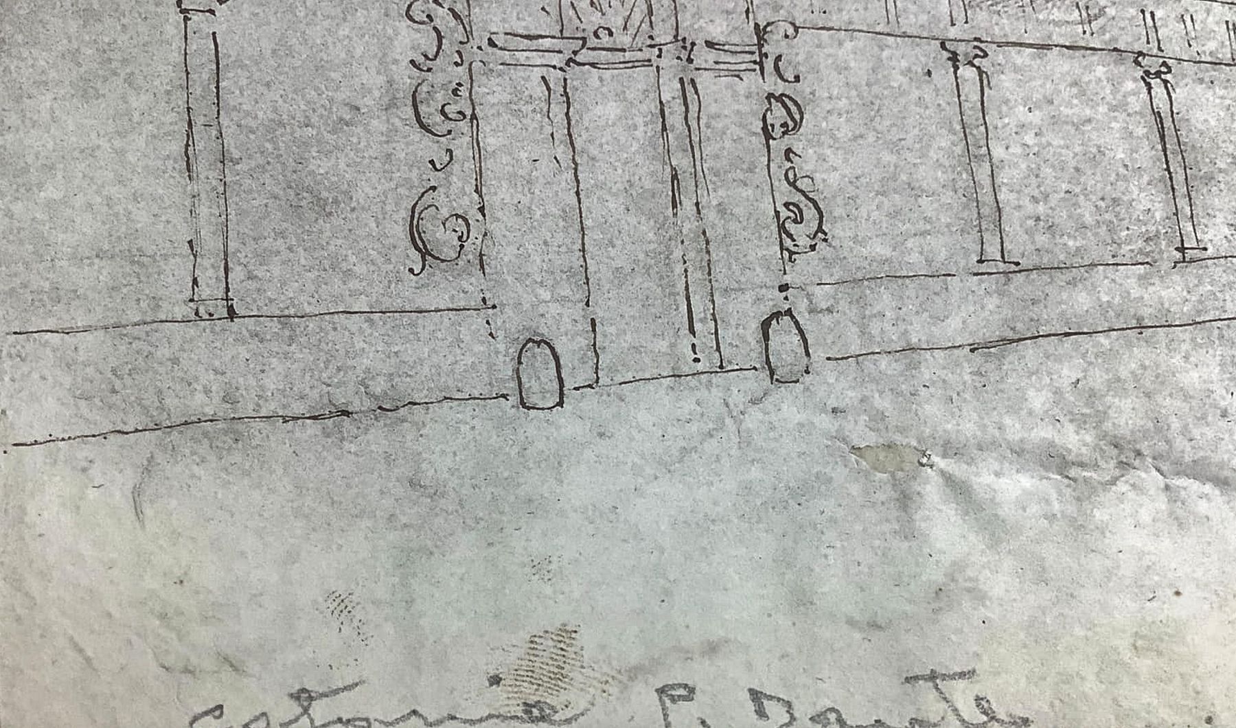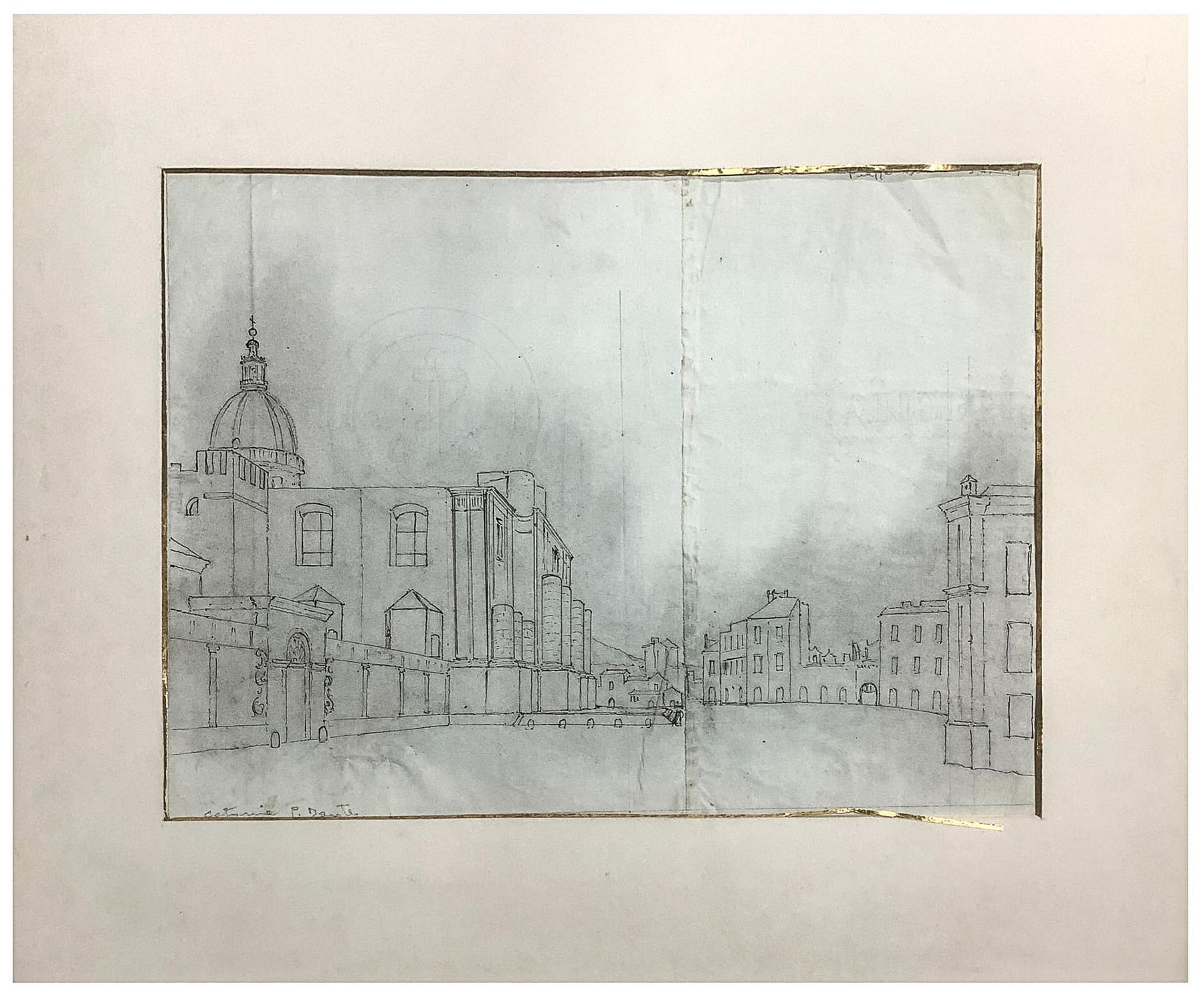 Disegno su carta raffigurante Piazza Dante (Catania, Sicilia), XIX secolo. Disegno su carta a penna e inchiostro bruno. Mm 250x355. Testimonianza storico-locale.