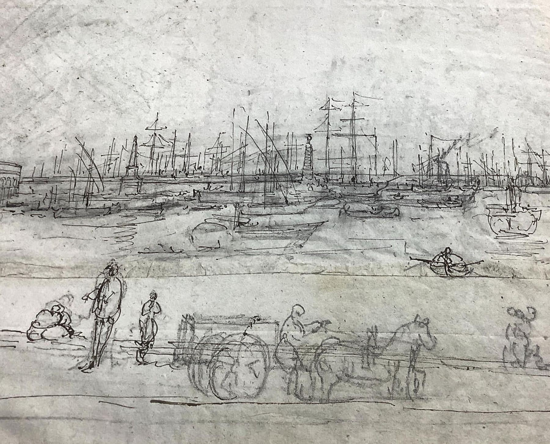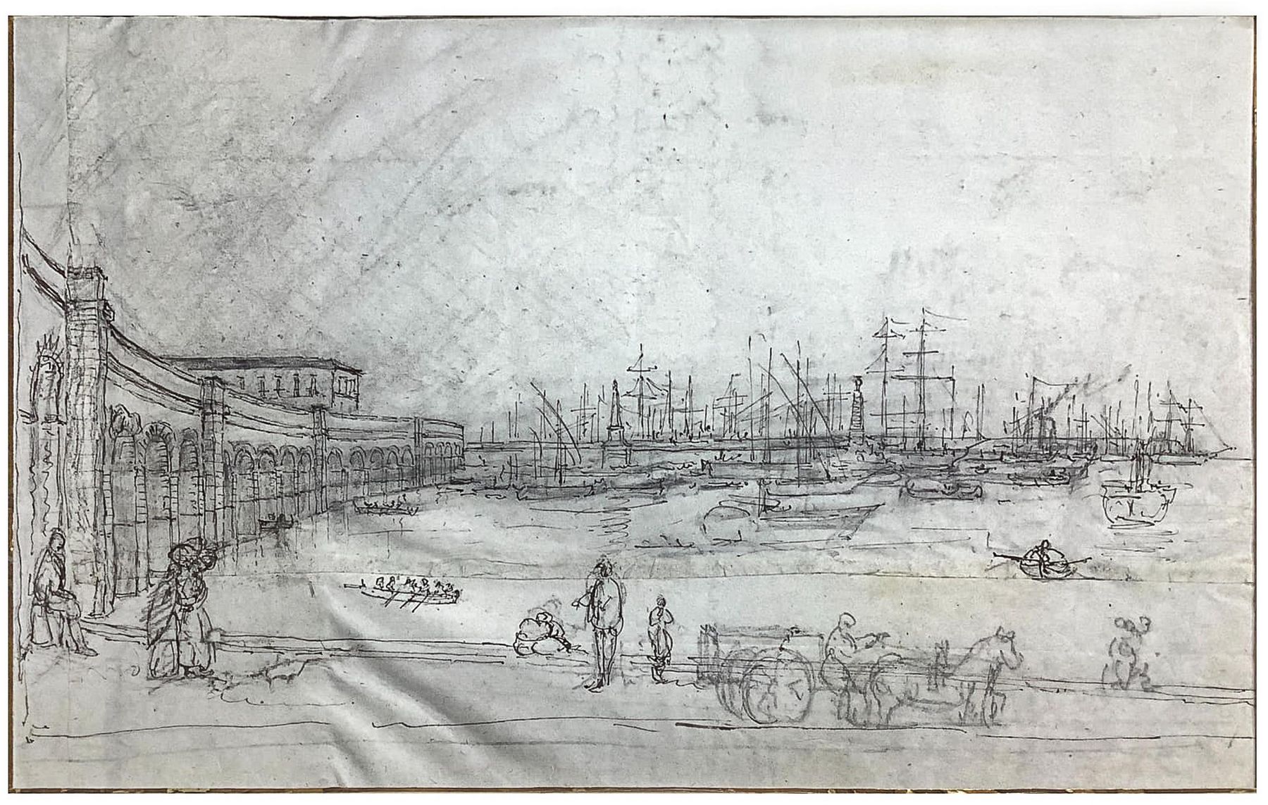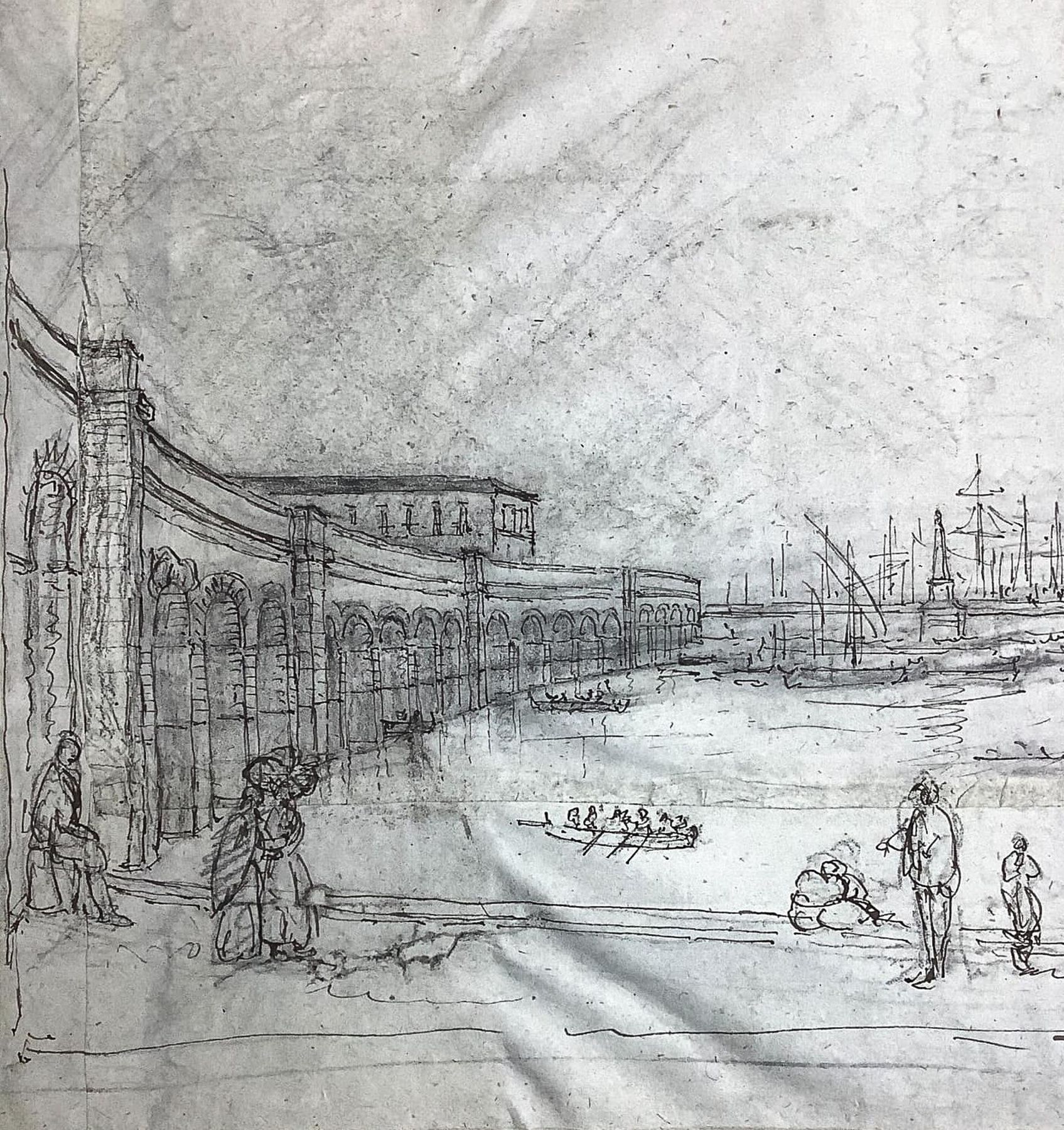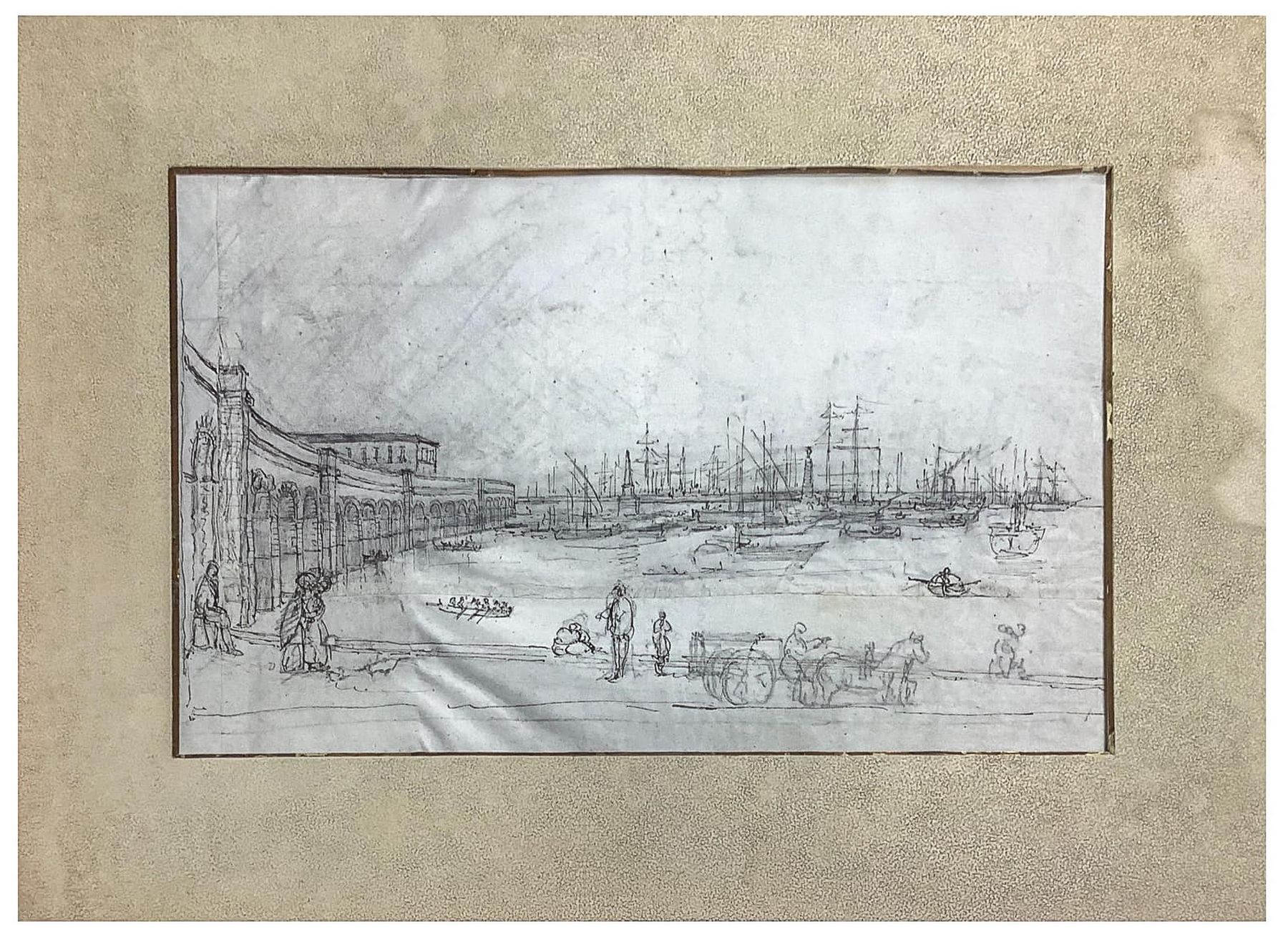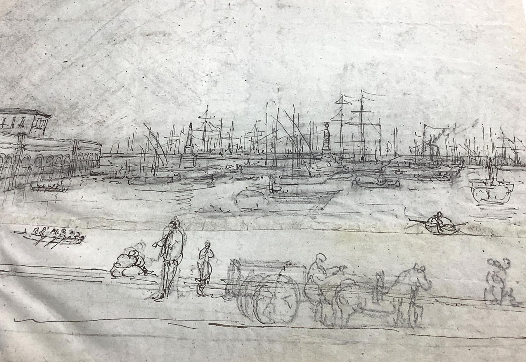 Disegno su carta raffigurante il Porto di Catatania con gli archi per la ferrovia (Catania, Sicilia), inizi XX secolo. Disegno su carta a penna e matita. Mm 200x320. Testimonianza storico-locale.
