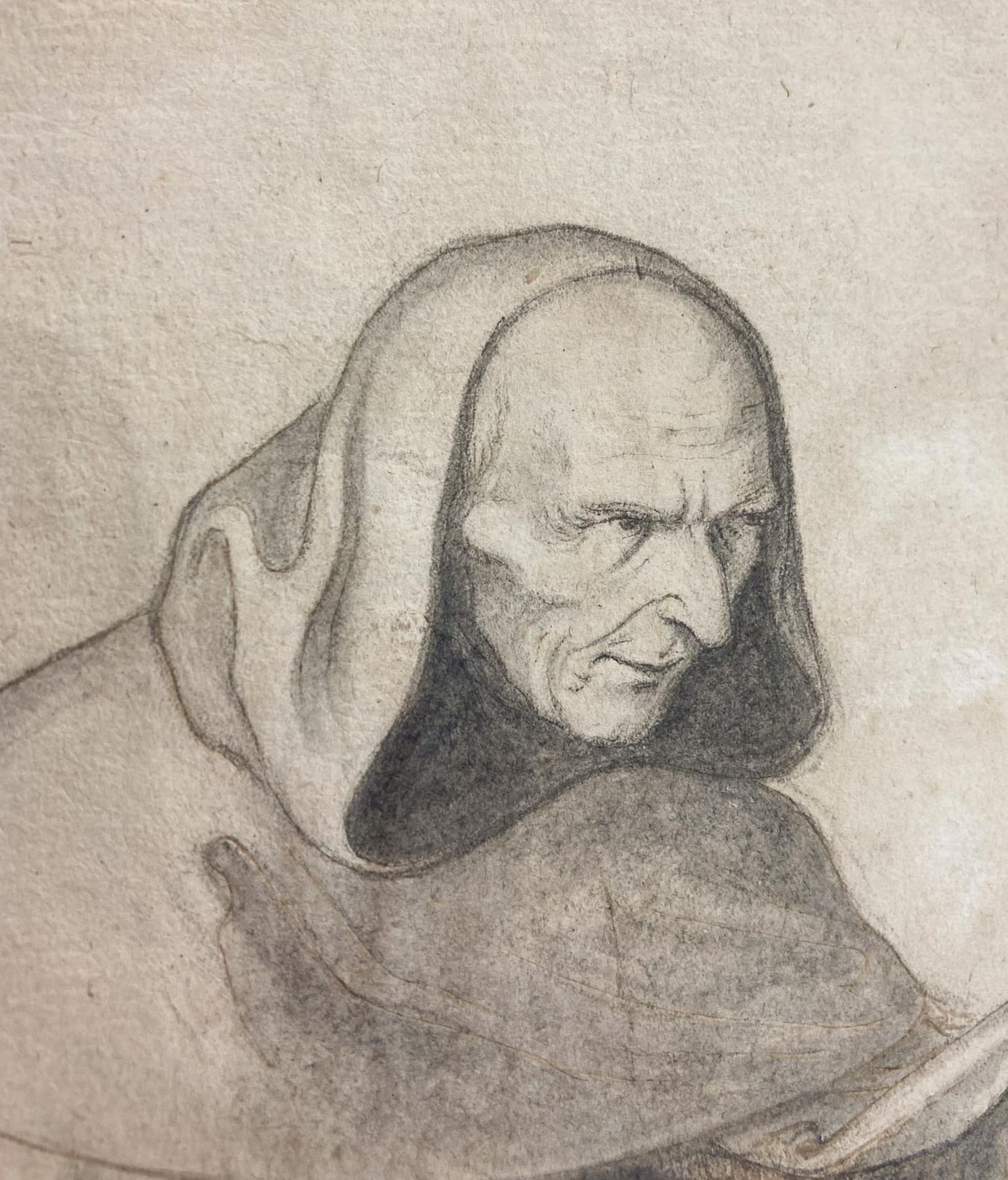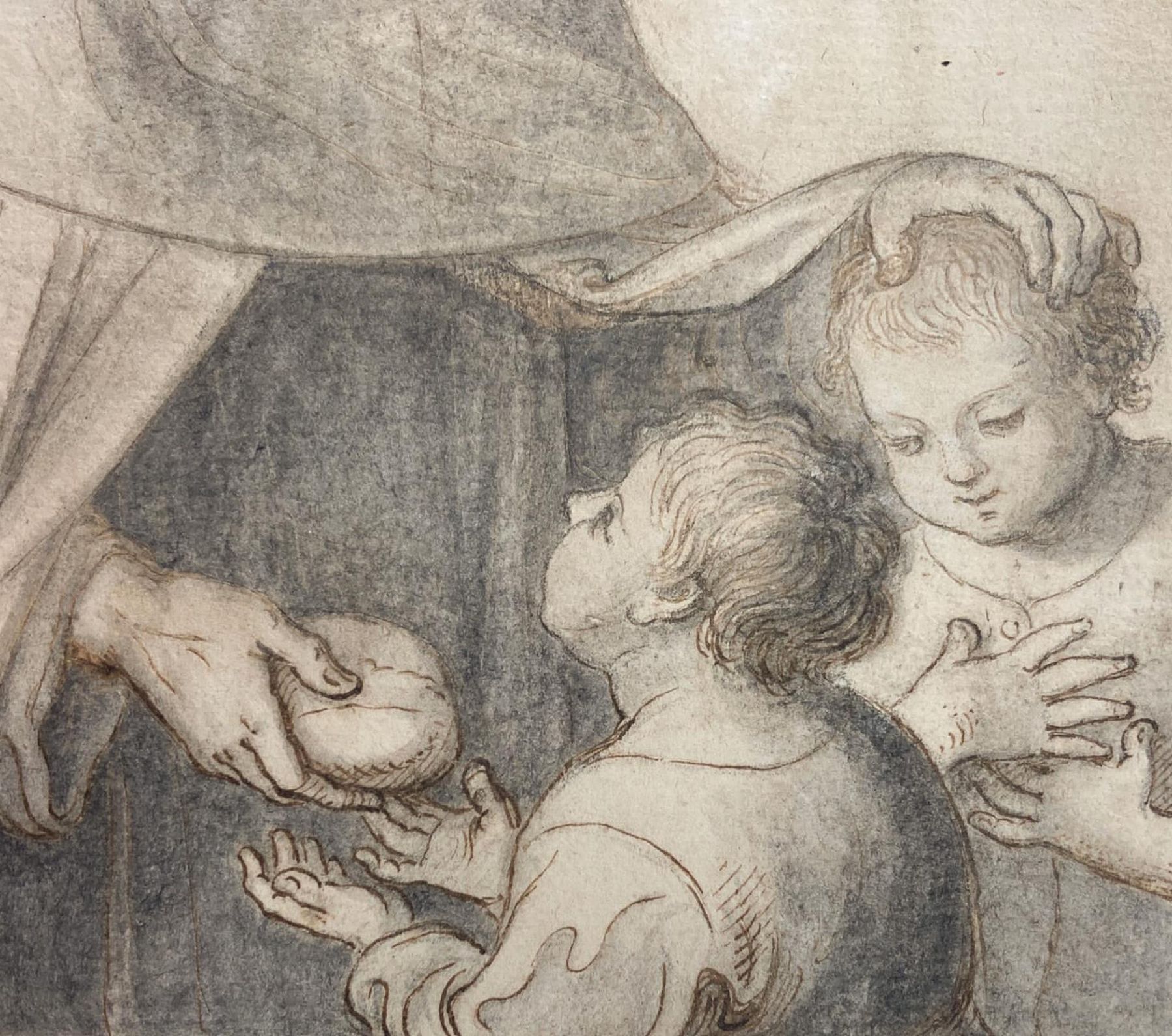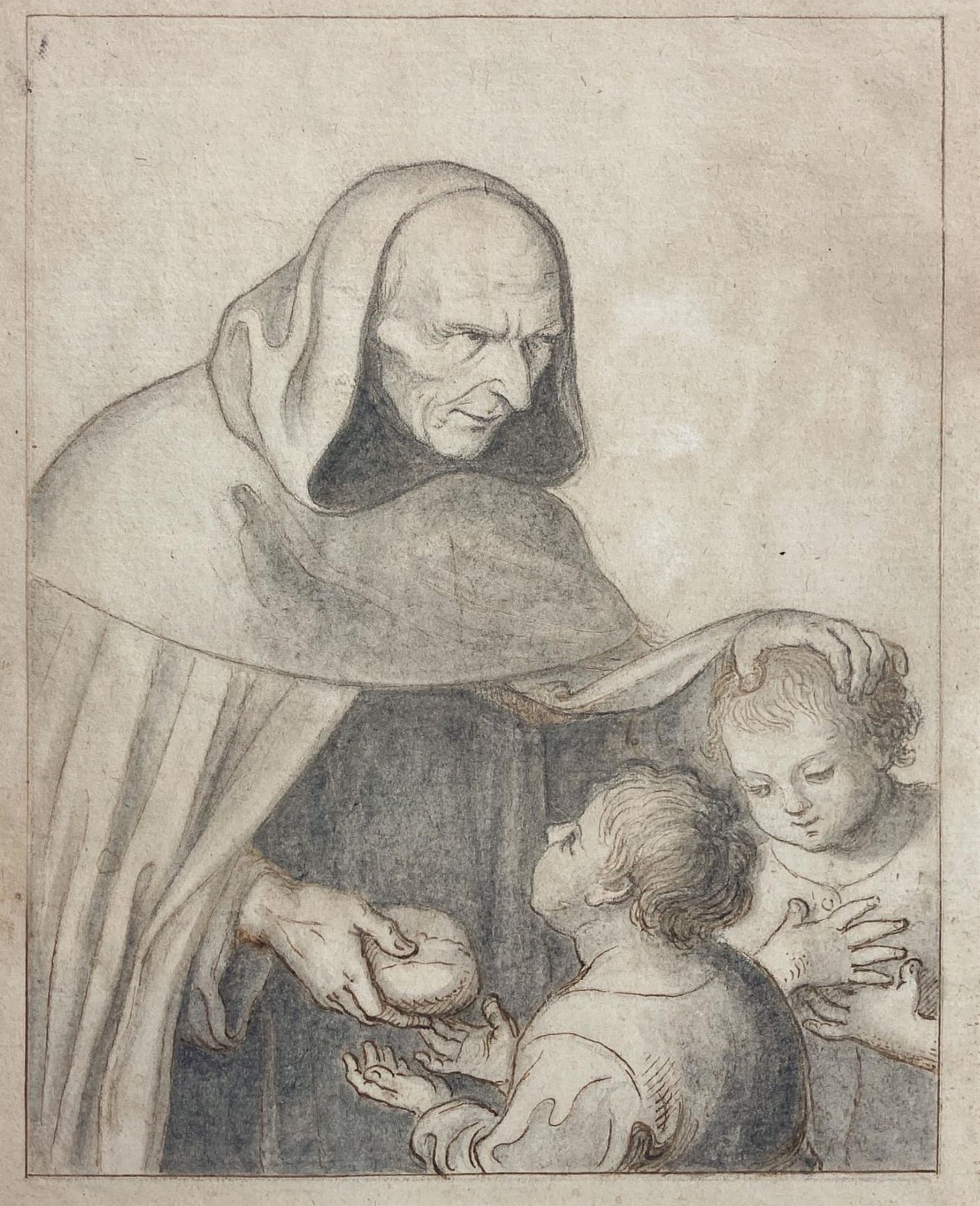 Disegno di Gramignani raffigurante Frate che porge del pane ai bambini, XIX secolo. Disegno su carta antica vergellata a inchiostro bruno e matita. Mm 170x130. Firmato sul retro Gramignani.