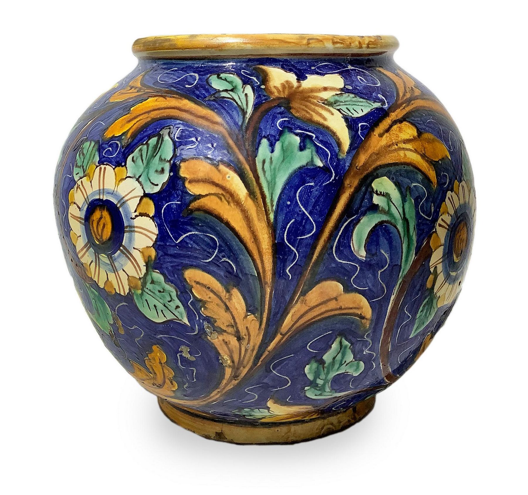 Boccia in ceramica di Caltagirone, Bottega Di Bartolo, inizi XX secolo. Decorazione floreale a foglie larghe nei modi del XIX secolo su fondo blu cobalto. H cm 36.