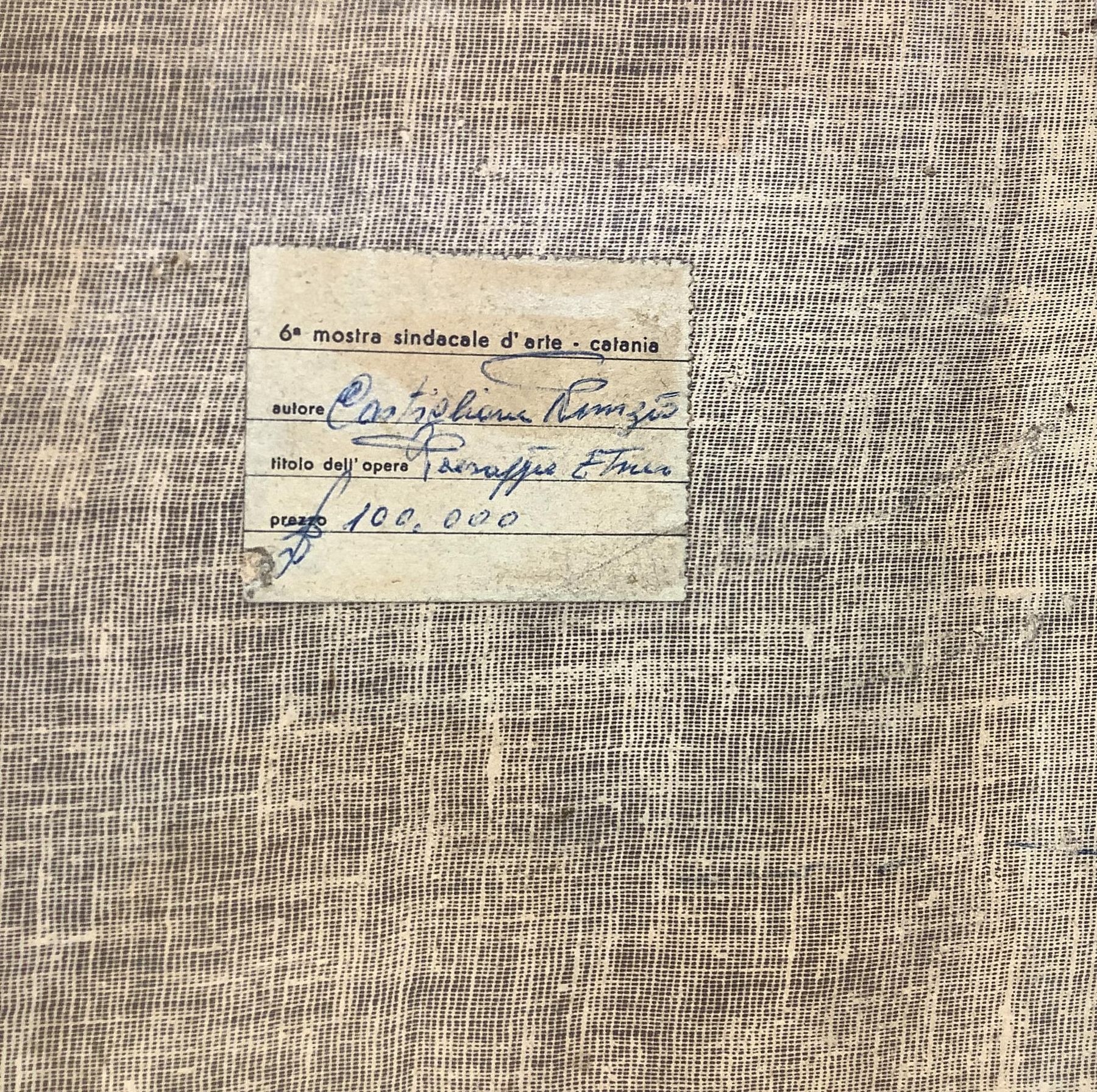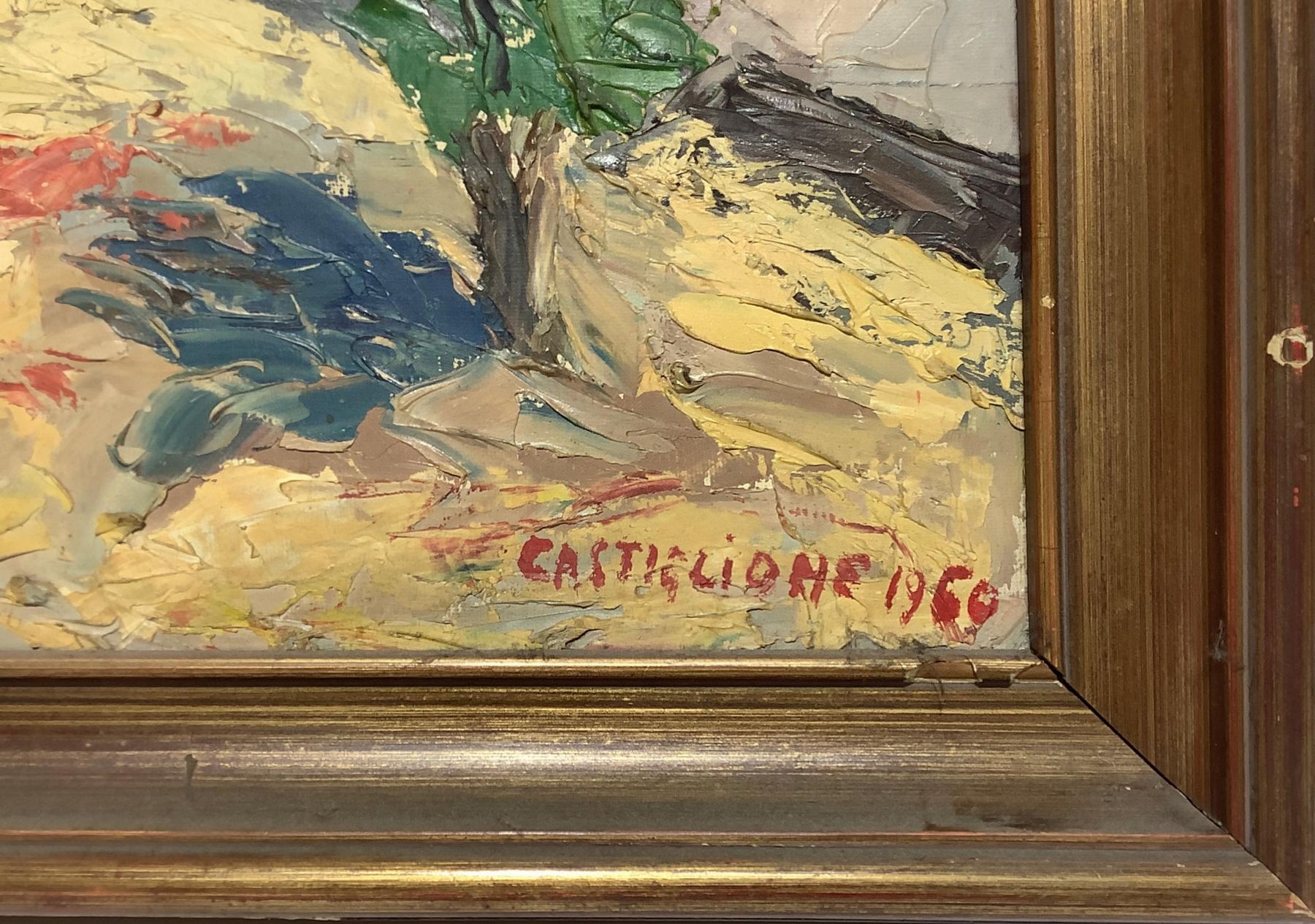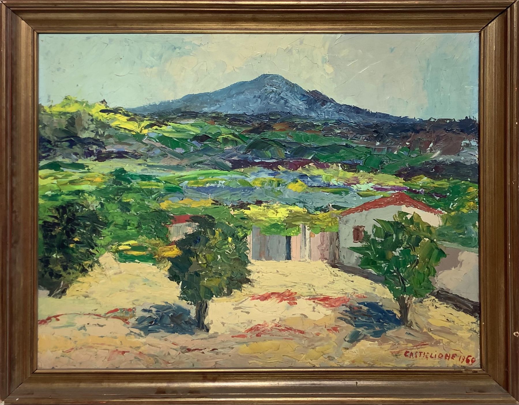 Dipinto ad olio su tavola raffigurante Etna con paesaggio di campagna. Dipinto a macchia. Firmato e datato in basso a destra Castiglione, 1960. Cm 50x60.
