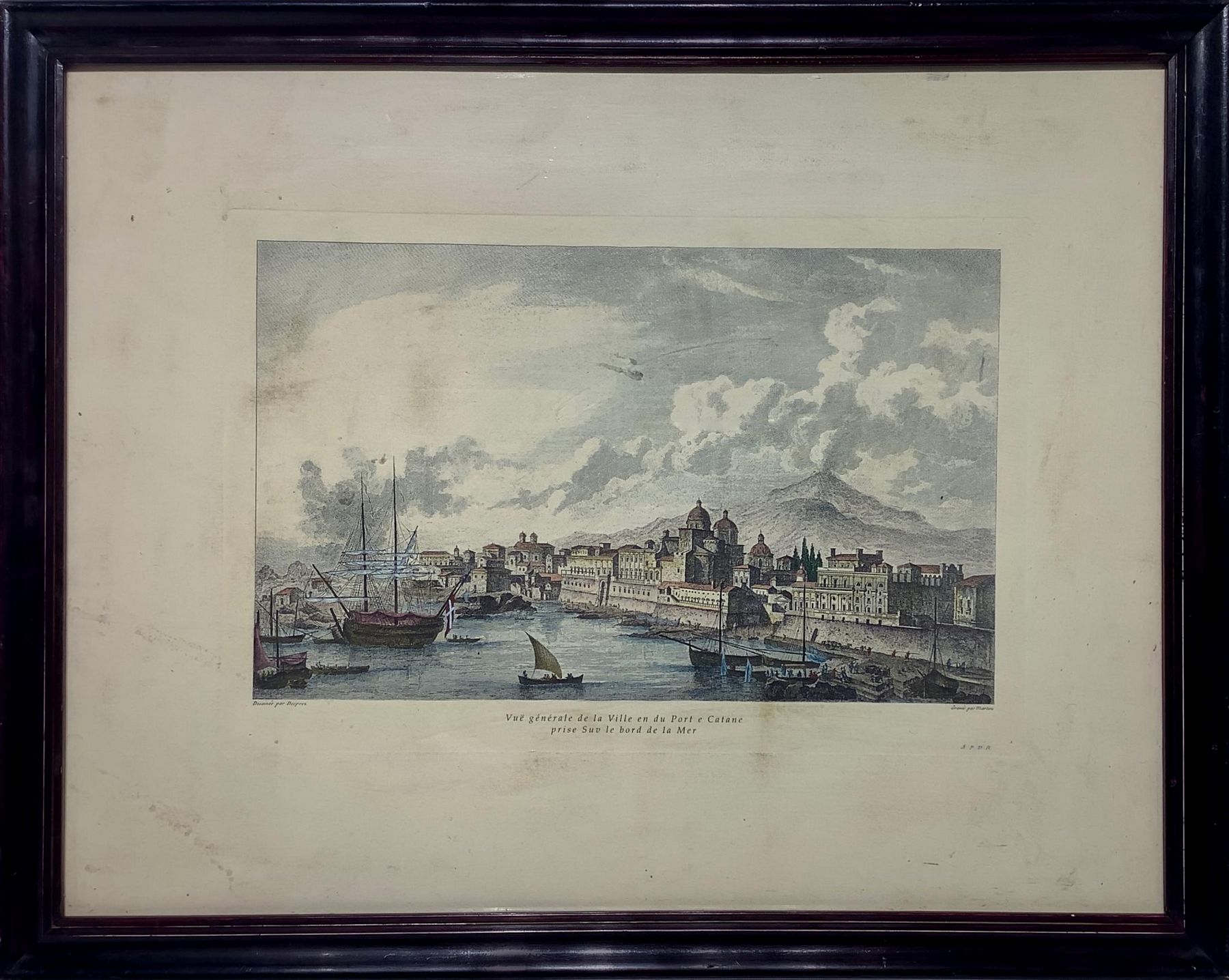 Stampa di Catania con Etna vista dal dal porto, disegnatore Louis Jean Desprez (Auxerde 1743-1804 Stoccolma). Mm 250x360. In cornice in legno di noce cm 45x56.