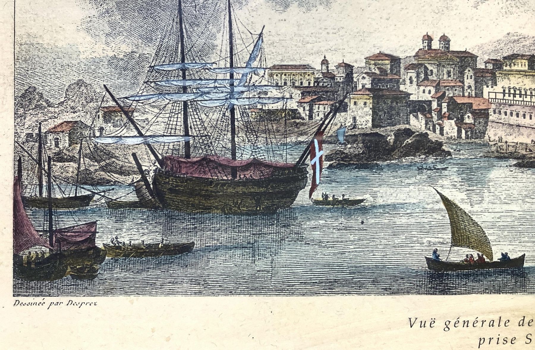 Stampa di Catania con Etna vista dal dal porto, disegnatore Louis Jean...