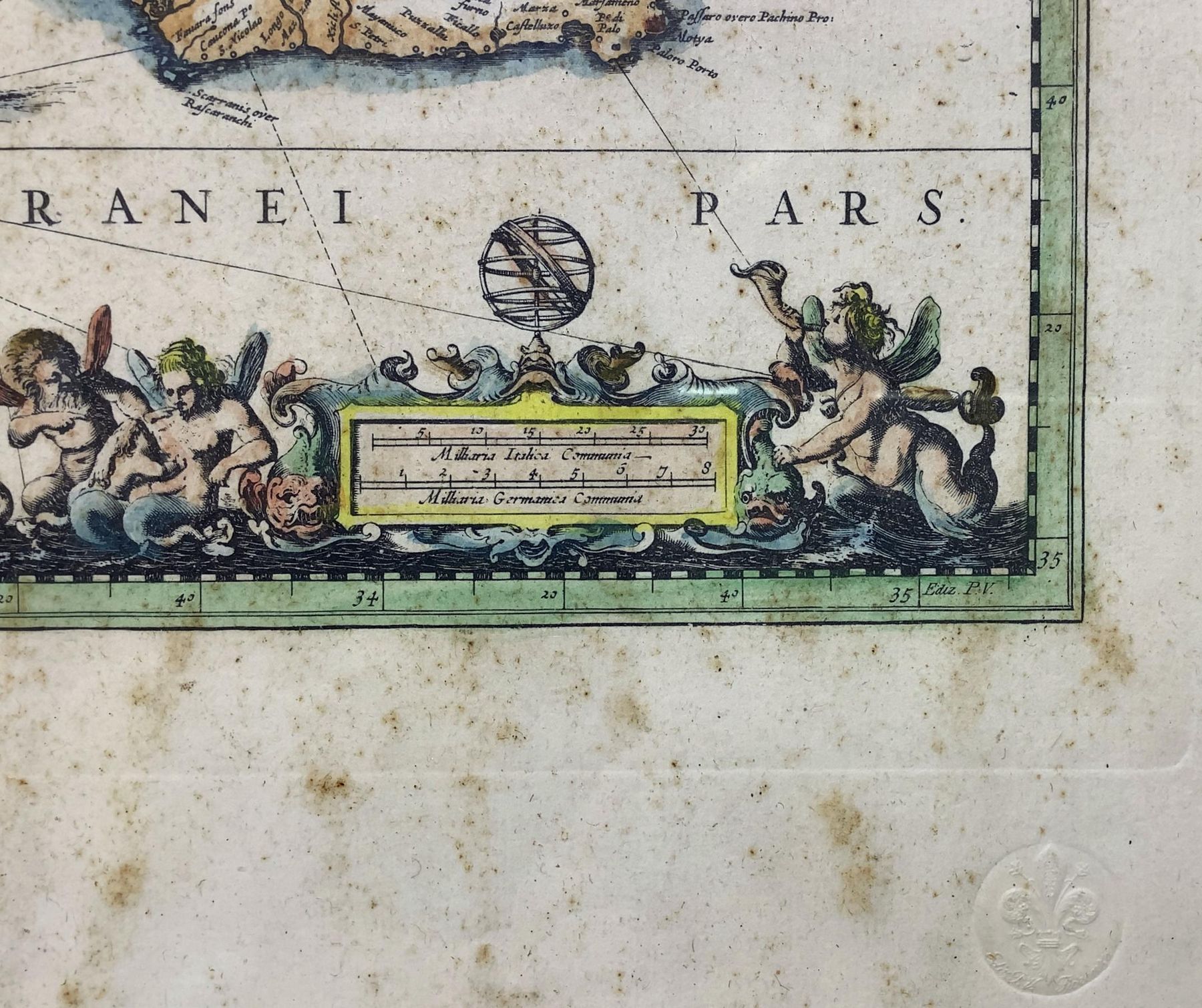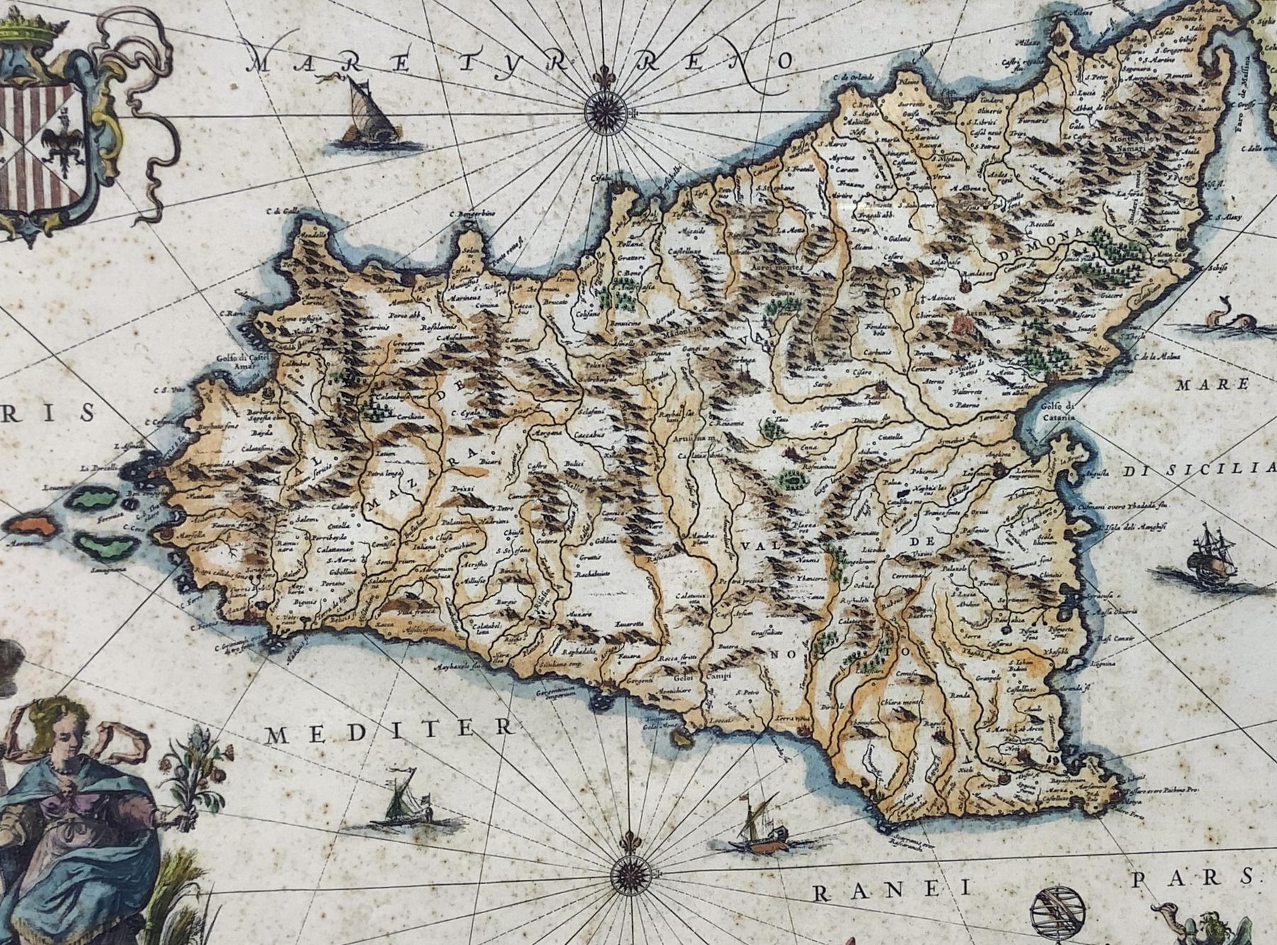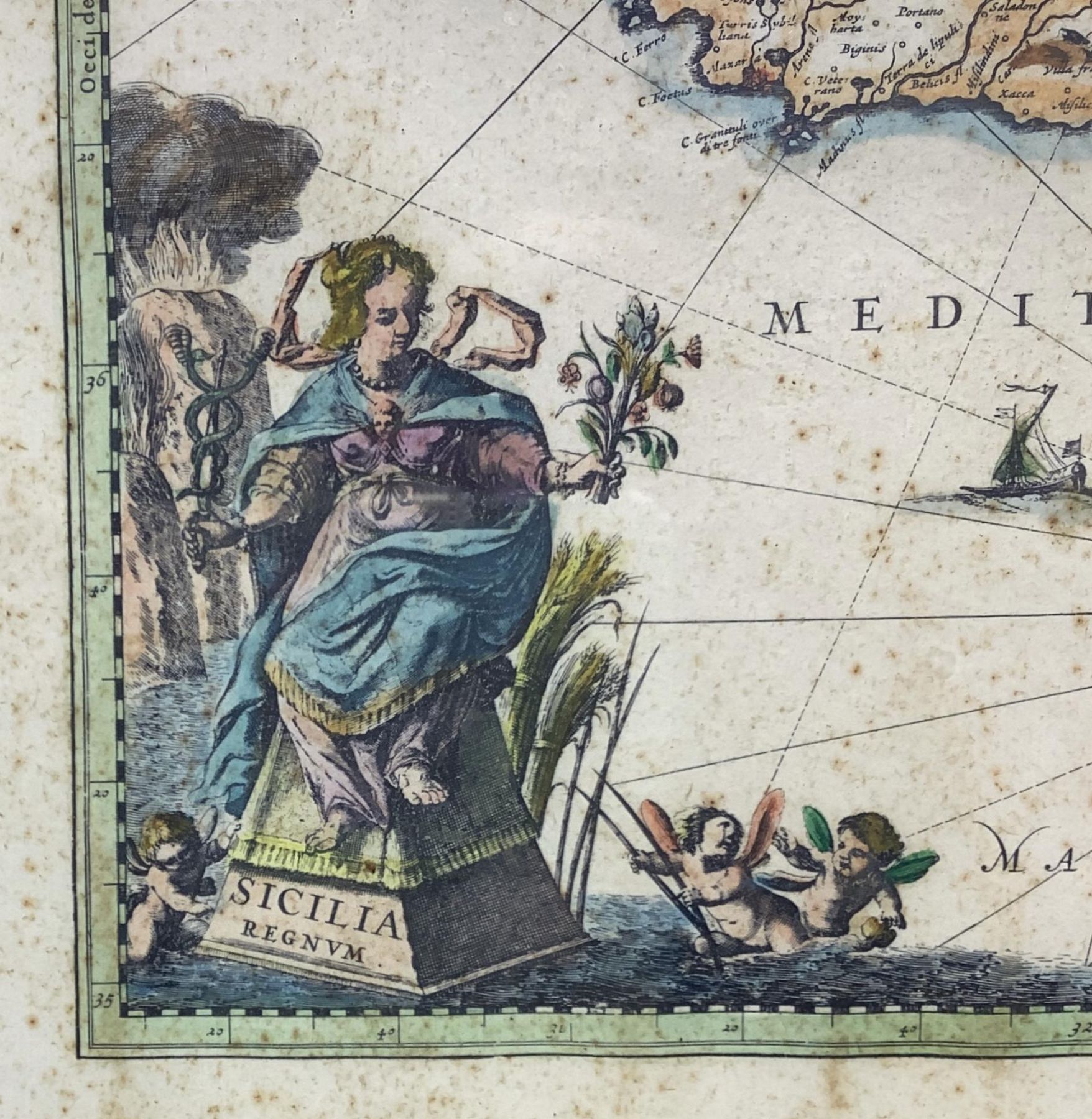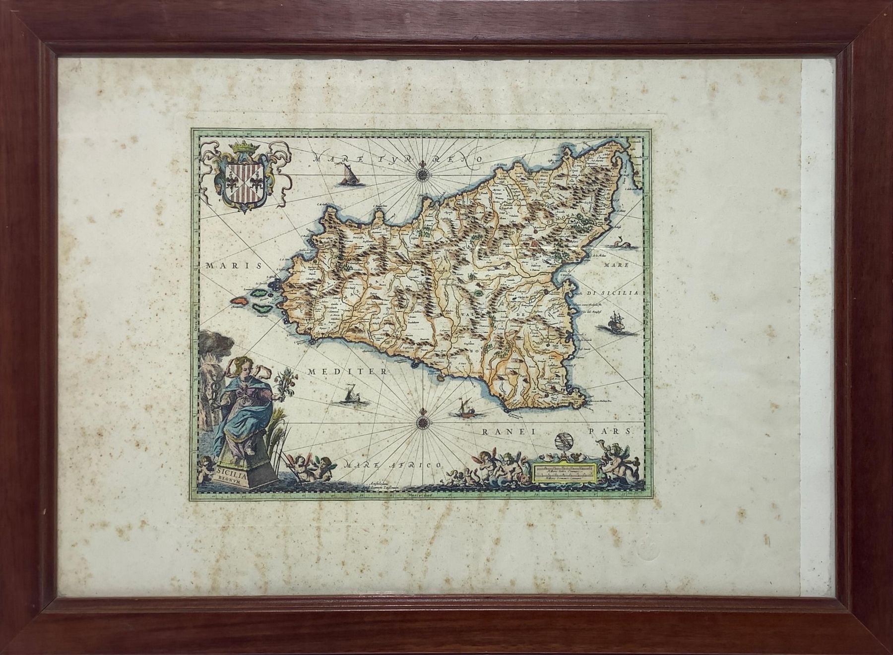 Rara incisione della “Sicilia Regnum” mm 340x490, XVII secolo incisore Joan Iambonium. In cornice cm 40x55