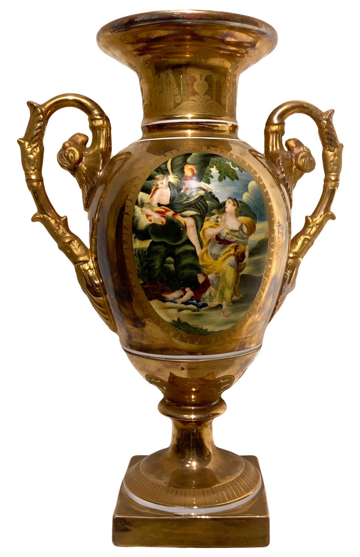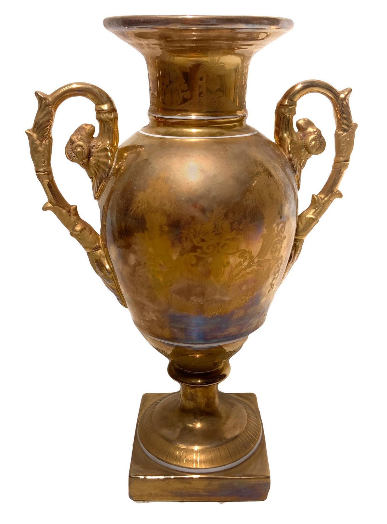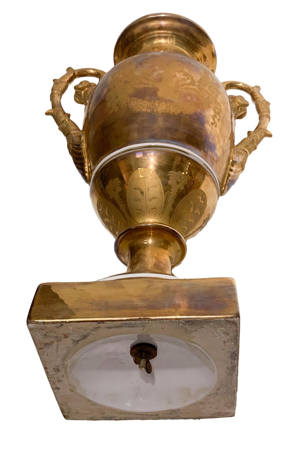 Vaso dorato con disegno frontale entro riserva ovale, Impero XIX secolo. Doratura al mercurio. H cm 49. Base cm 15x15.