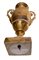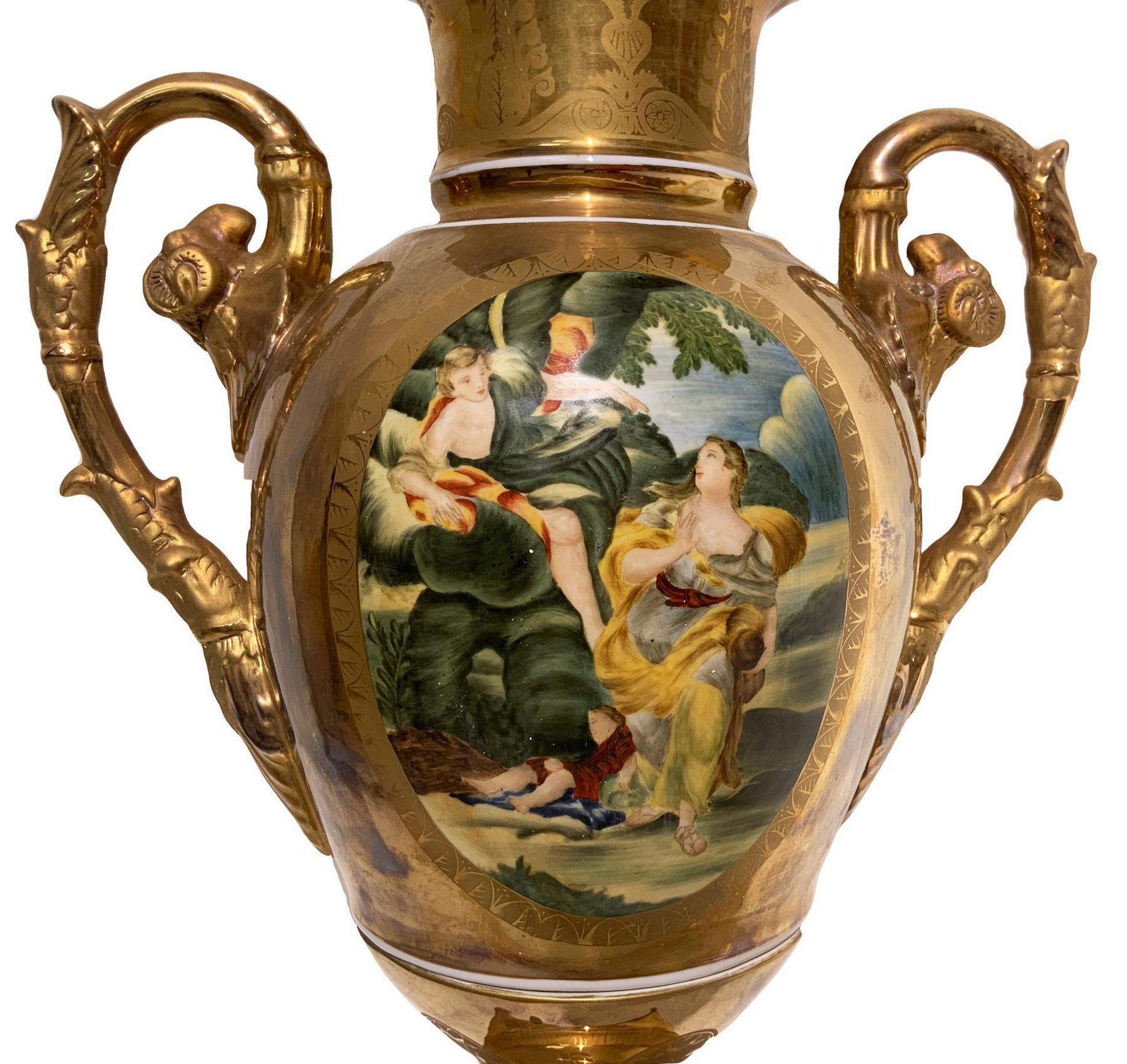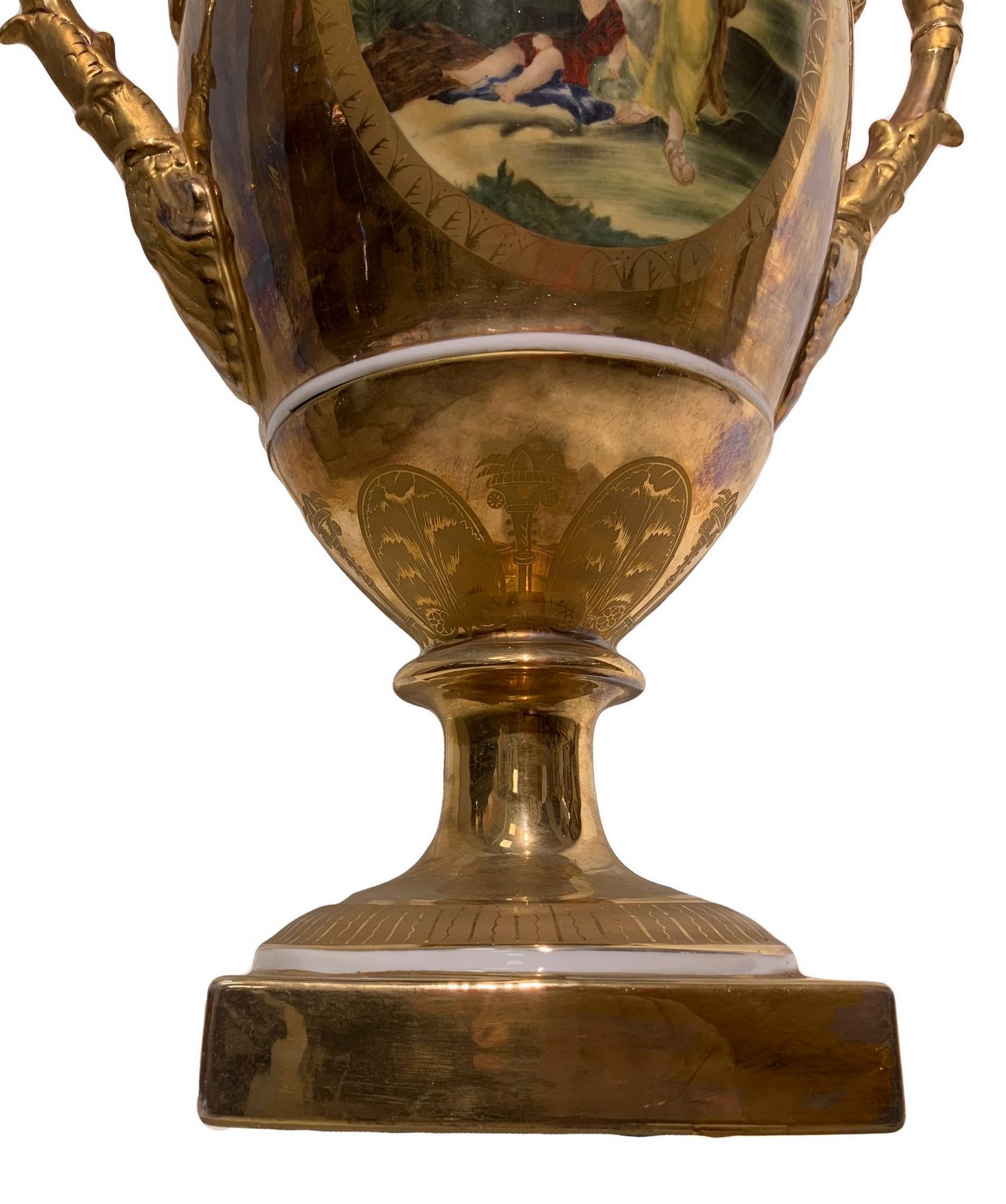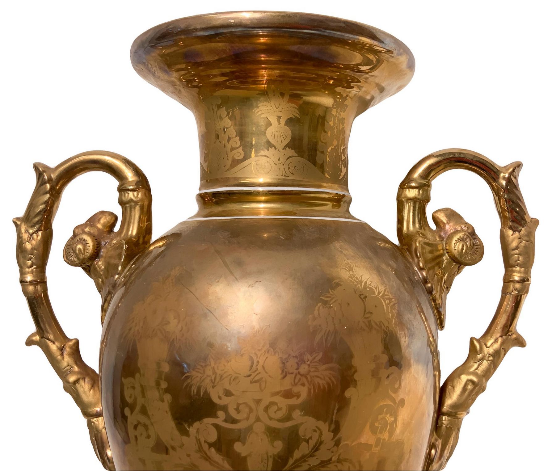 Vaso dorato con disegno frontale entro riserva ovale, Impero XIX secolo. Doratura al mercurio. H cm 49. Base cm 15x15.