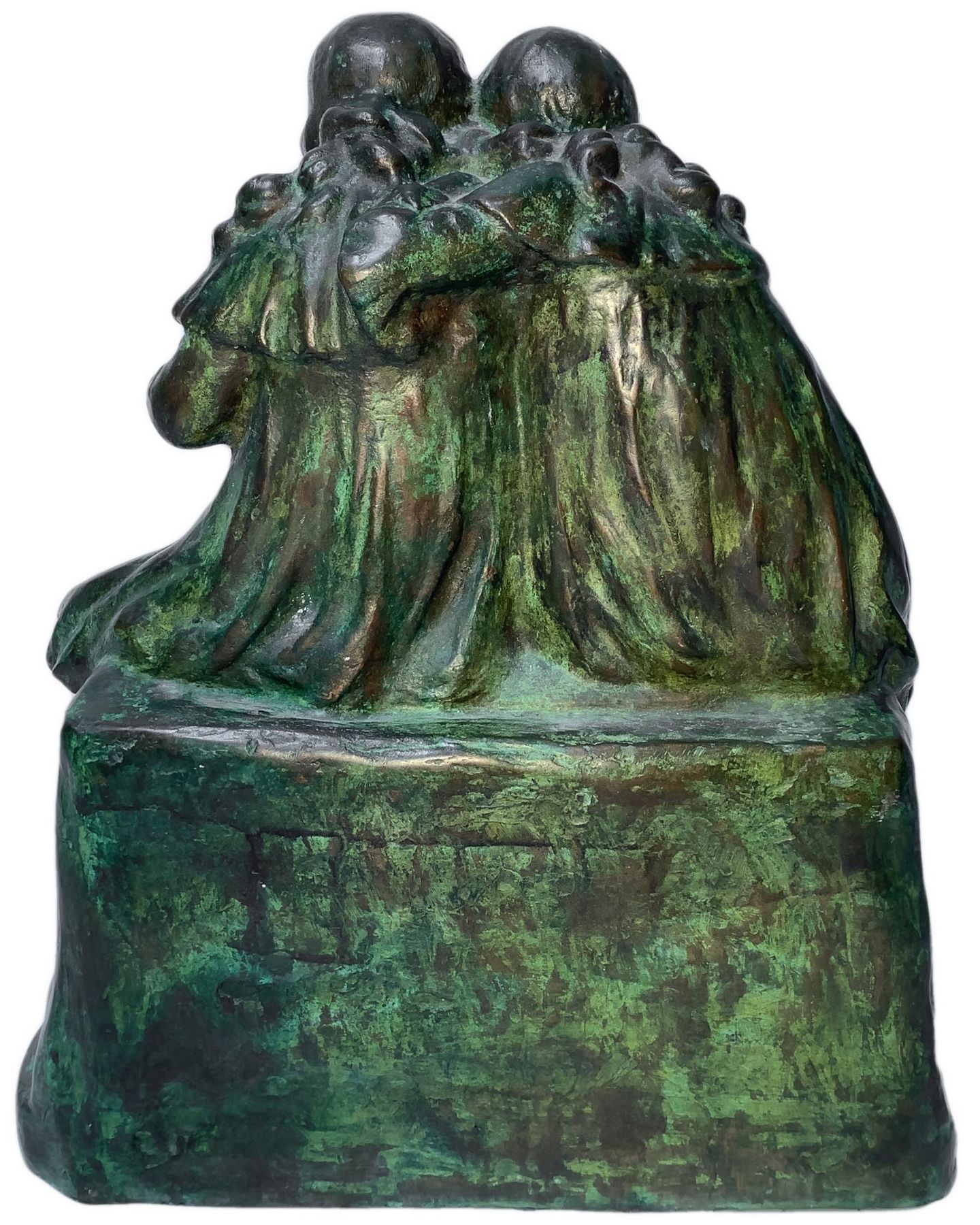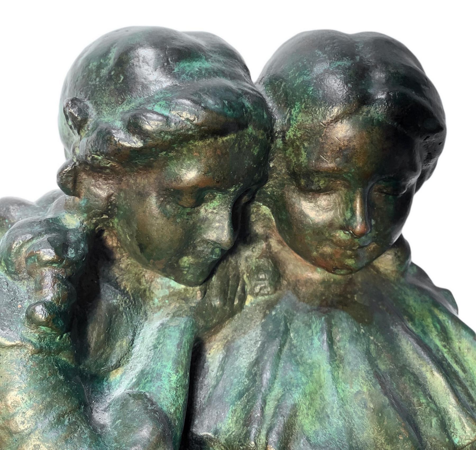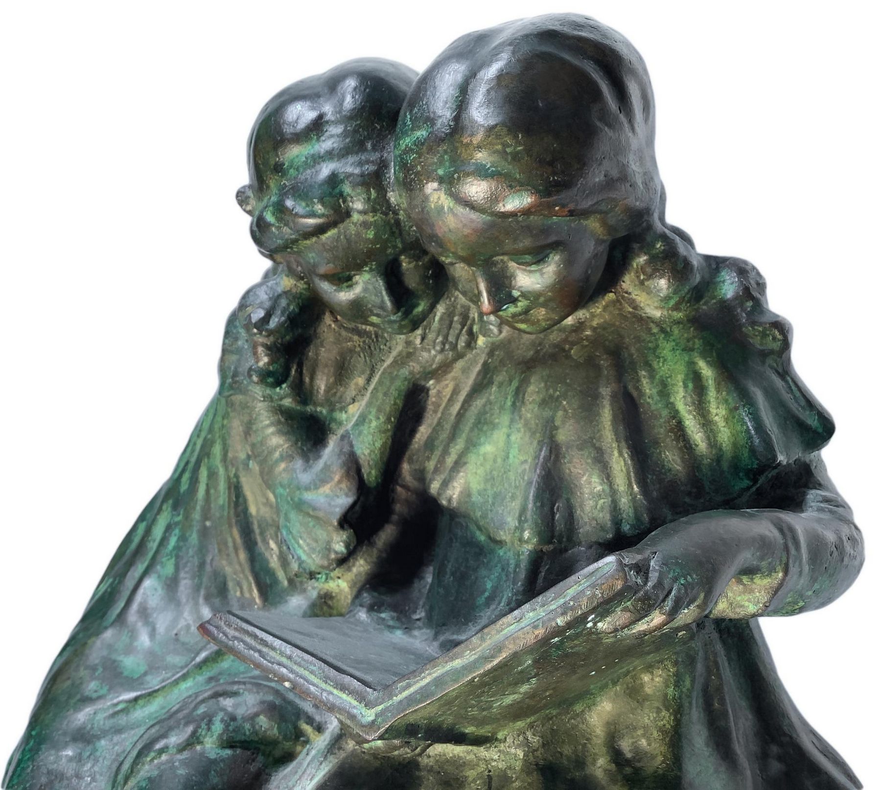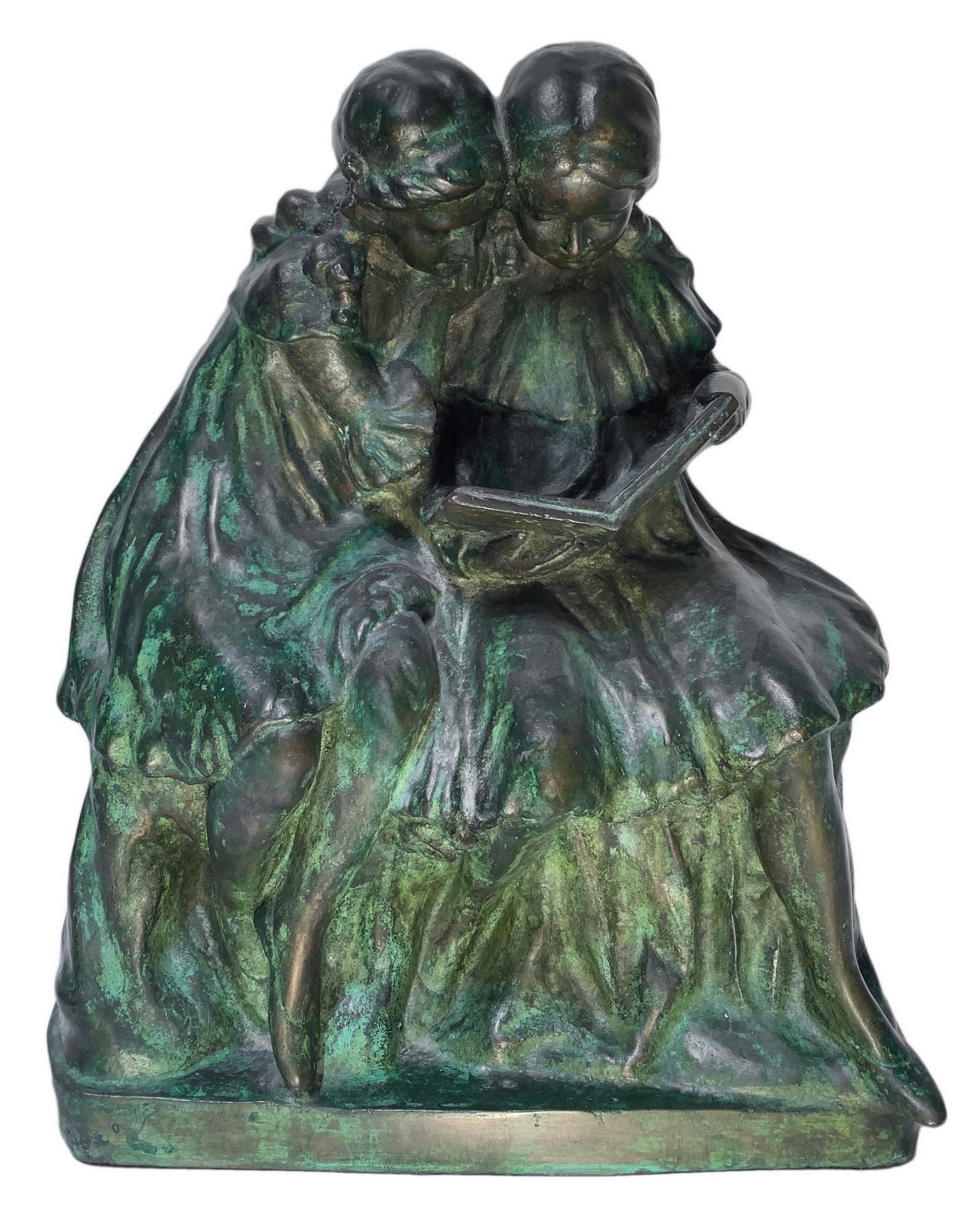 Bronzo patinato verde a cera persa, raffigurante due bimbe che leggono, inizi XX secolo. H cm 46x38