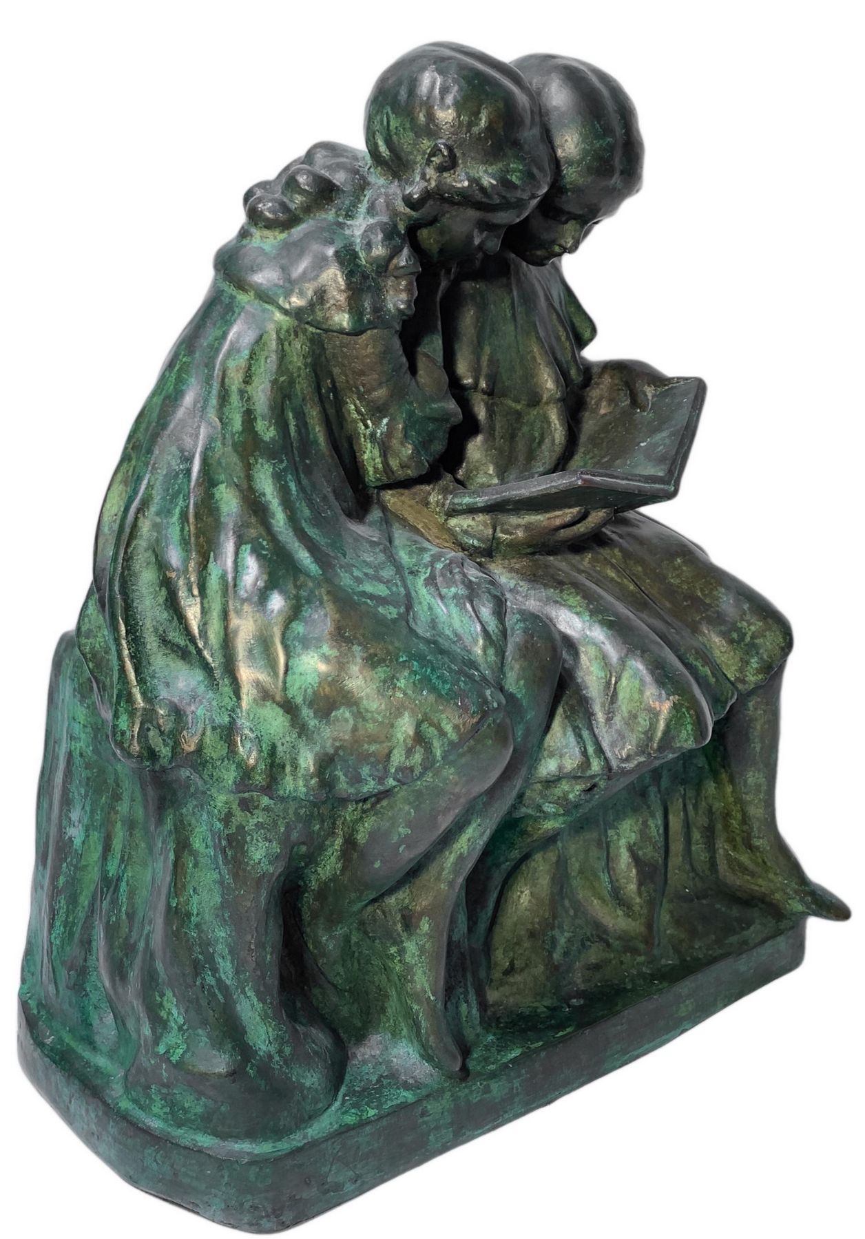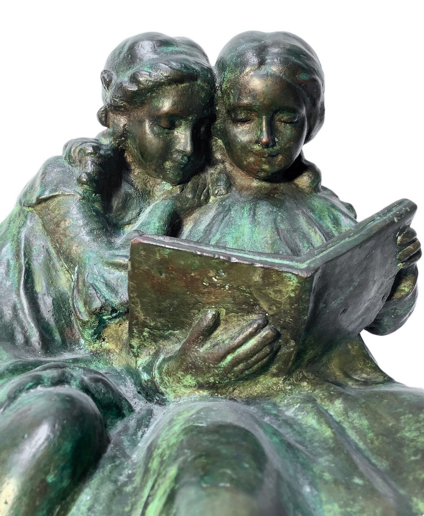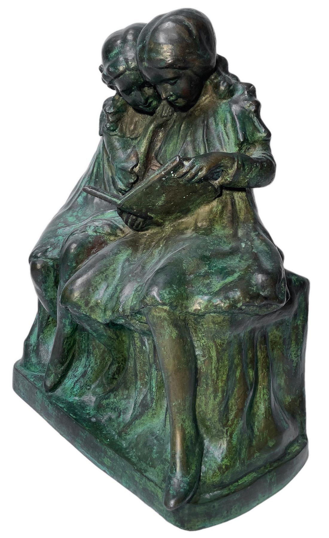 Bronzo patinato verde a cera persa, raffigurante due bimbe che leggono, inizi...