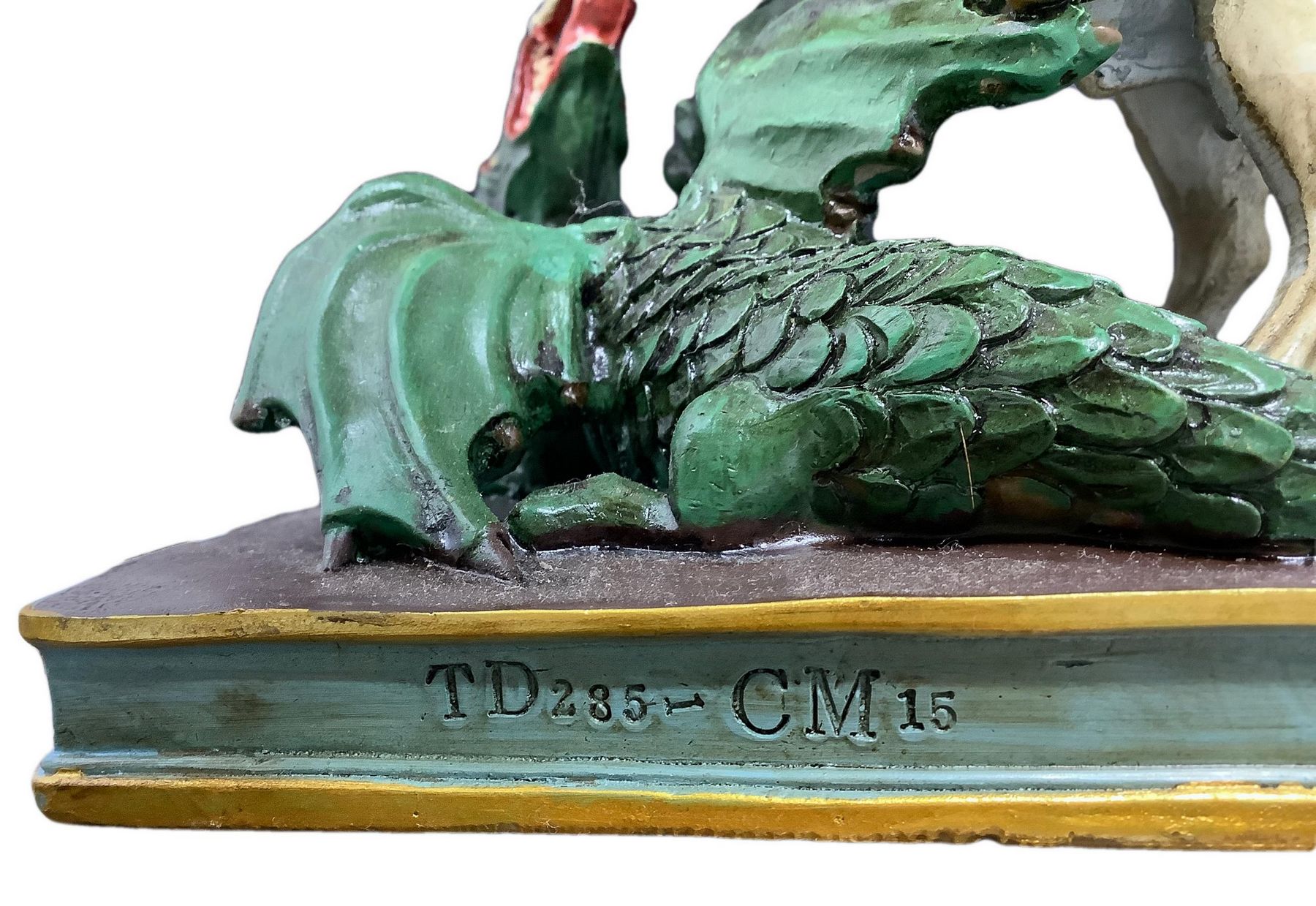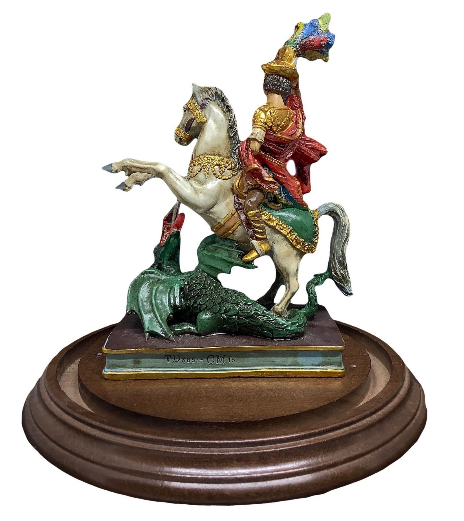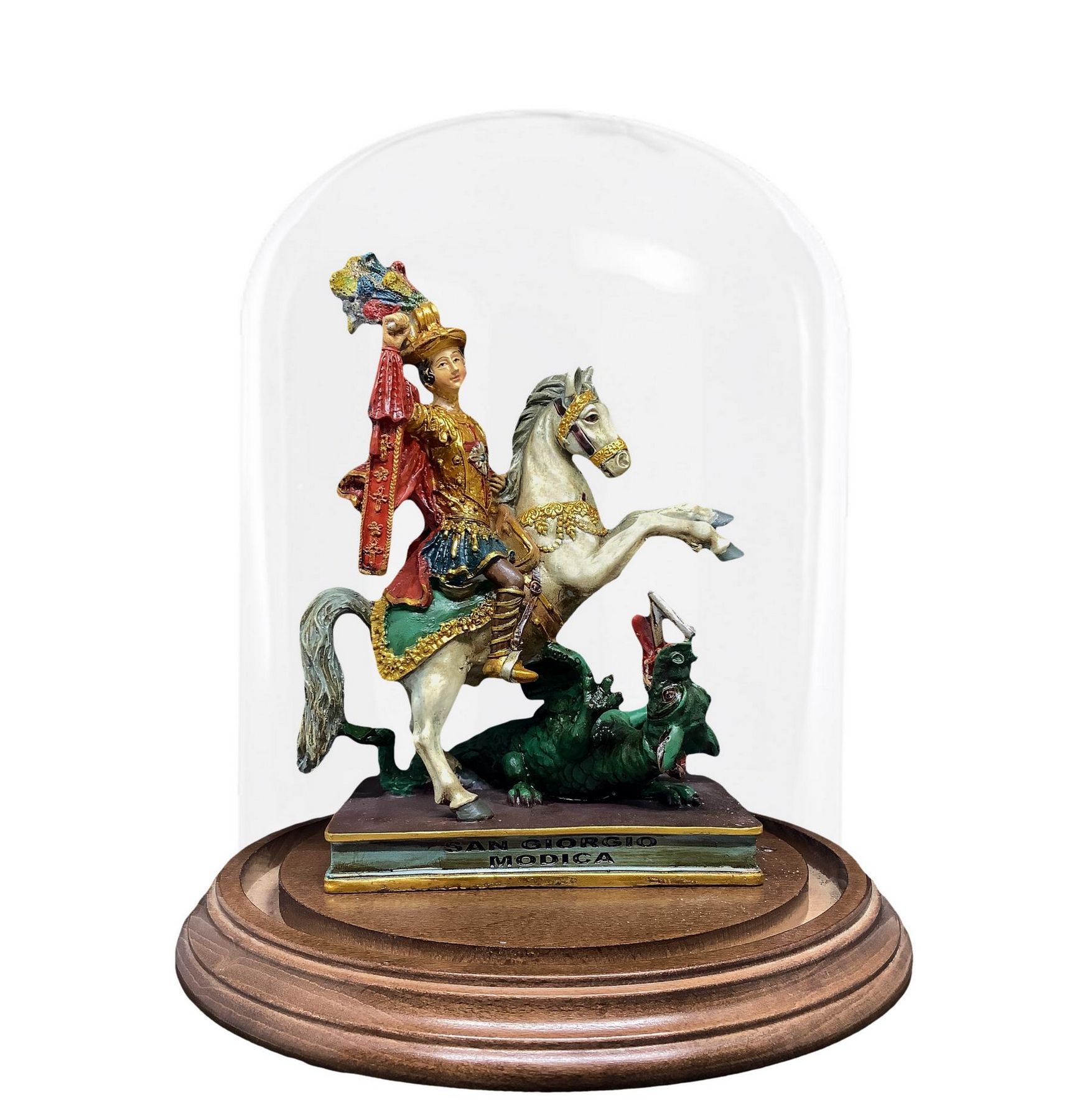 Statuina di San Giorgio a cavallo in teca di vetro, XX secolo. H cm 28x17
