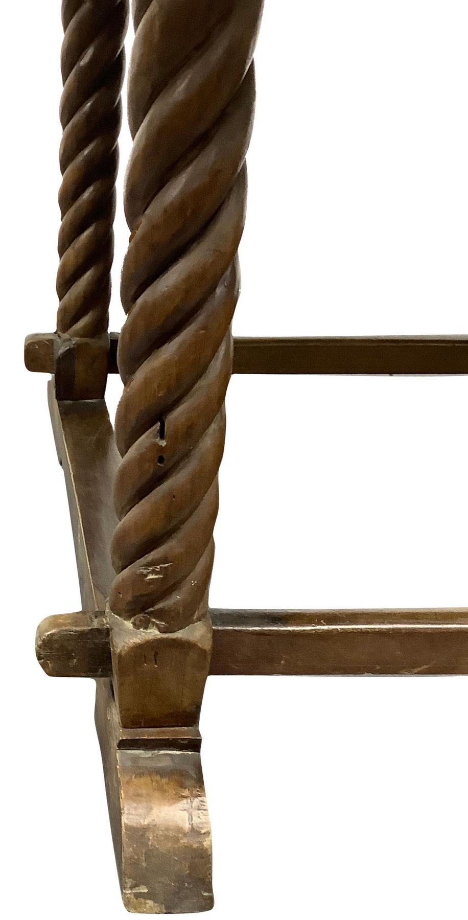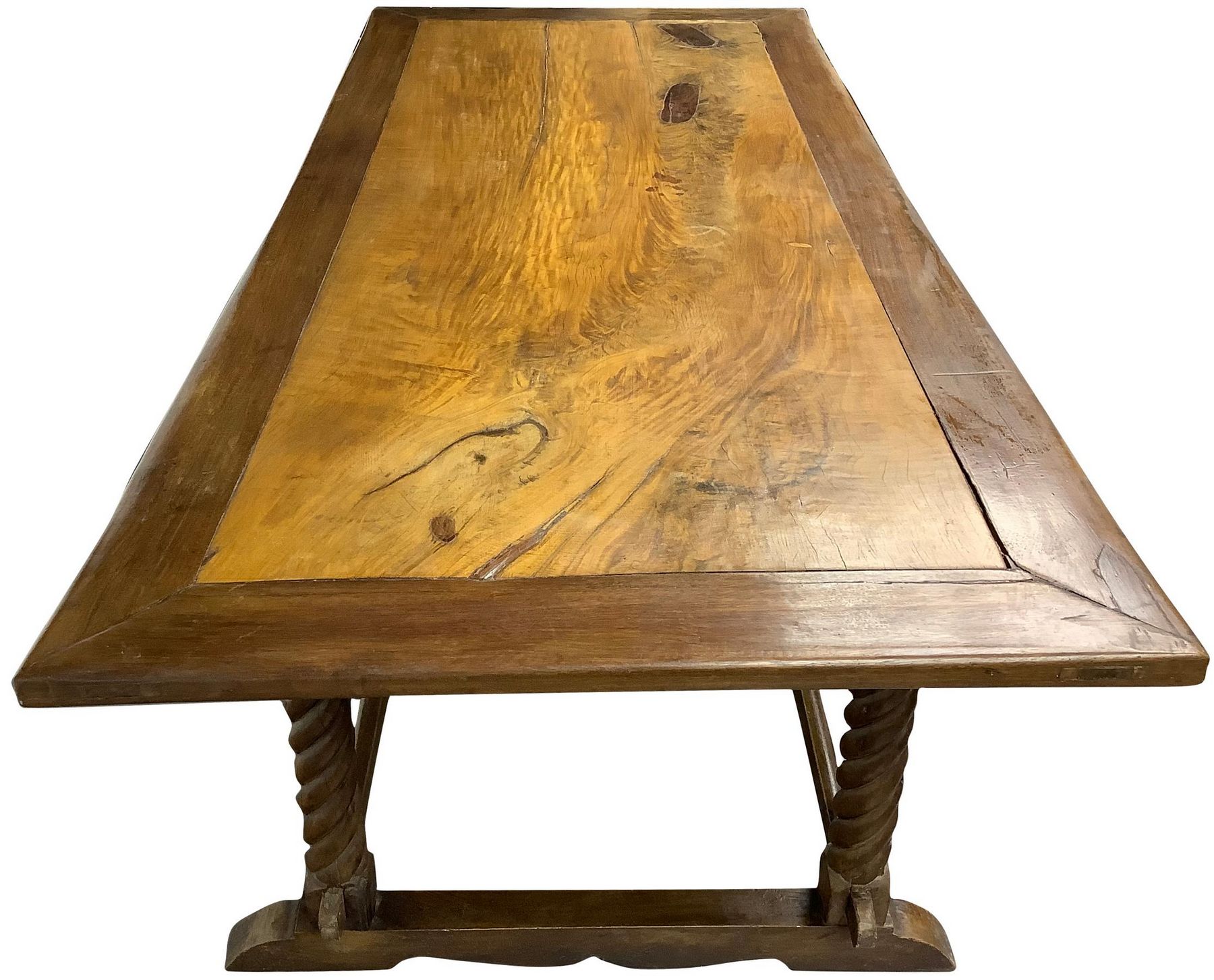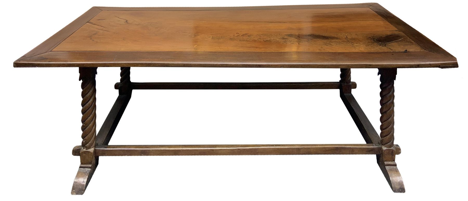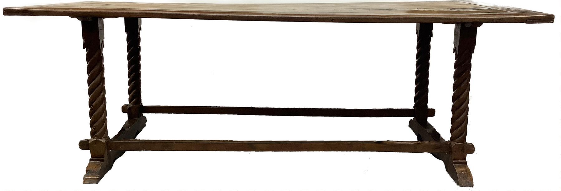 Tavolo fratino in legno di noce, quattro gambe a torchon con legacci orizzontali in ambo i lati. Fine XVII secolo. H Cm 75. Cm 225x95.