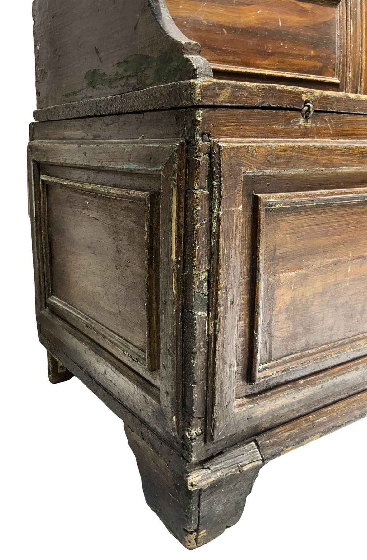 Cassapanca siciliana in legno di abete laccato marrone, XVII/XVIII secolo....