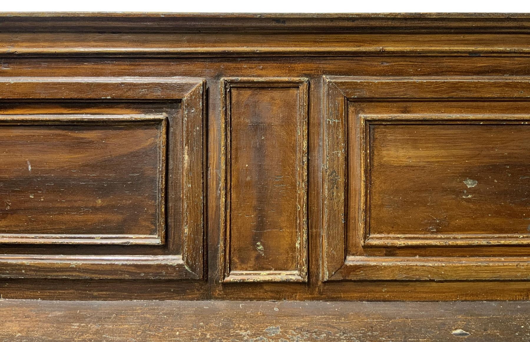 Cassapanca siciliana in legno di abete laccato marrone, XVII/XVIII secolo. Adattabile a letto. H cm 97x190x47. Mai restaurata.