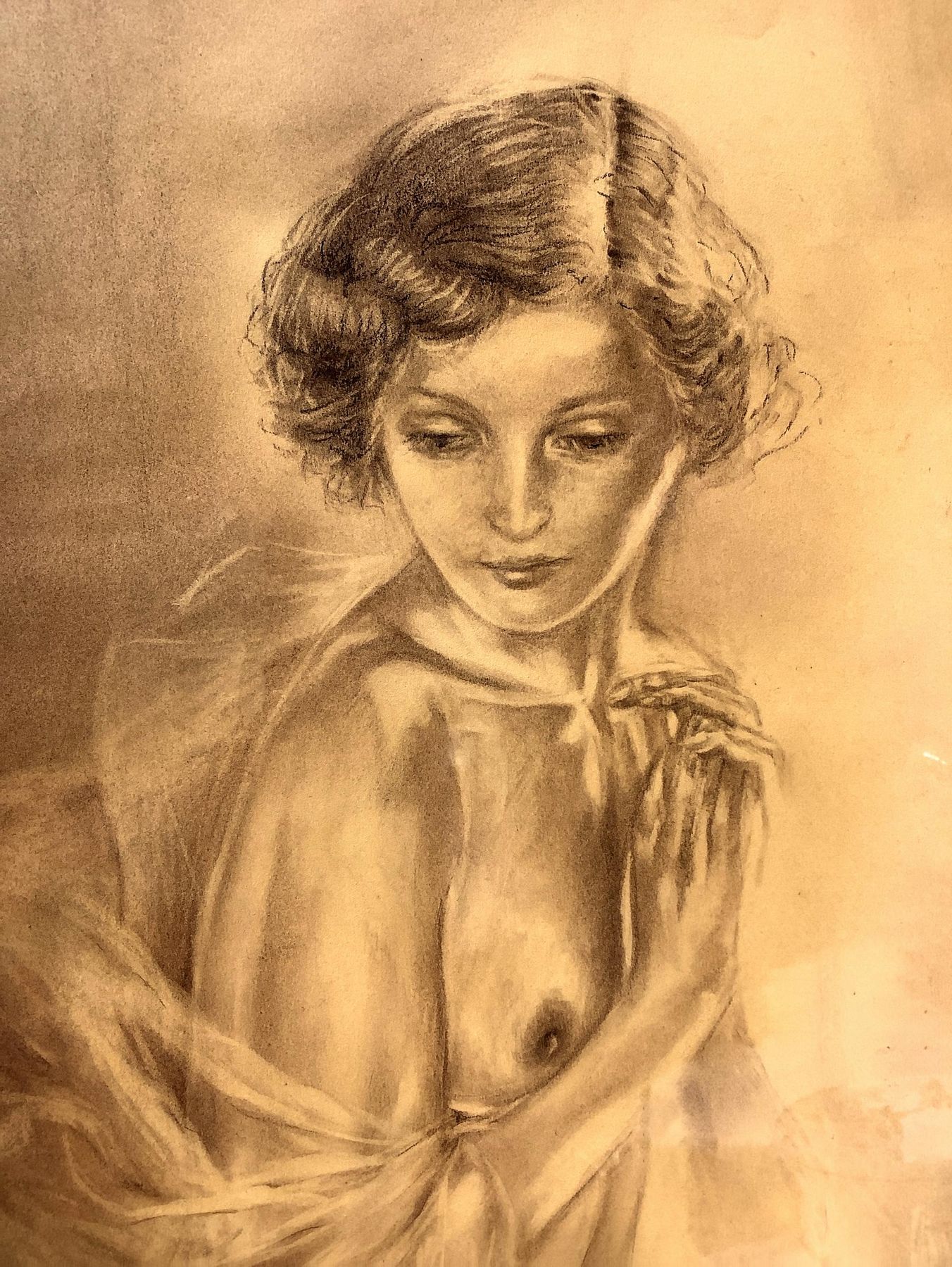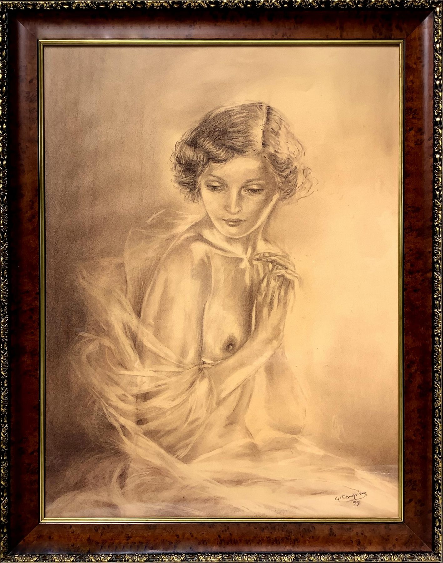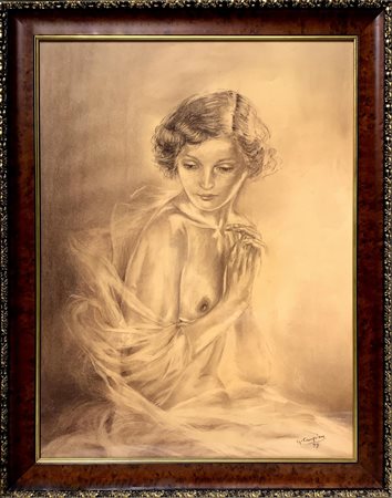 Disegno a seppia raffigurante mezzo busto nudo di donna. Firmato G. Campione. Cm 61x45, in cornice cm 71,5x56,5