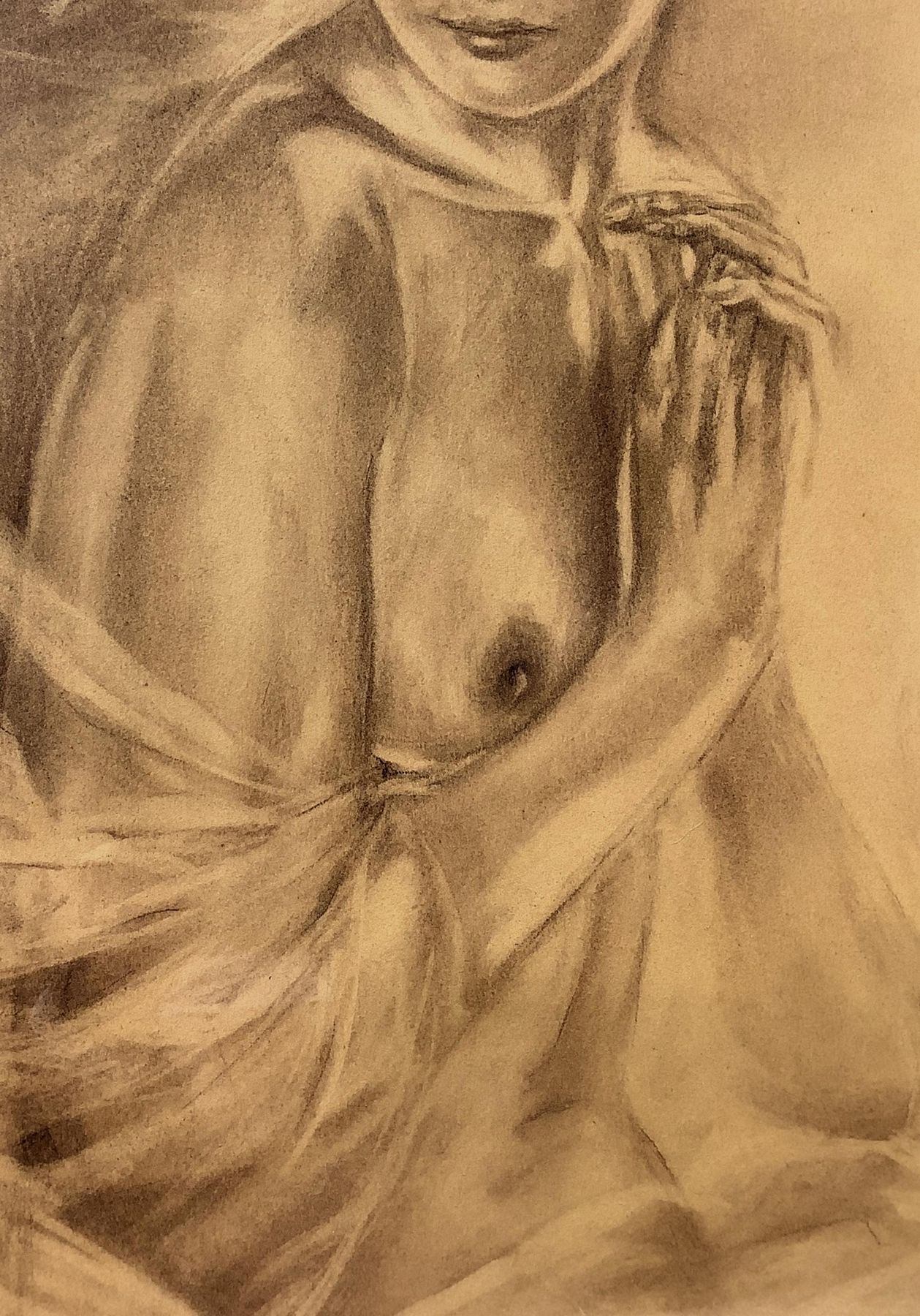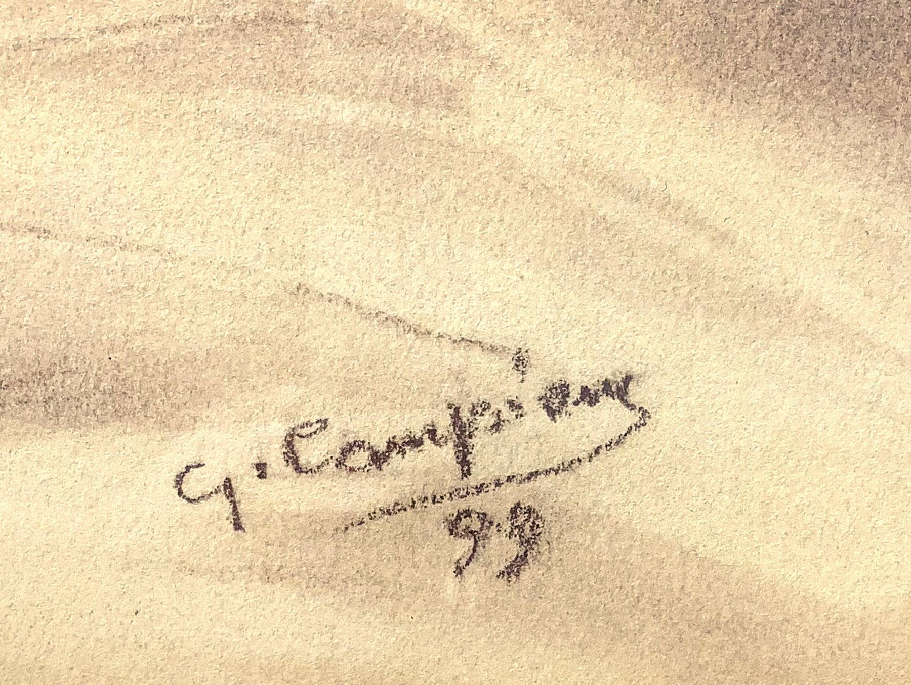 Disegno a seppia raffigurante mezzo busto nudo di donna. Firmato G. Campione....