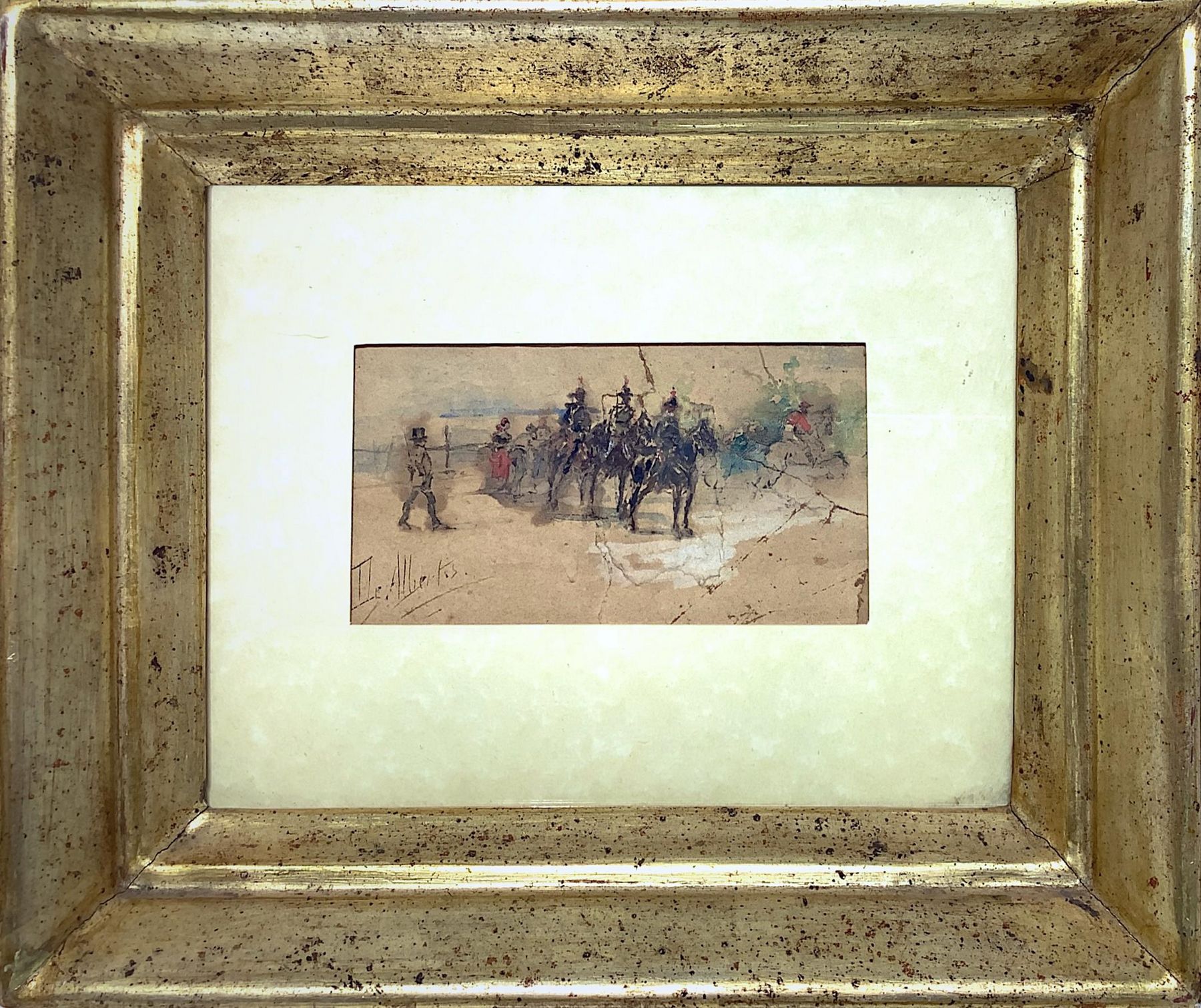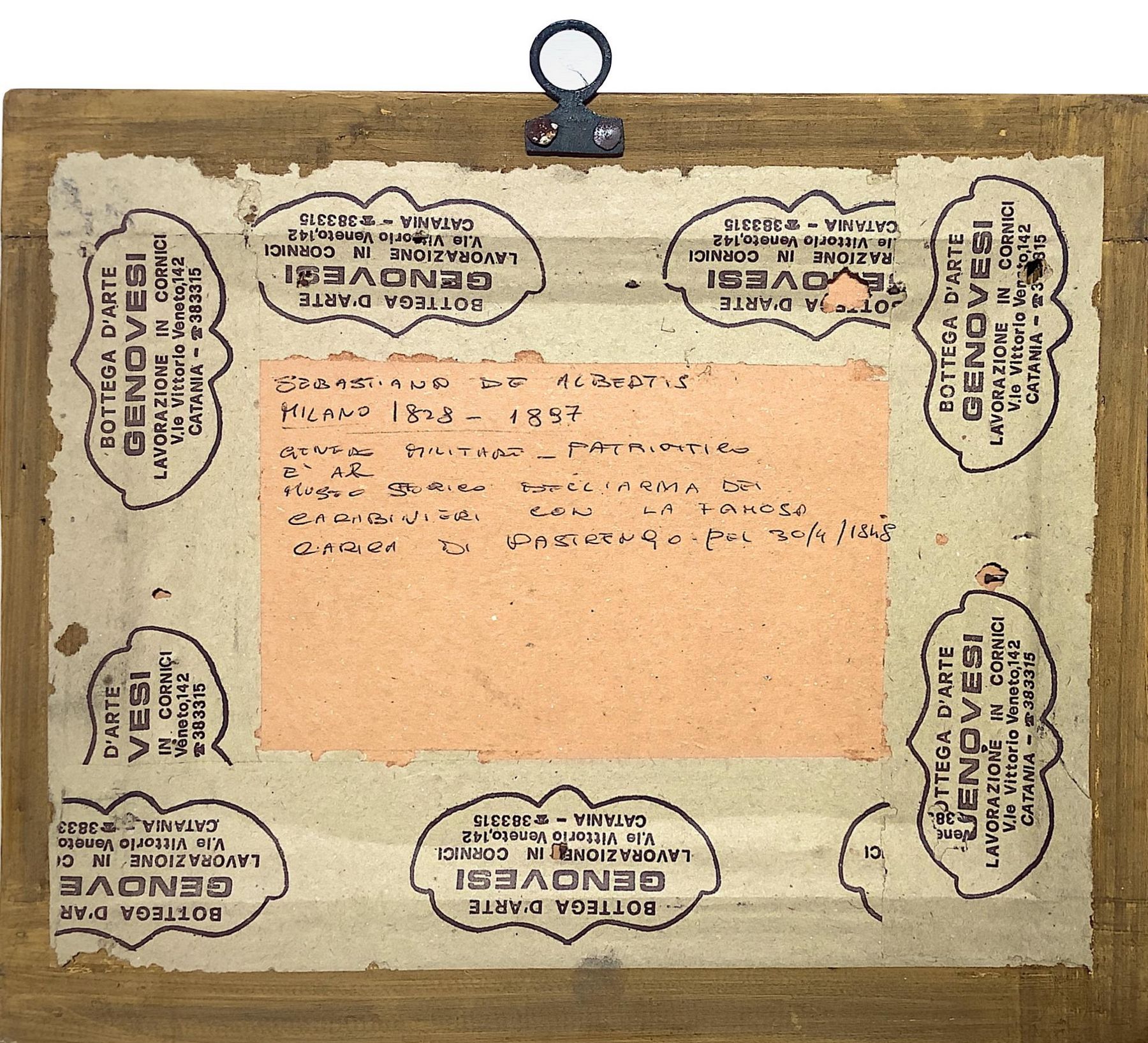 Acquarello su carta raffiguranti carabinieri a cavallo e personaggi. Firmato in basso a sinistra De Albertis Sebastiano (Milano, 1828 – Milano, 1897). Cm 6,5x12,5. In bella cornice in legno dorato 23x27.