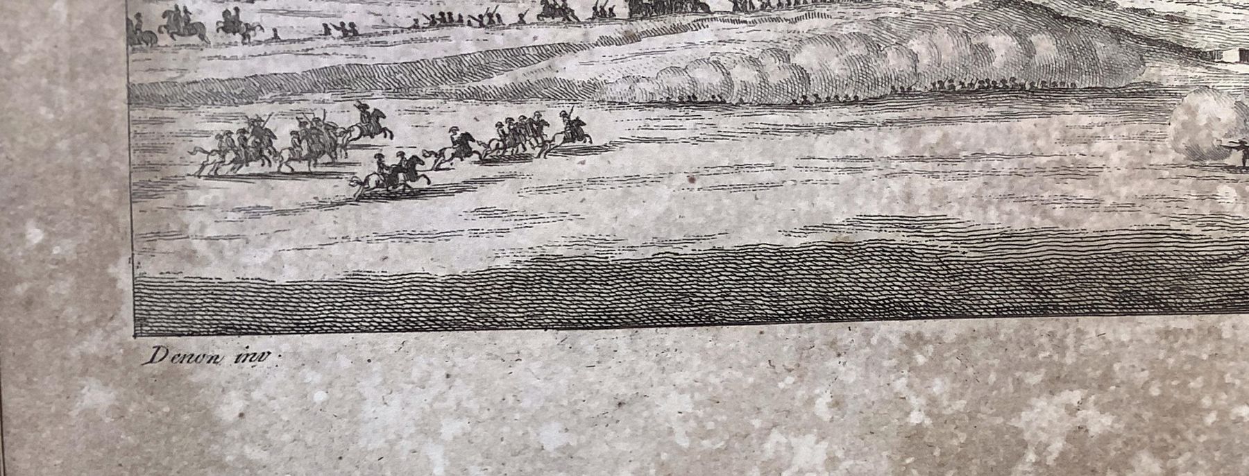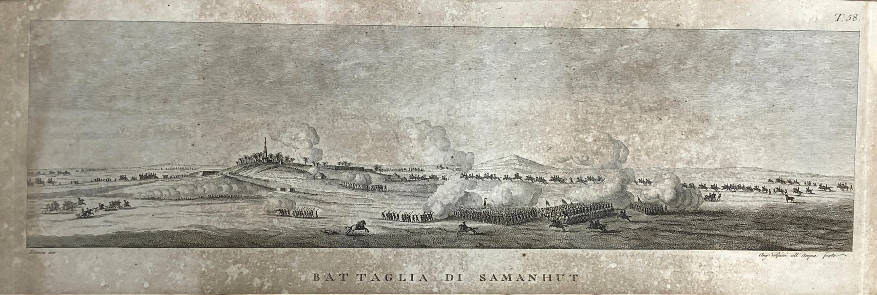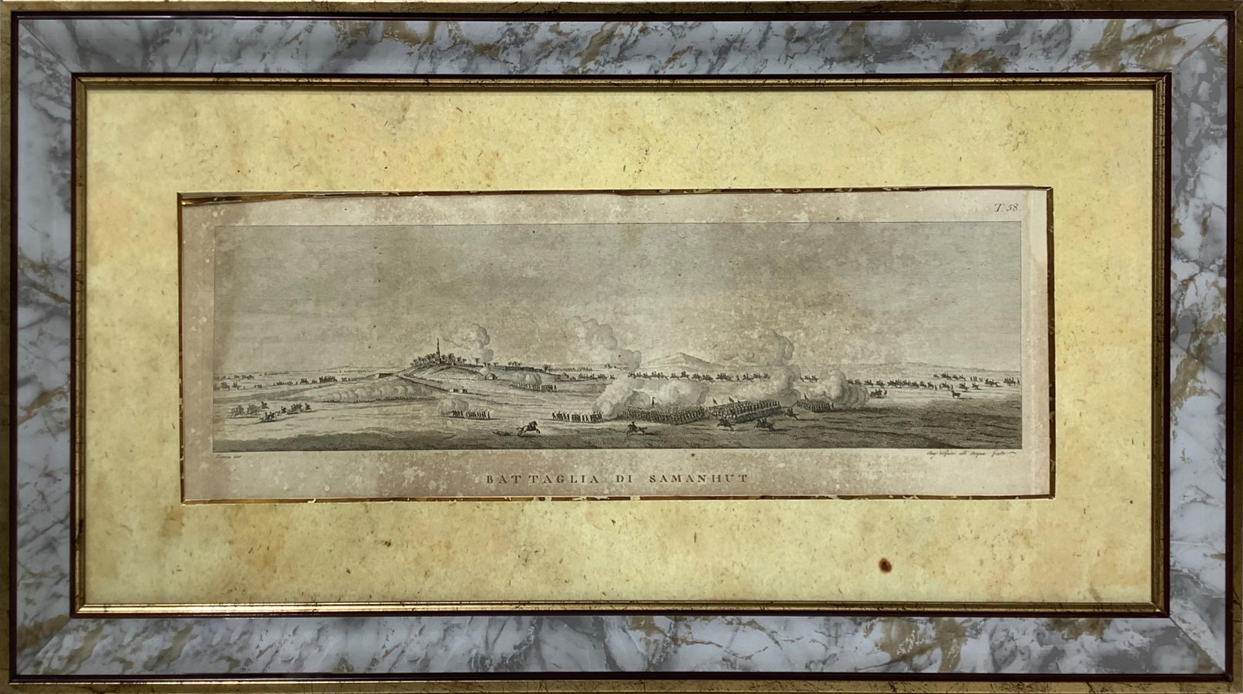 Incisione acquaforte in bella cornice in legno di noce tratte dal Viaggio nel basso ed alto Egitto. Illustrato dal. Denon. Firenze, Giuseppe Tofani edizioni, 1808, raffigurante la Tav:58 Battaglia di Samanhut.