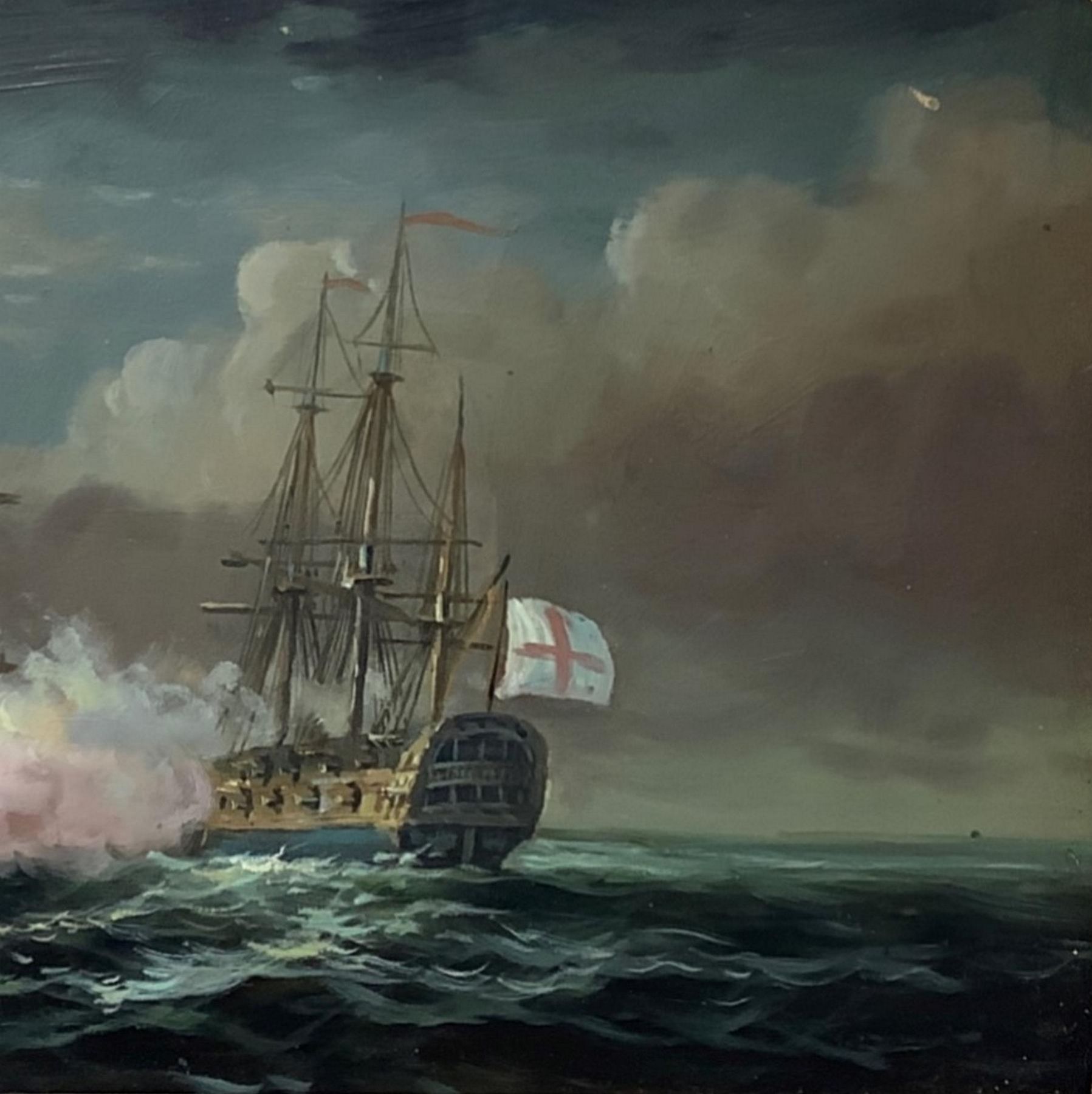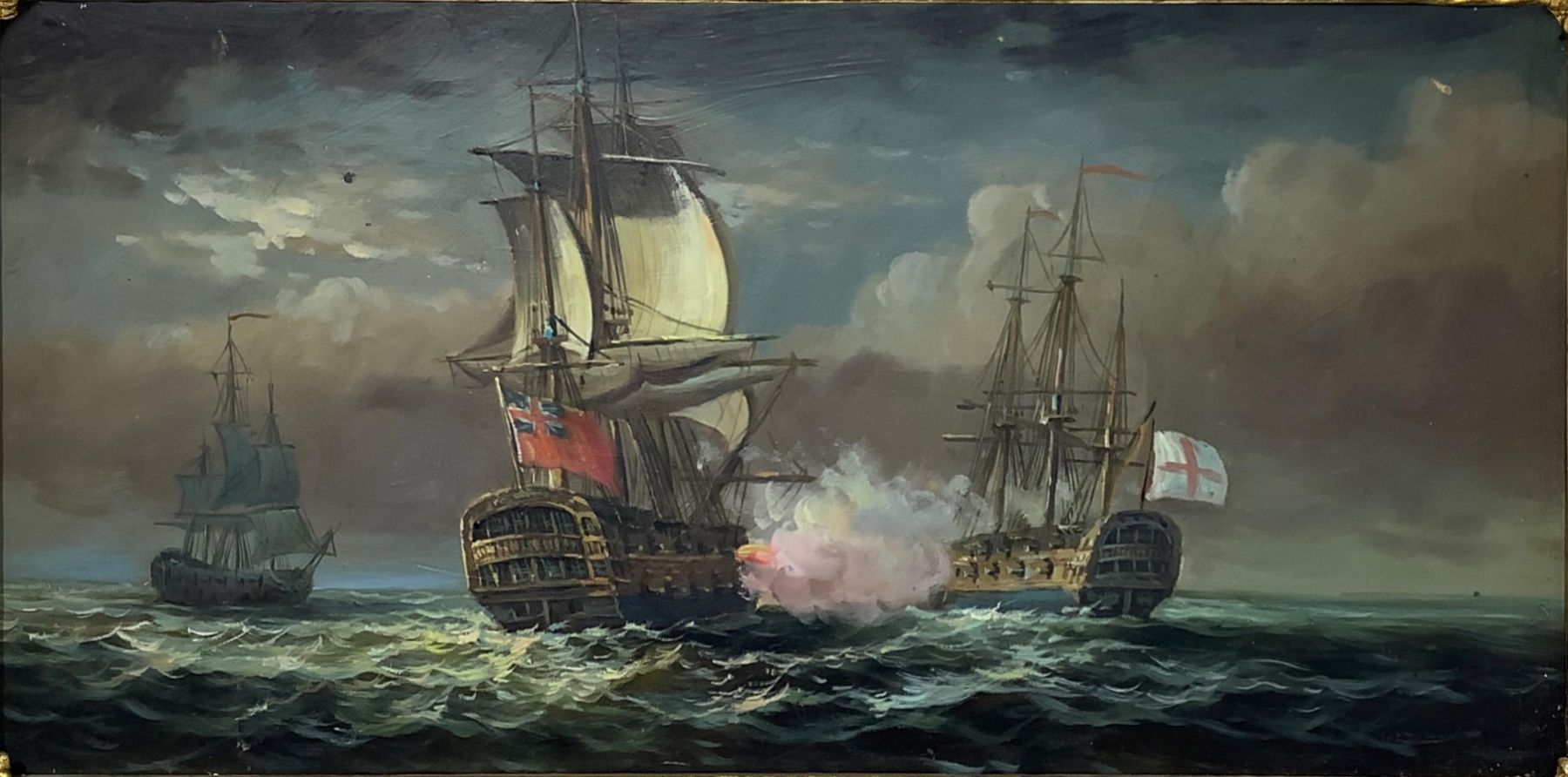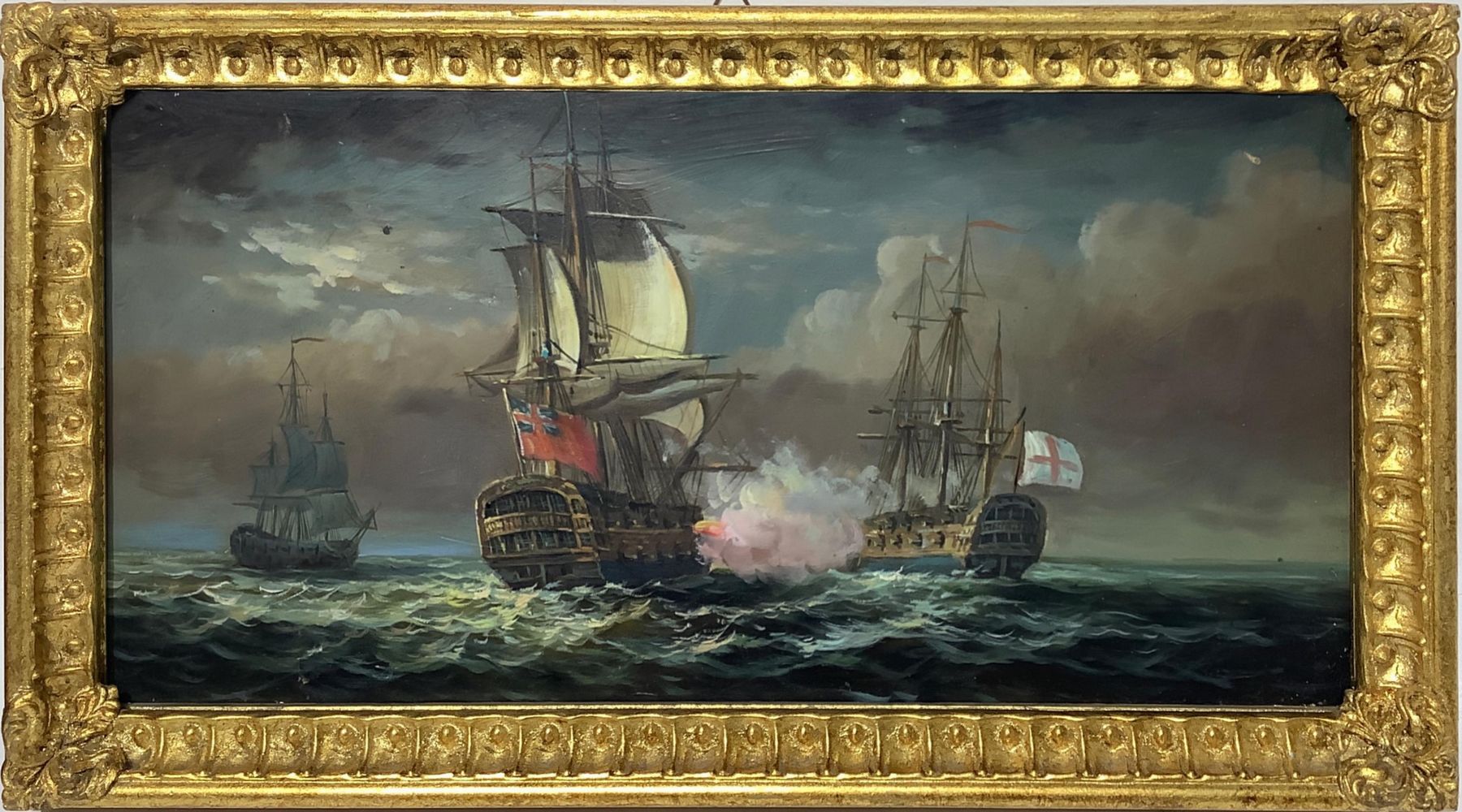Olio su tavola raffigurante velieri in mare, inizi XX secolo. Cm 20x40....