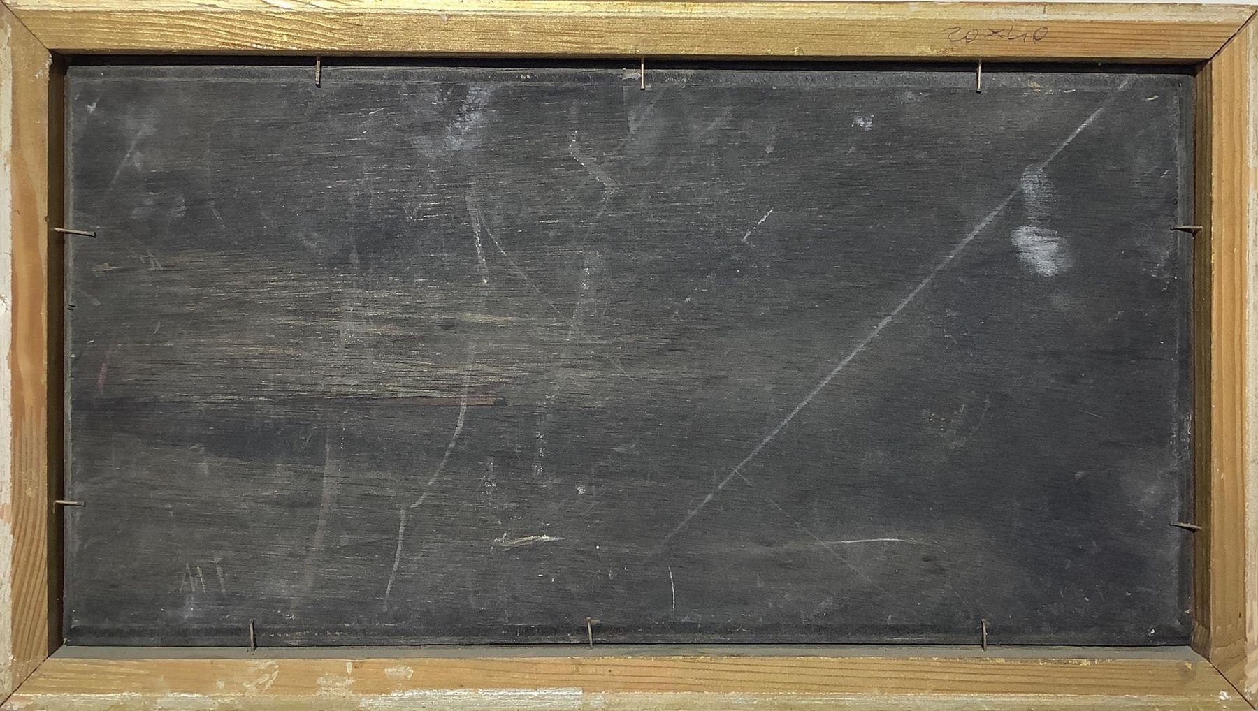 Olio su tavola raffigurante velieri in mare, inizi XX secolo. Cm 20x40. Cornice in legno dorato cm 24x44.