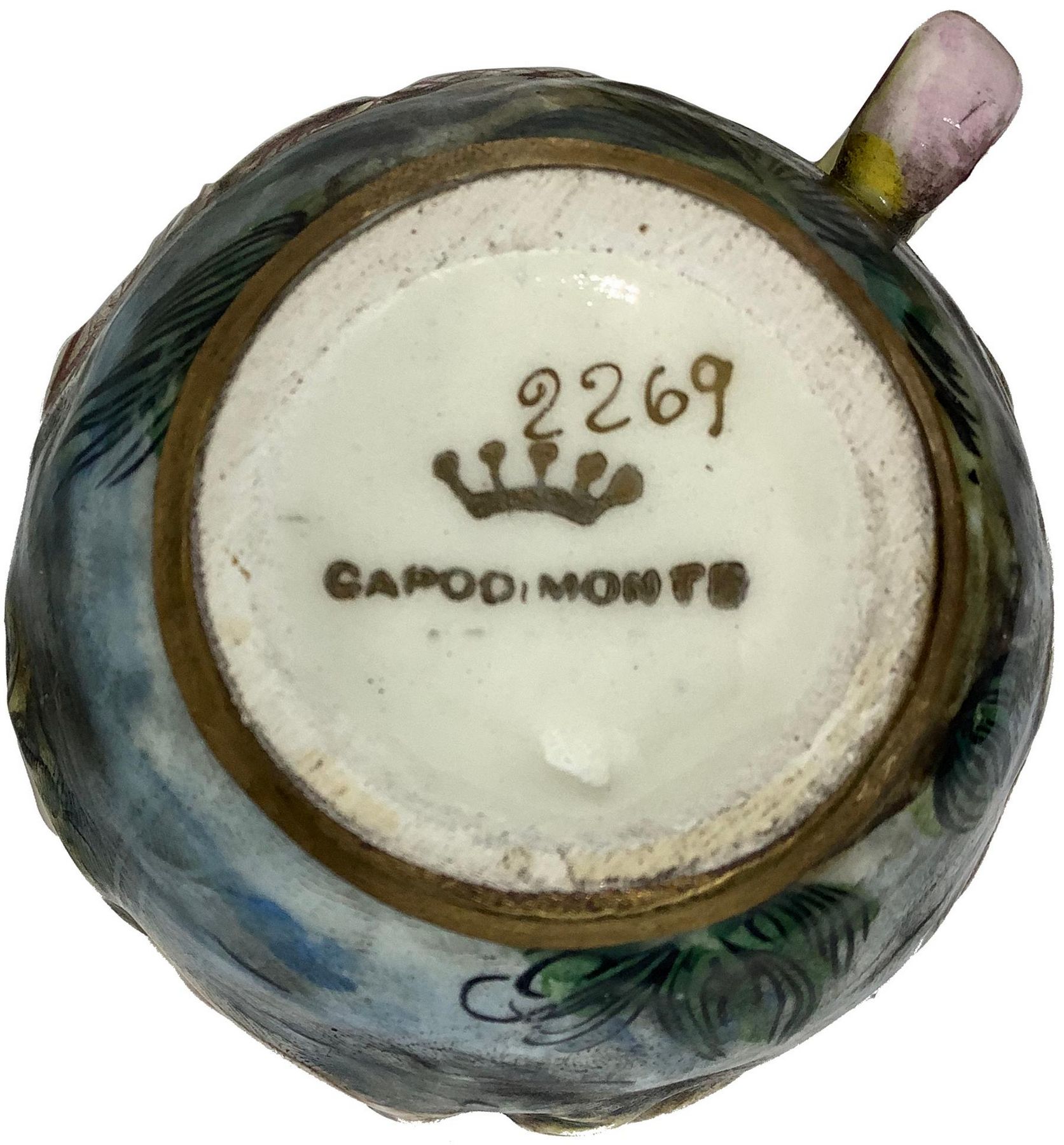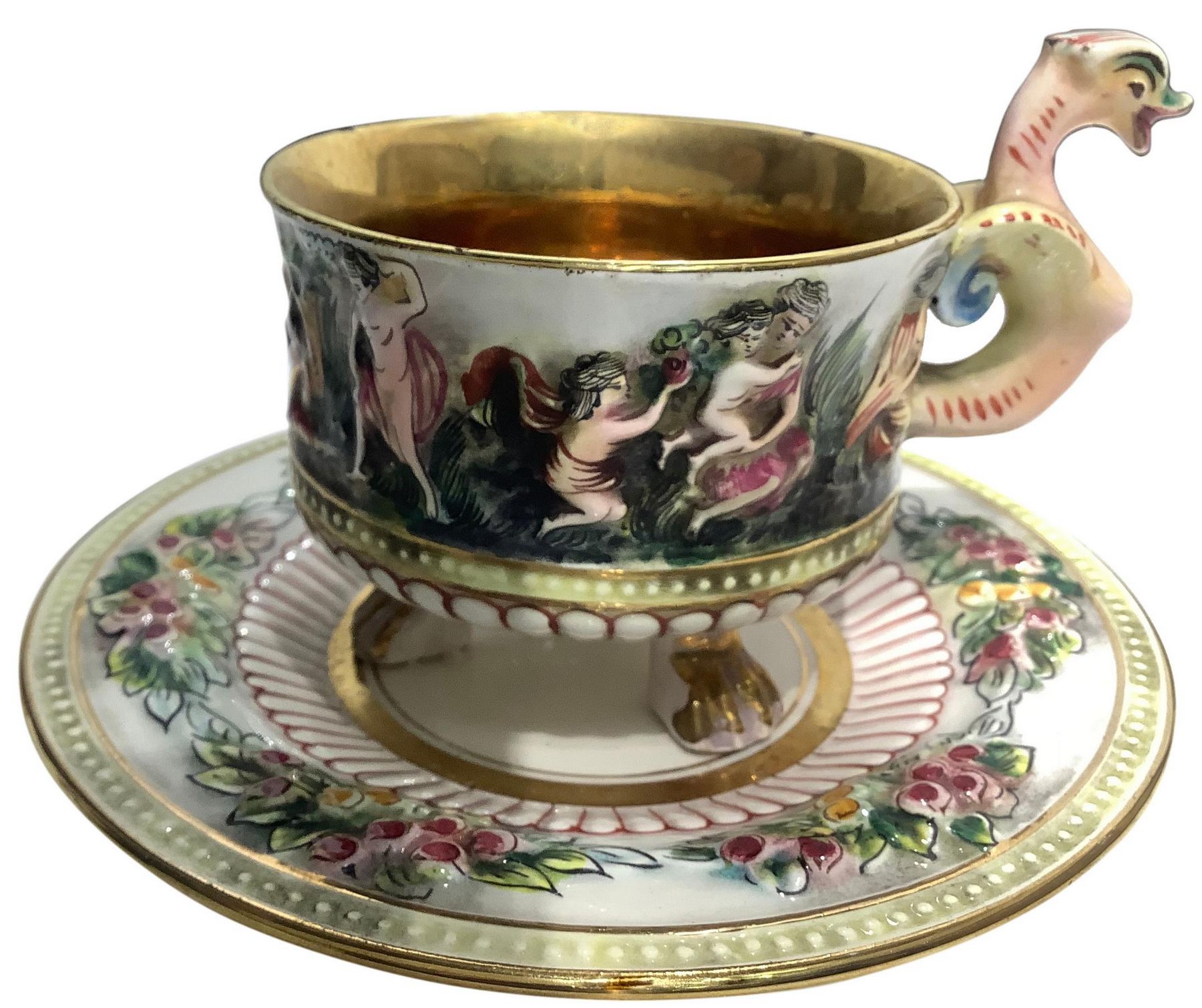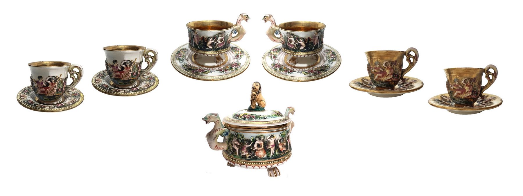 Servizio da te e caffè in porcellana, marchio Capodimonte 2226. Composto da zuccheriera (H cm14x15), 2 tazze da te (H cm 7, diam. cm 8), 2 tazze da caffè (H cm 6, diam. cm 7), 2 tazze da caffè (H cm 6,5, diam. cm 7). Decorazione con figure in altorilievo e scene di genere.