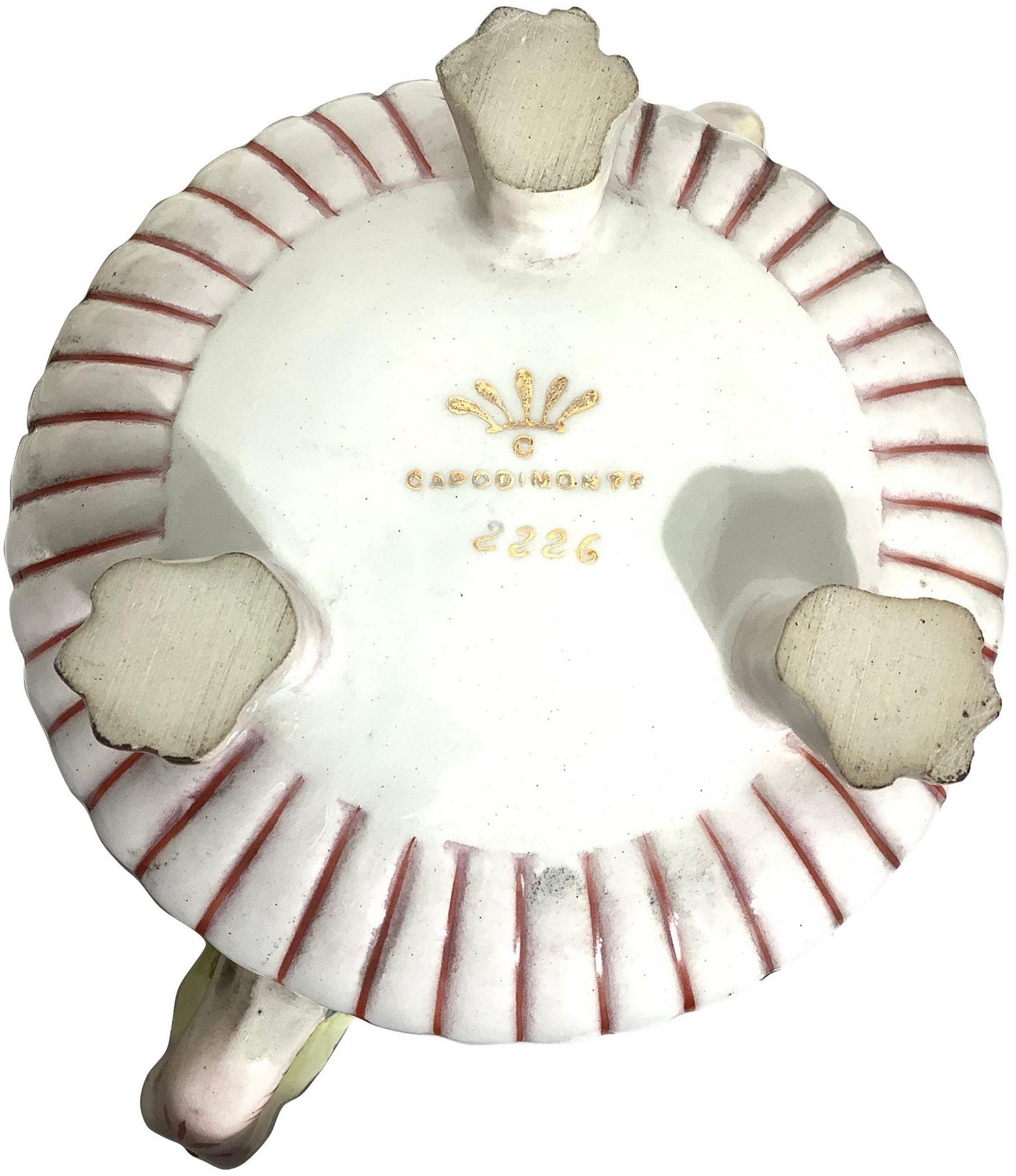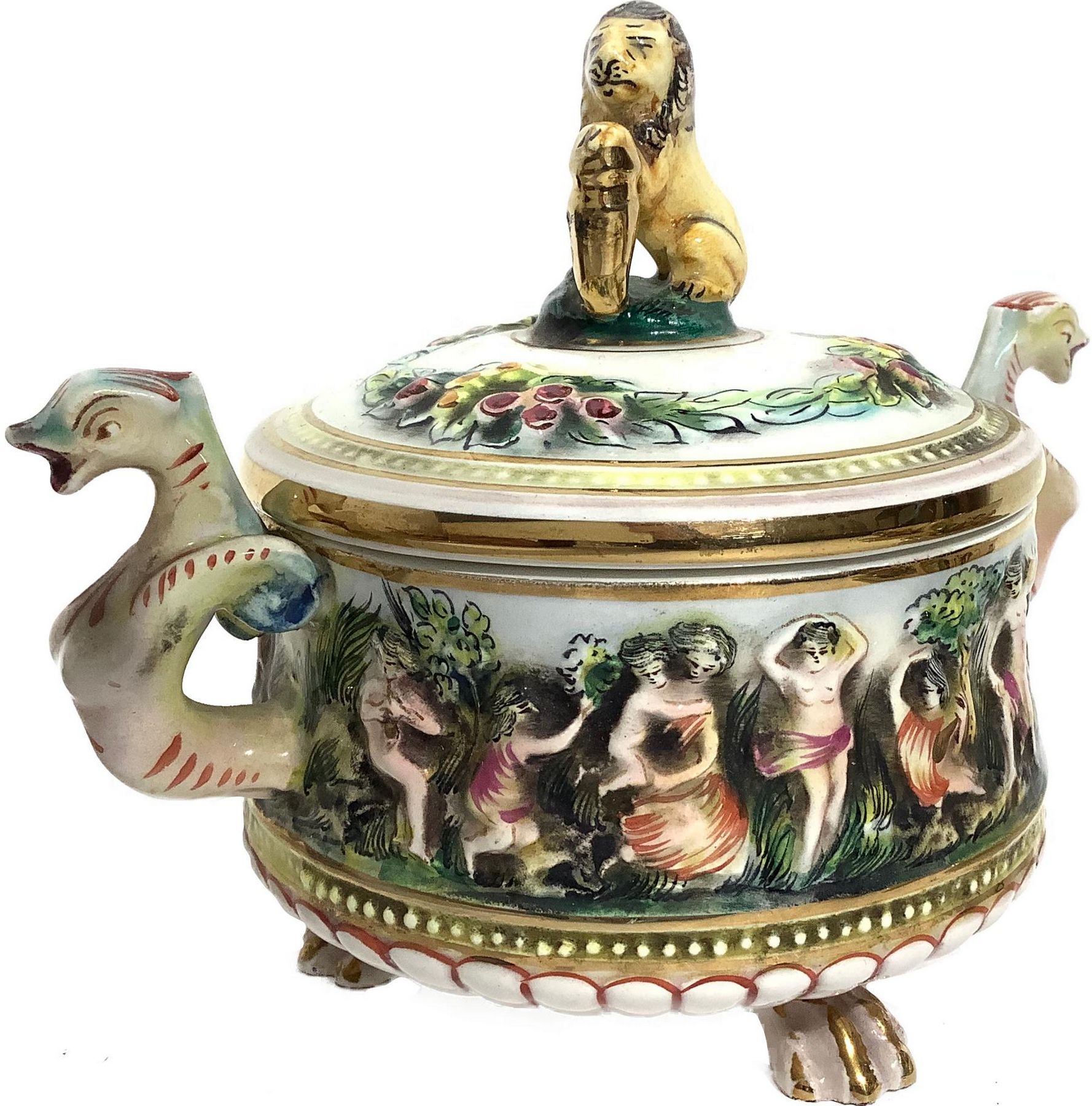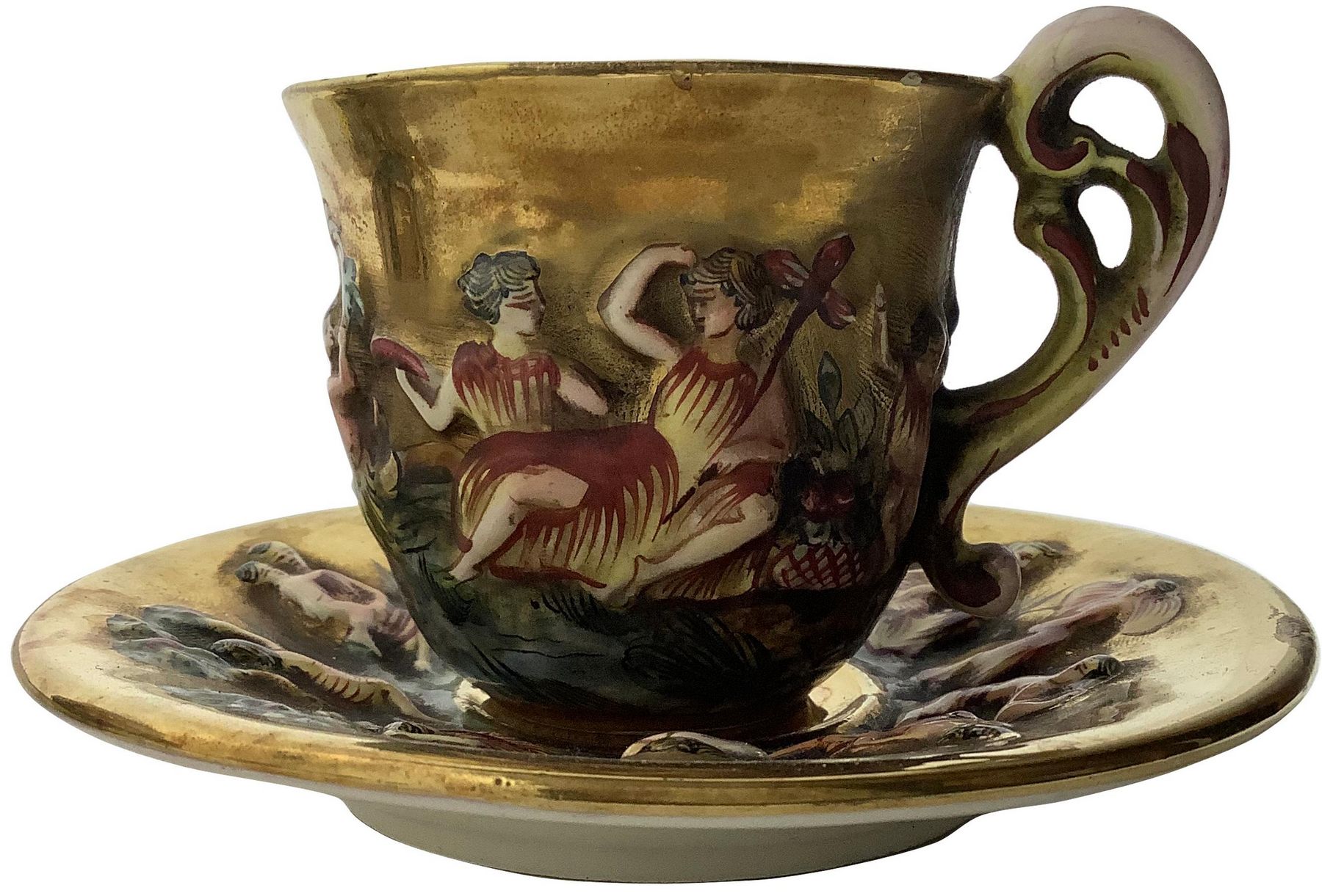 Servizio da te e caffè in porcellana, marchio Capodimonte 2226. Composto da zuccheriera (H cm14x15), 2 tazze da te (H cm 7, diam. cm 8), 2 tazze da caffè (H cm 6, diam. cm 7), 2 tazze da caffè (H cm 6,5, diam. cm 7). Decorazione con figure in altorilievo e scene di genere.