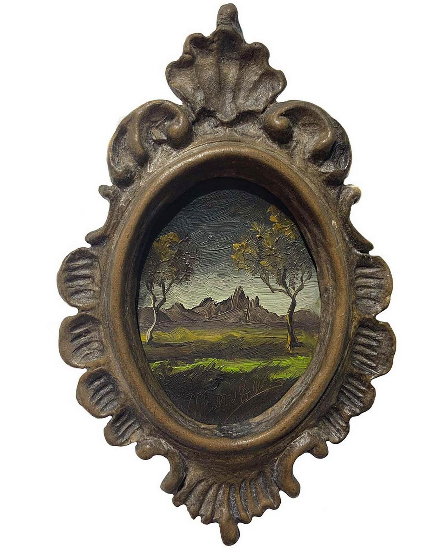 Gruppo di cinque miniature ovali. Personaggi cm 7, paesaggio cm 7, natura...