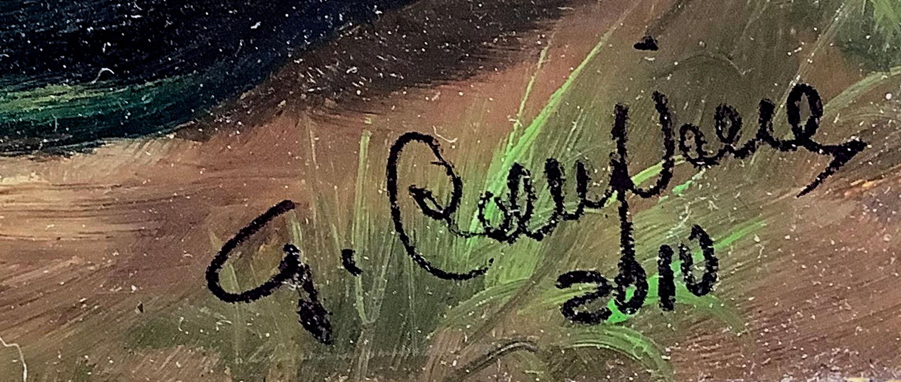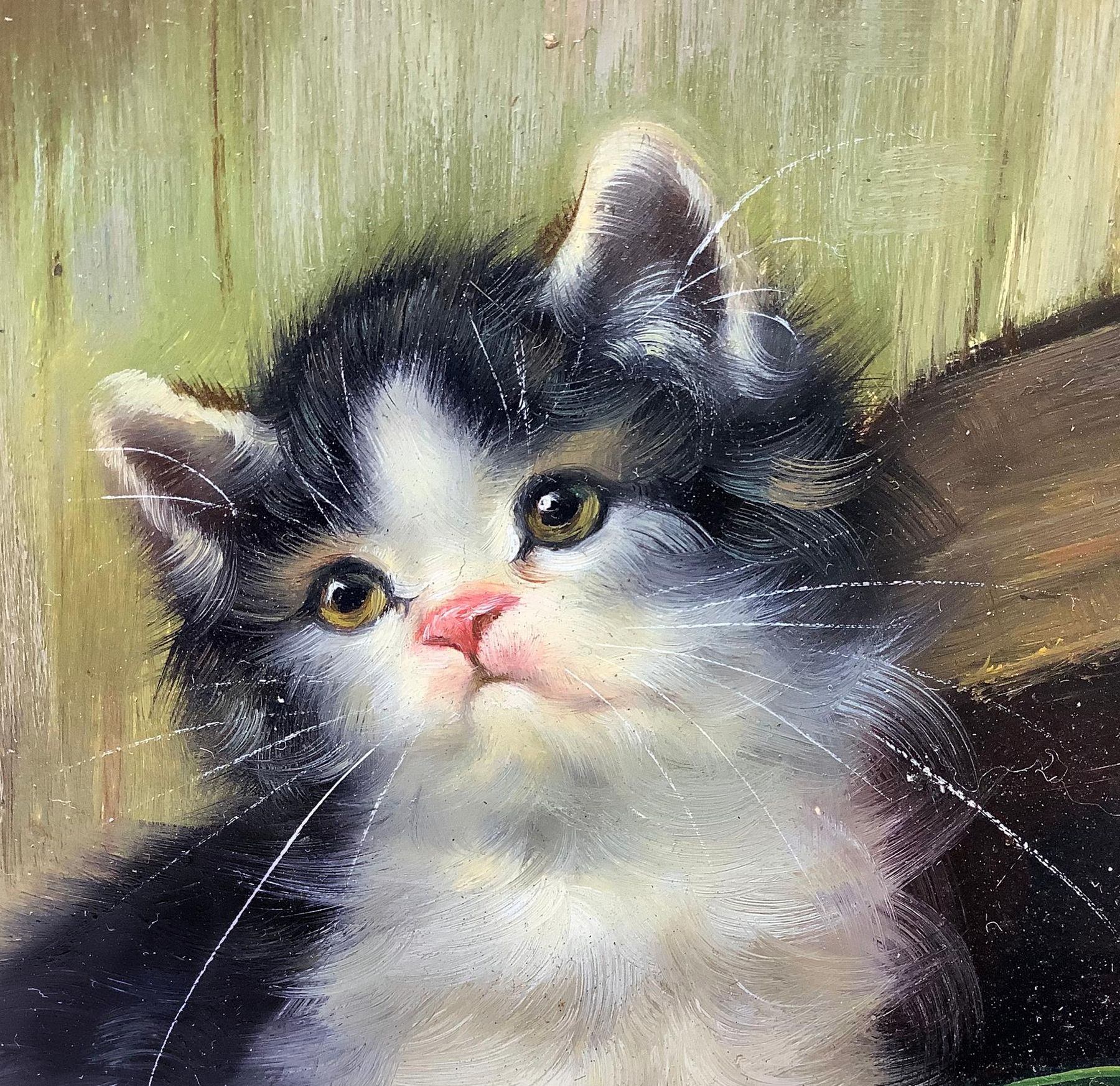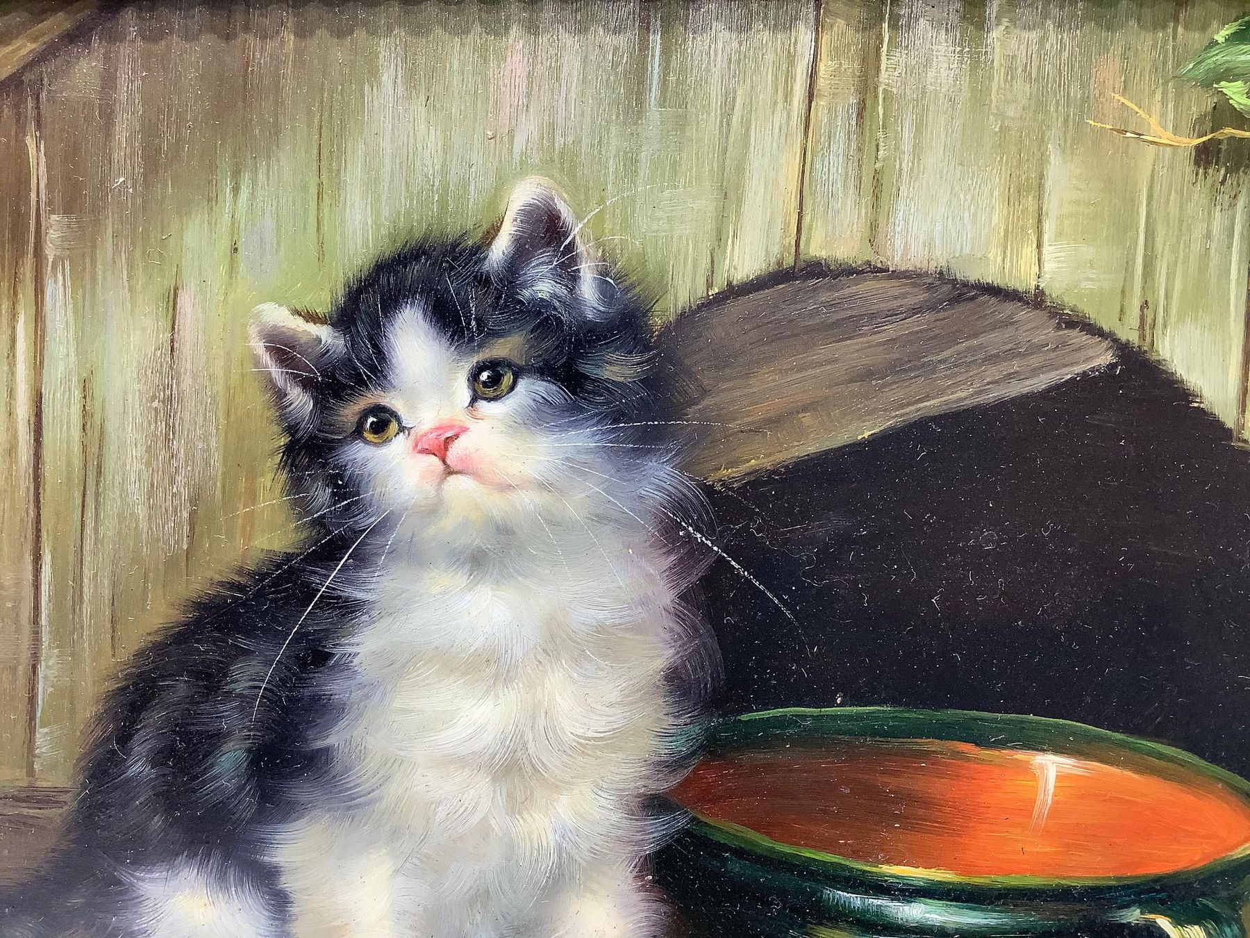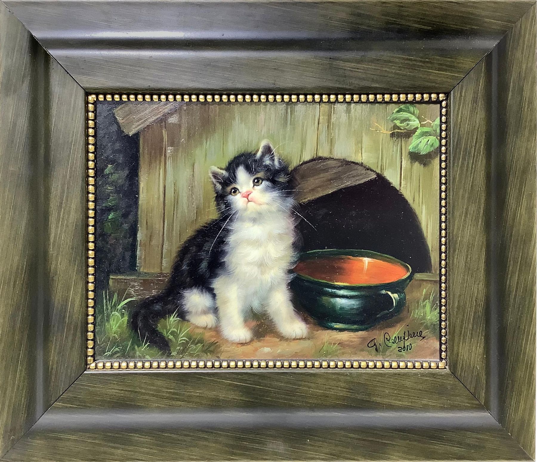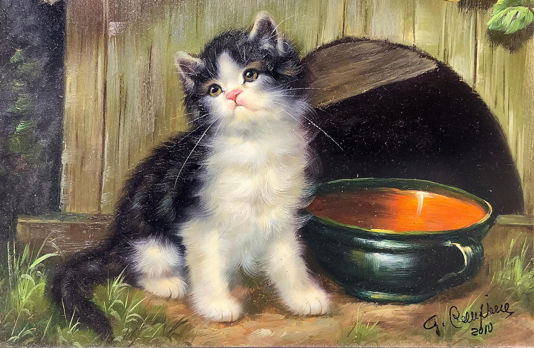 Olio su tela raffigurante gatto con ciotola. Firmato Campione 2010. Cm...