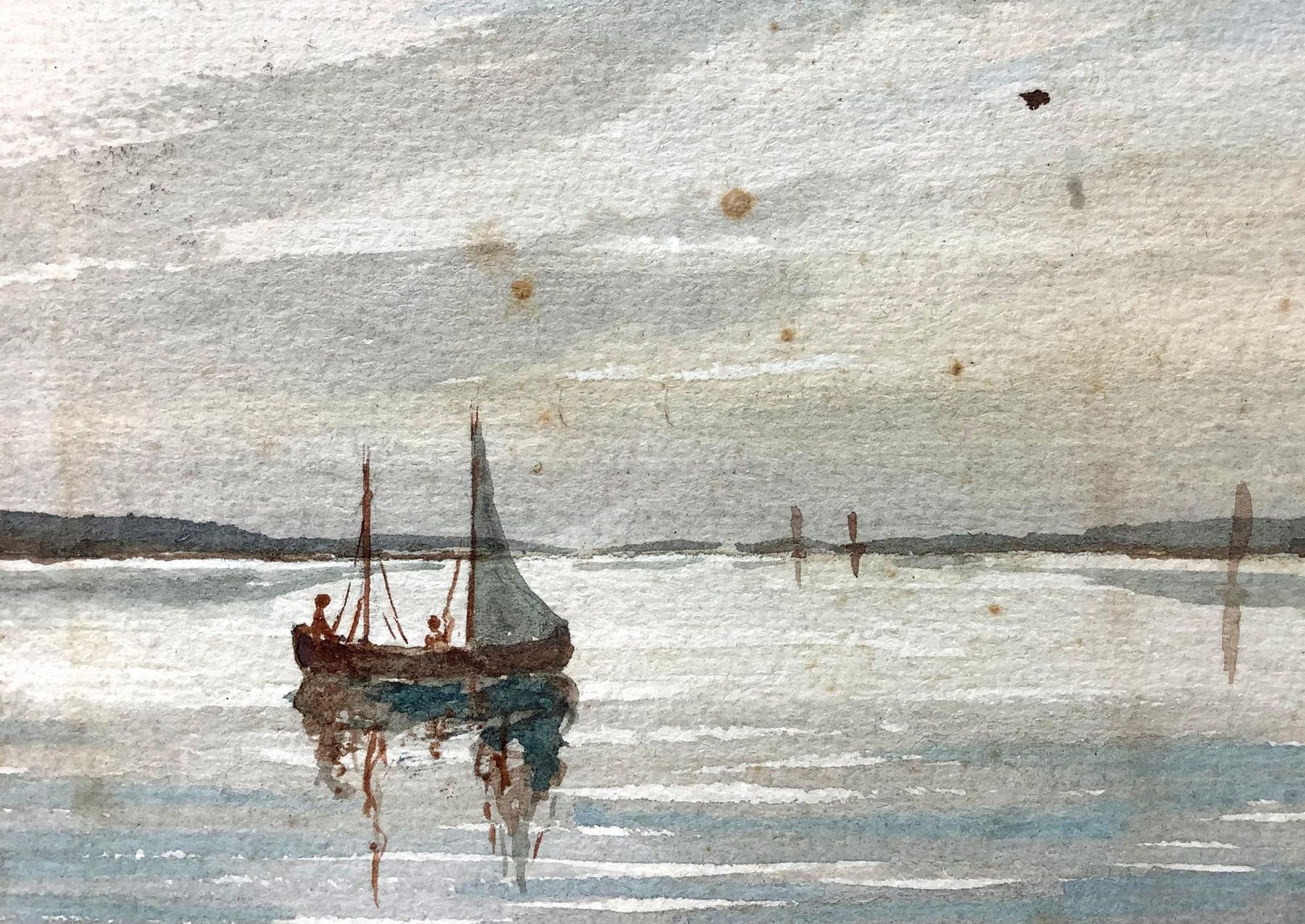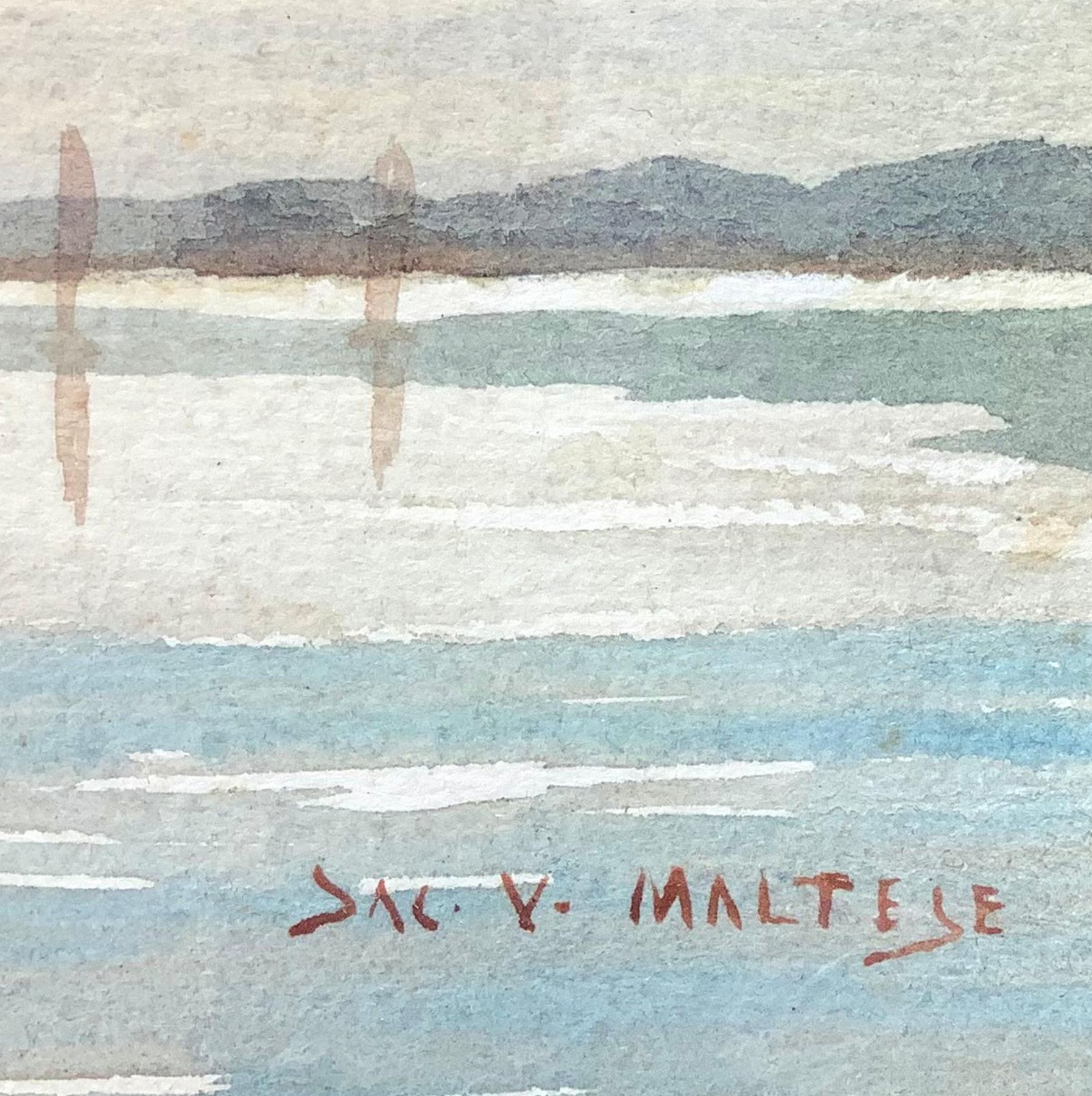 Acquarello raffigurante marina con barche, XX secolo. Cm 10x15, in cornice cm 23x28. Firmato Sac. V. Maltese.