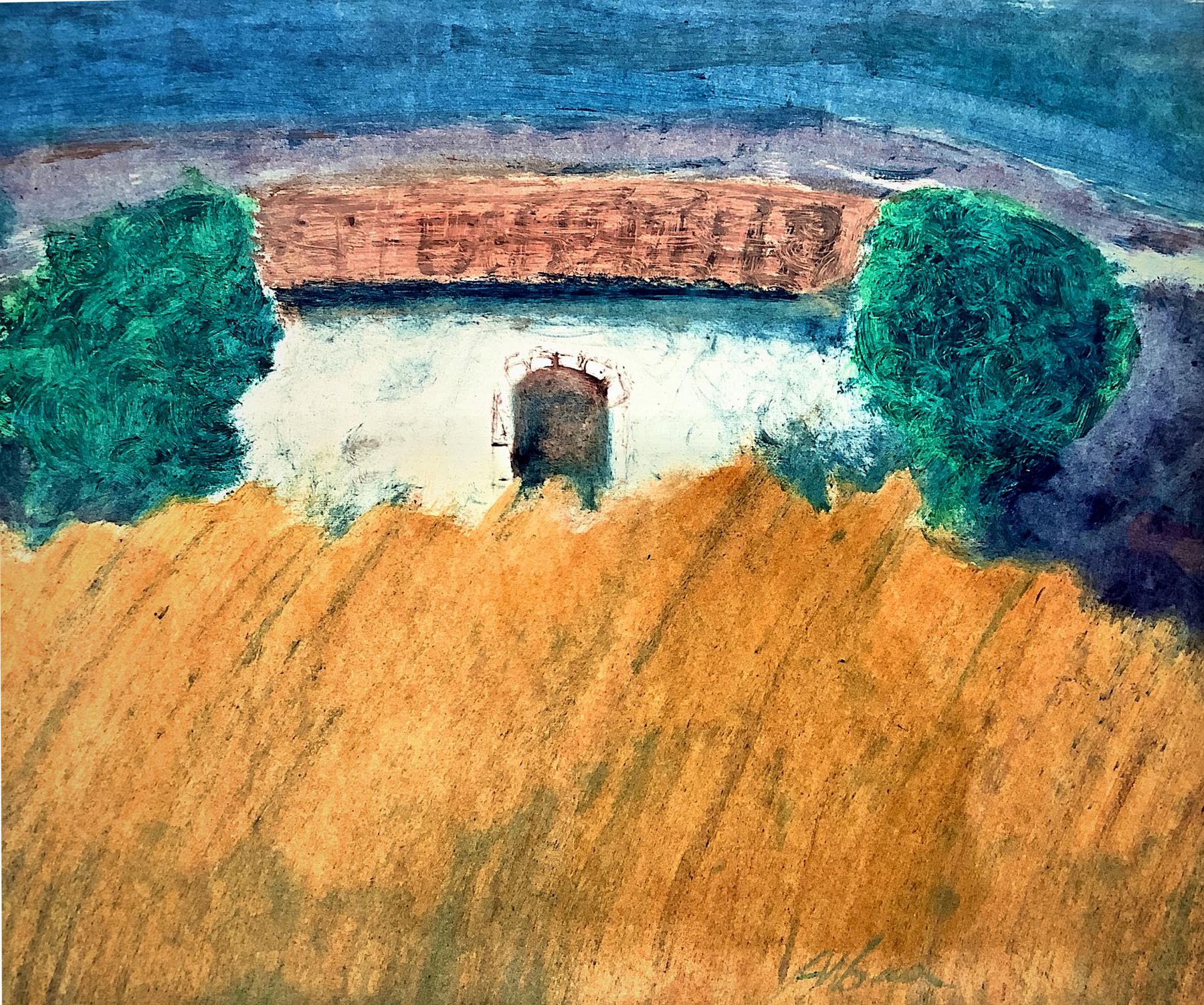 Pastello su cartoncino raffigurante paesaggio con case e alberi. Firmato...