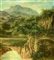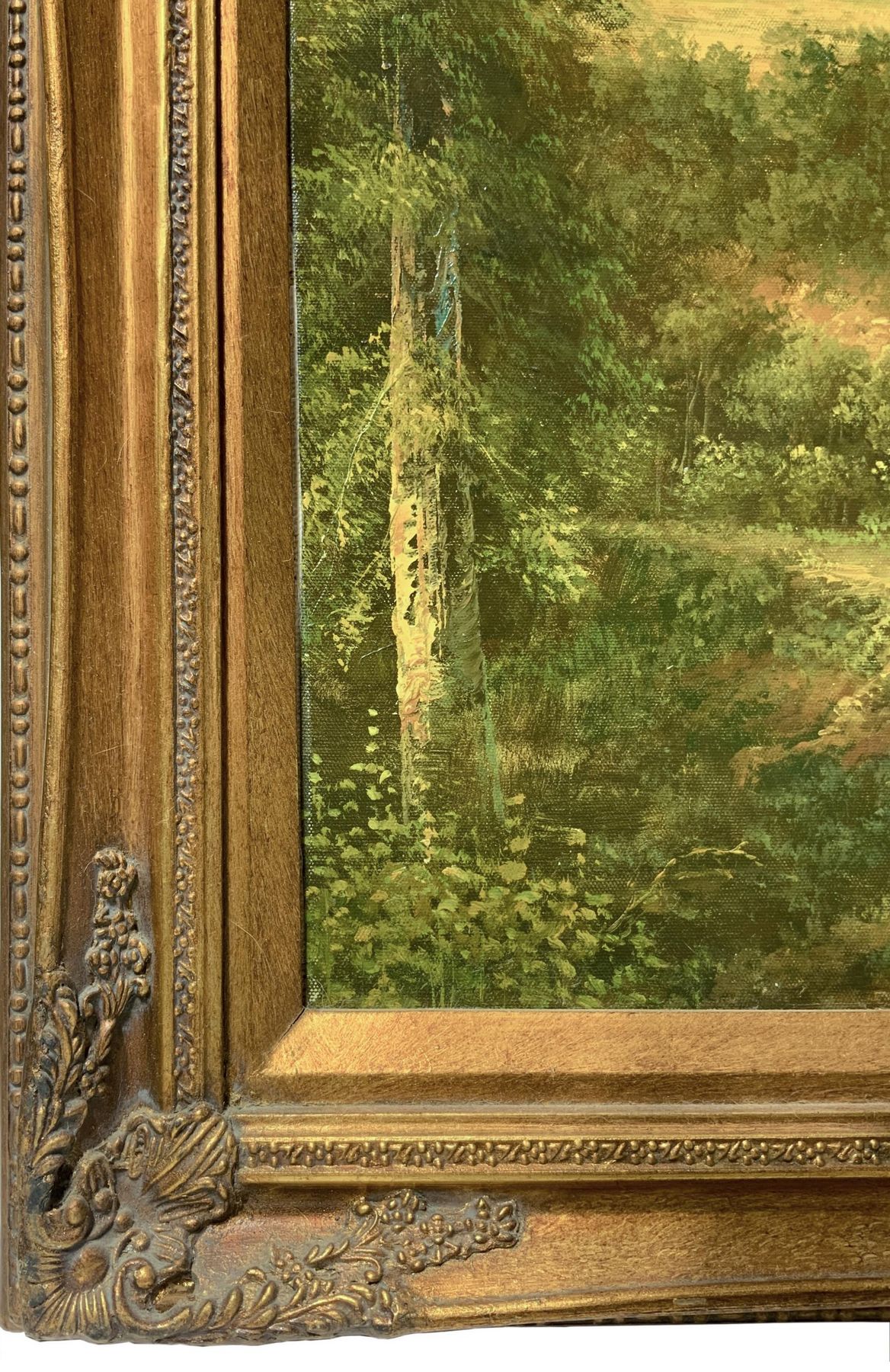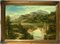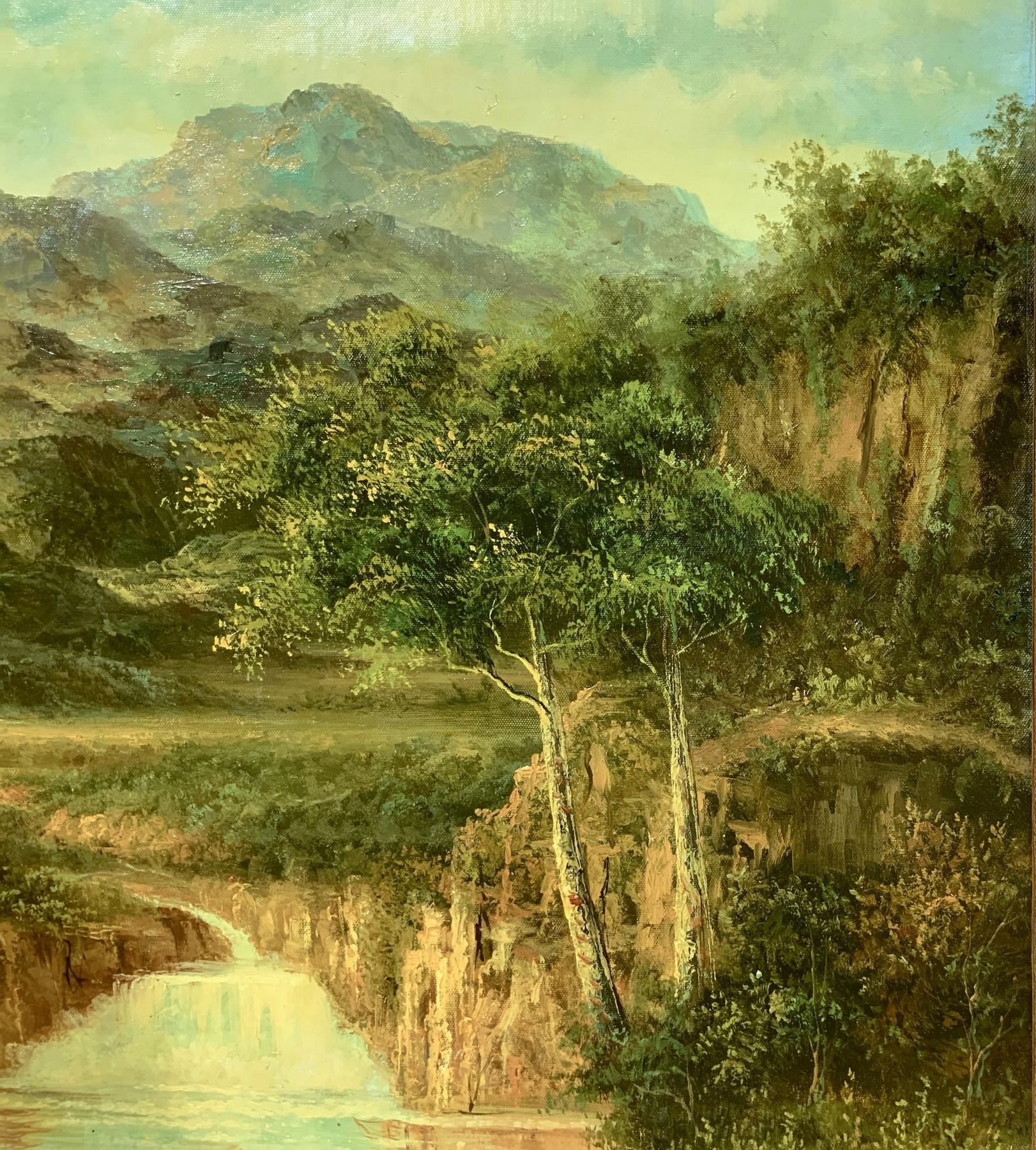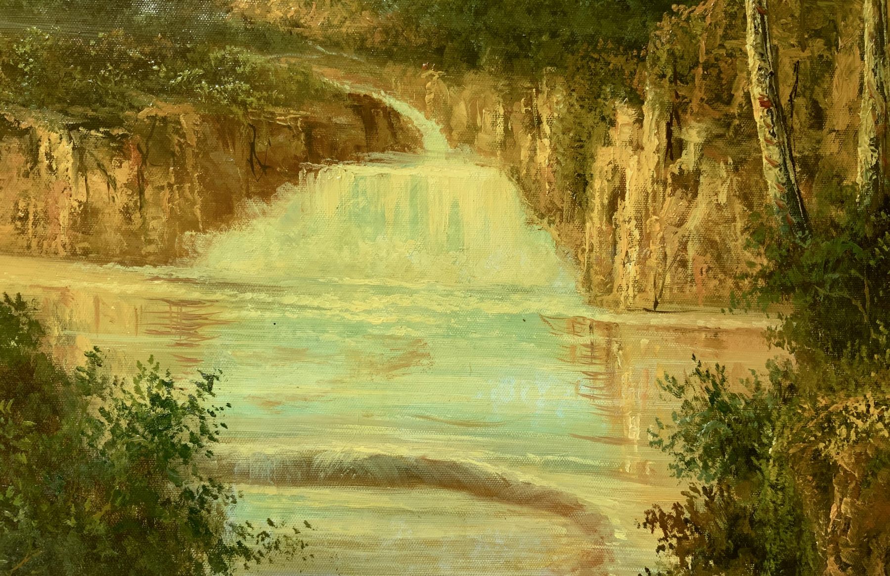 Dipinto ad olio su tela raffigurante paesaggio con lago e cascata, XX...