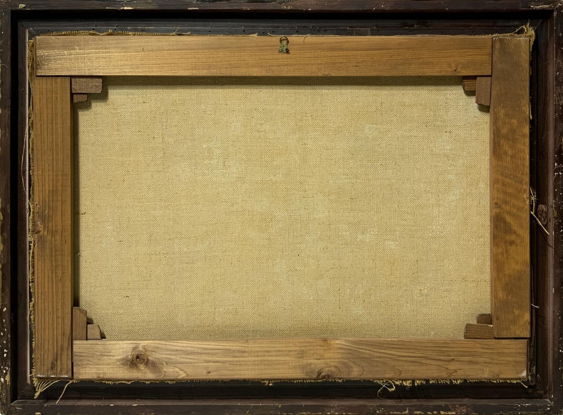 Dipinto ad olio su tela raffigurante paesaggio con lago e cascata, XX secolo.Cm 90x60, in cornice cm 115x75
