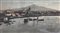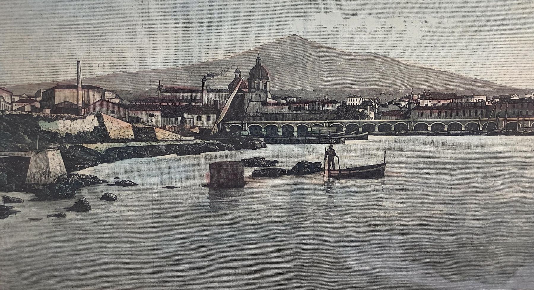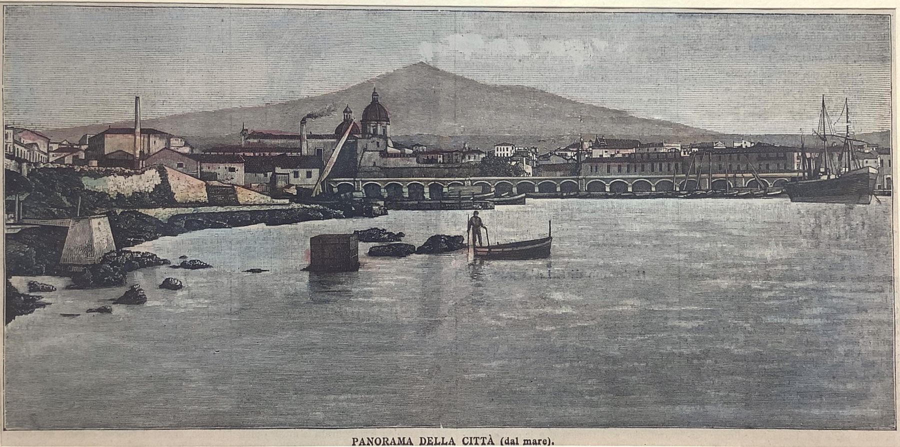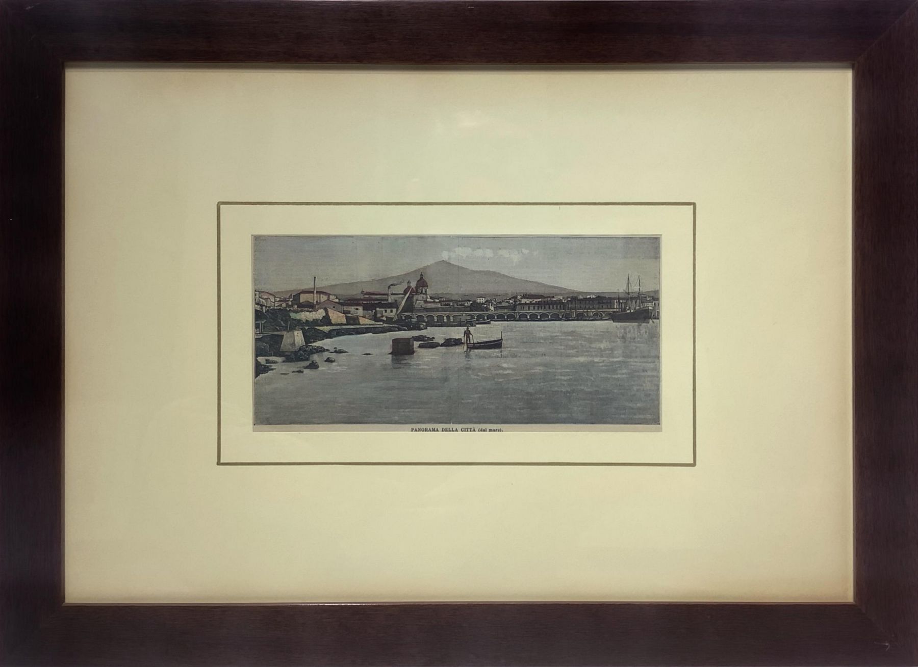 Incisione ad acquaforte colorata tratta da Le cento città d’Italia 1998 raffigurante il panorama del porto di Catania, cm 12,5x25 in cornice color noce piatta cm 42x 57