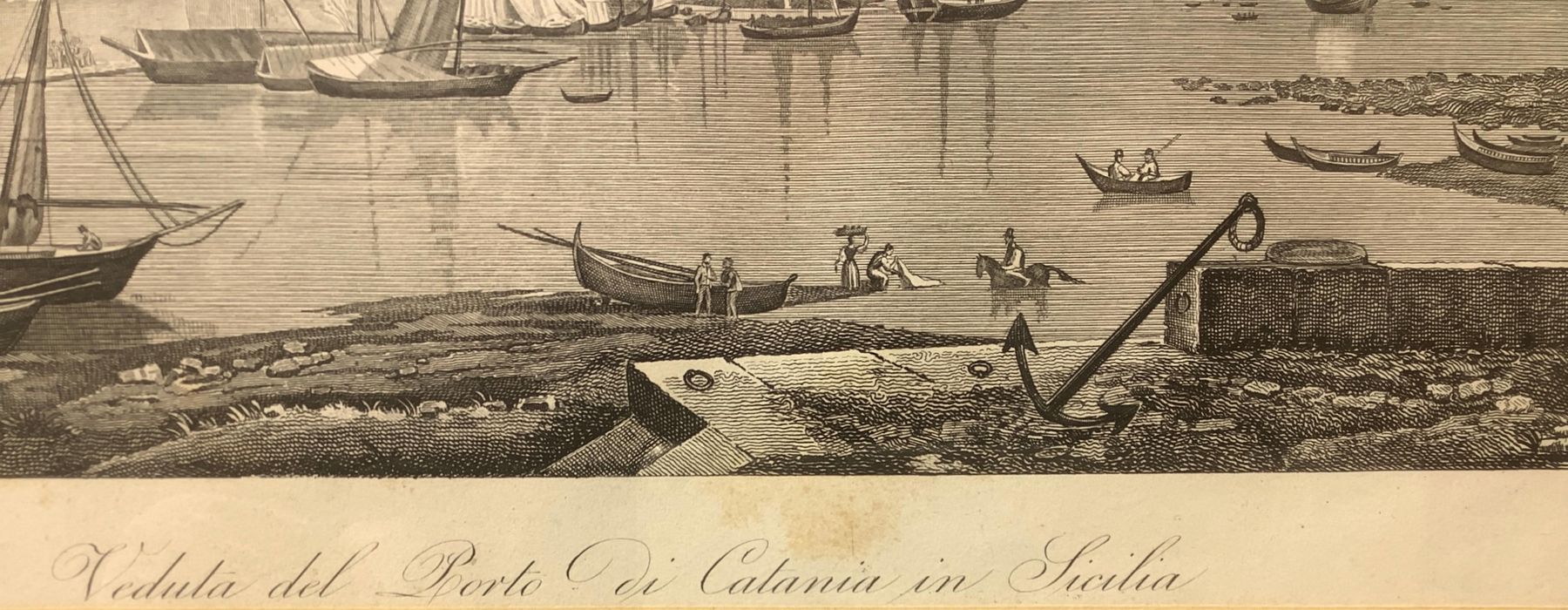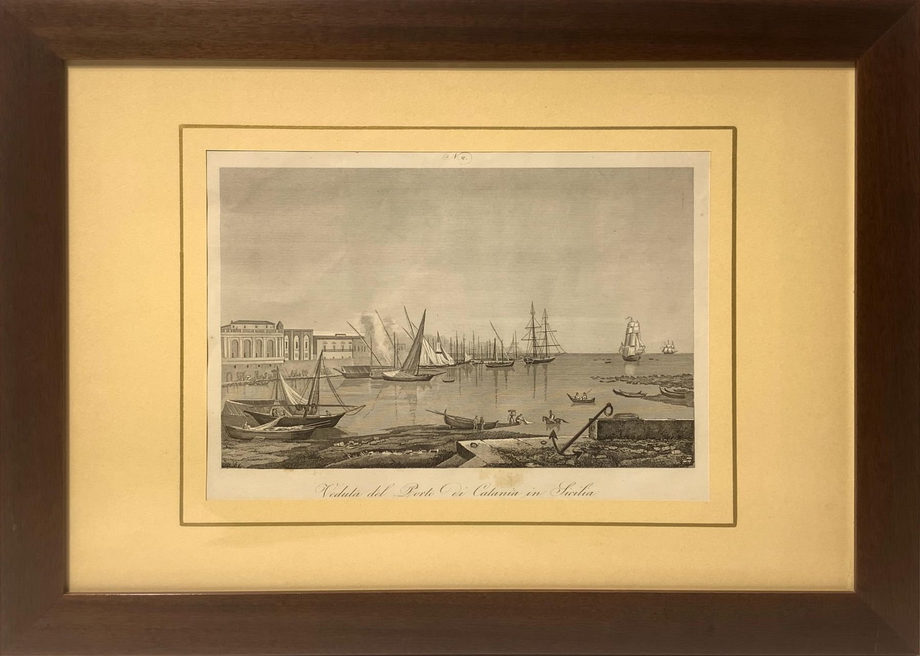 Incisione raffigurante vista del porto di Catania, metà XIX secolo, cm 22x31 in cornice color noce piatta cm 42x57