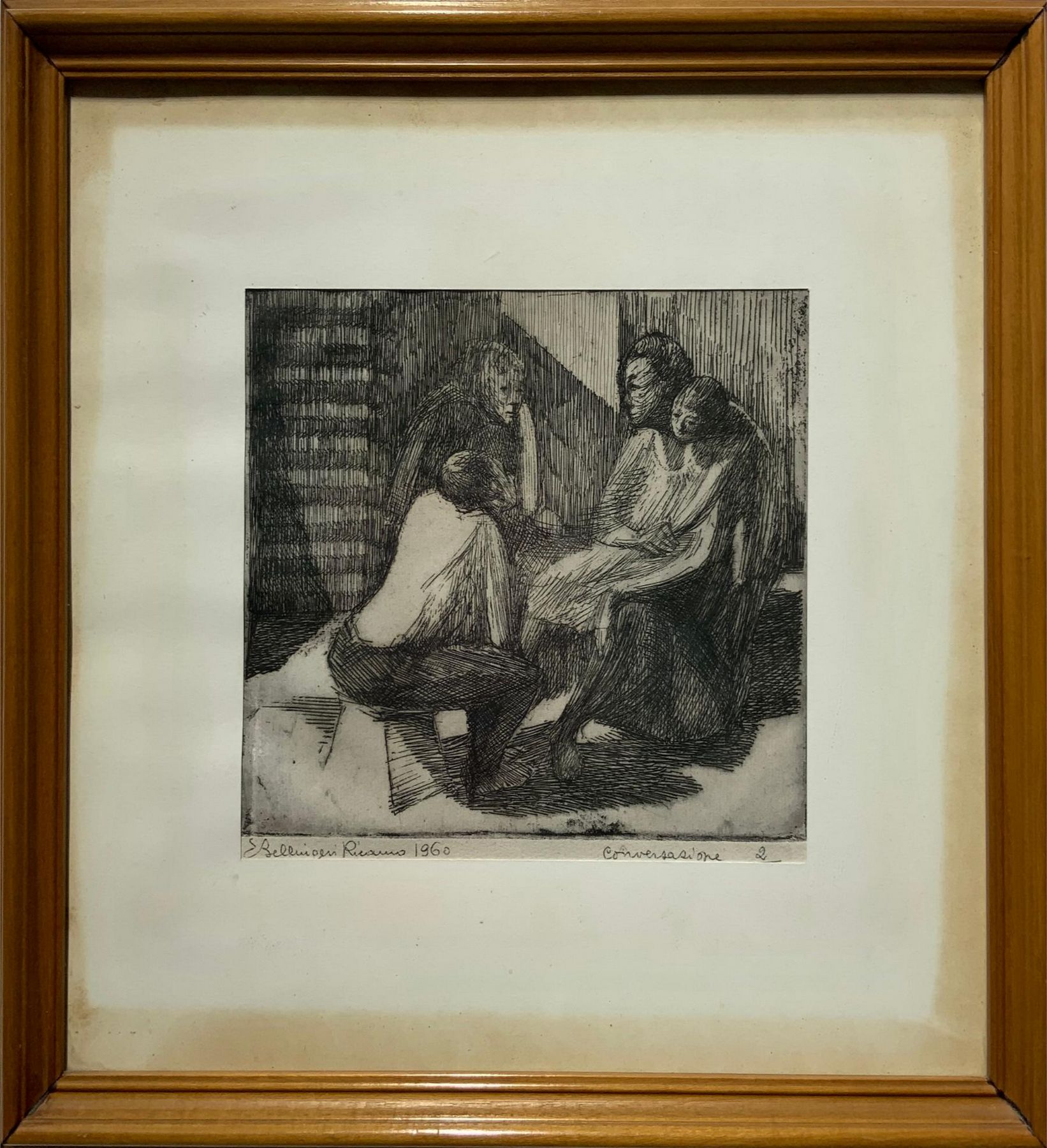 Incisione raffigurante “Conversazione” 2/50. Firmata E. Bellingeri Ricamo 1960. Cm 18x15,5 con cornice cm 31x34.